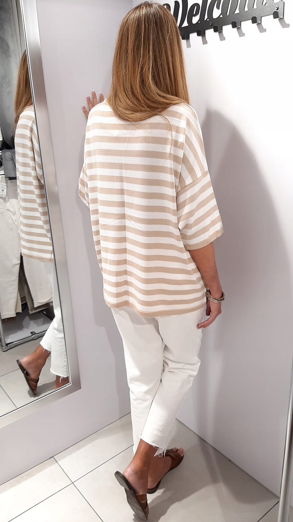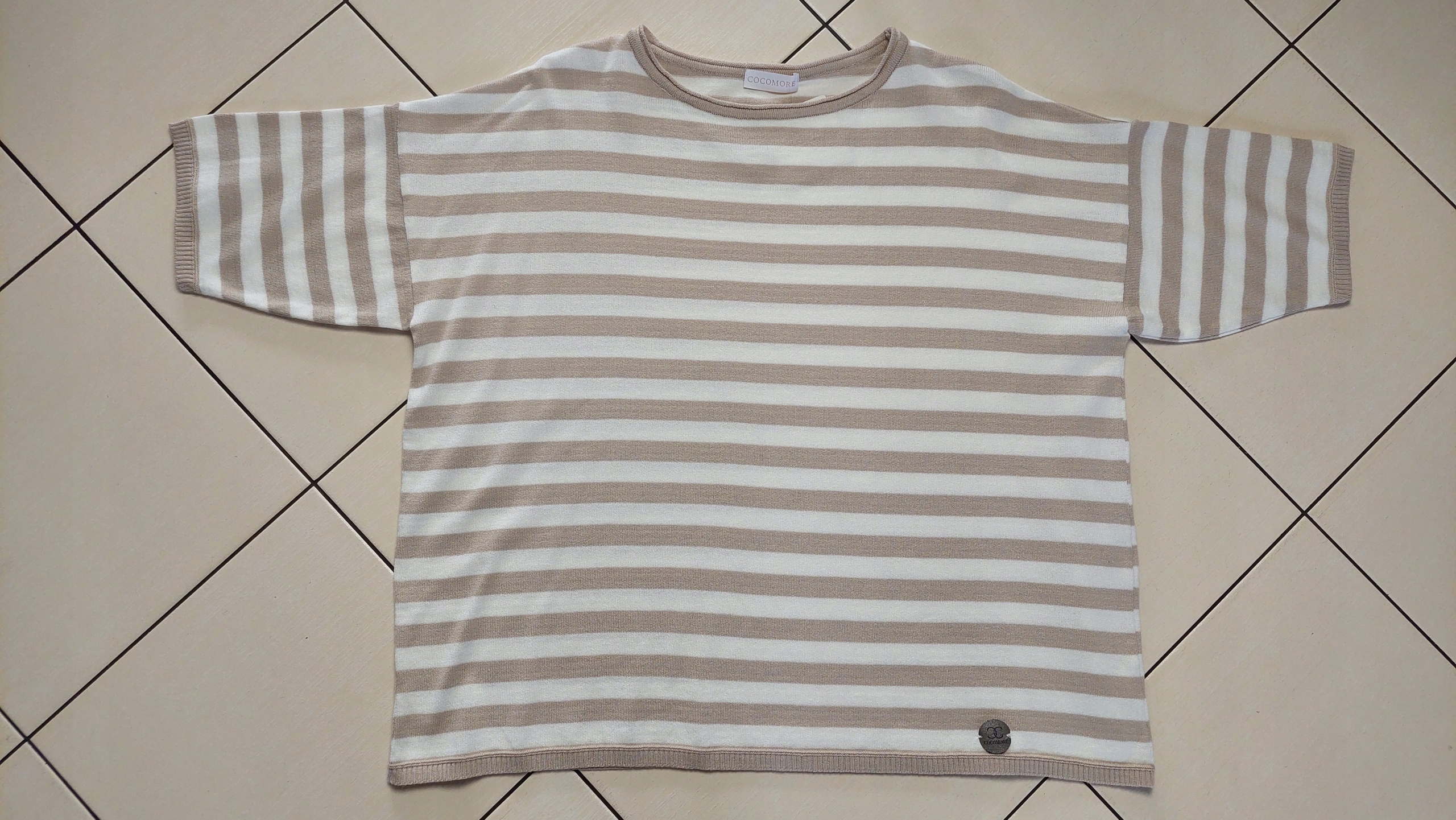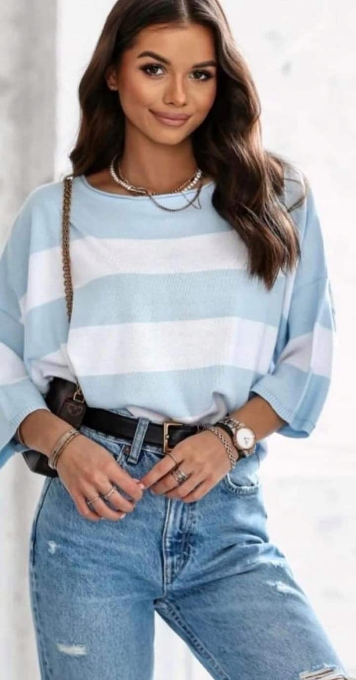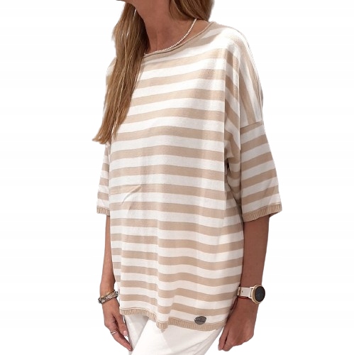 • Luźna sweterkowa bluzka w paski. Rękawy 3/4 zakończone ściągaczem. Na przodzie nowe logo naszywka
