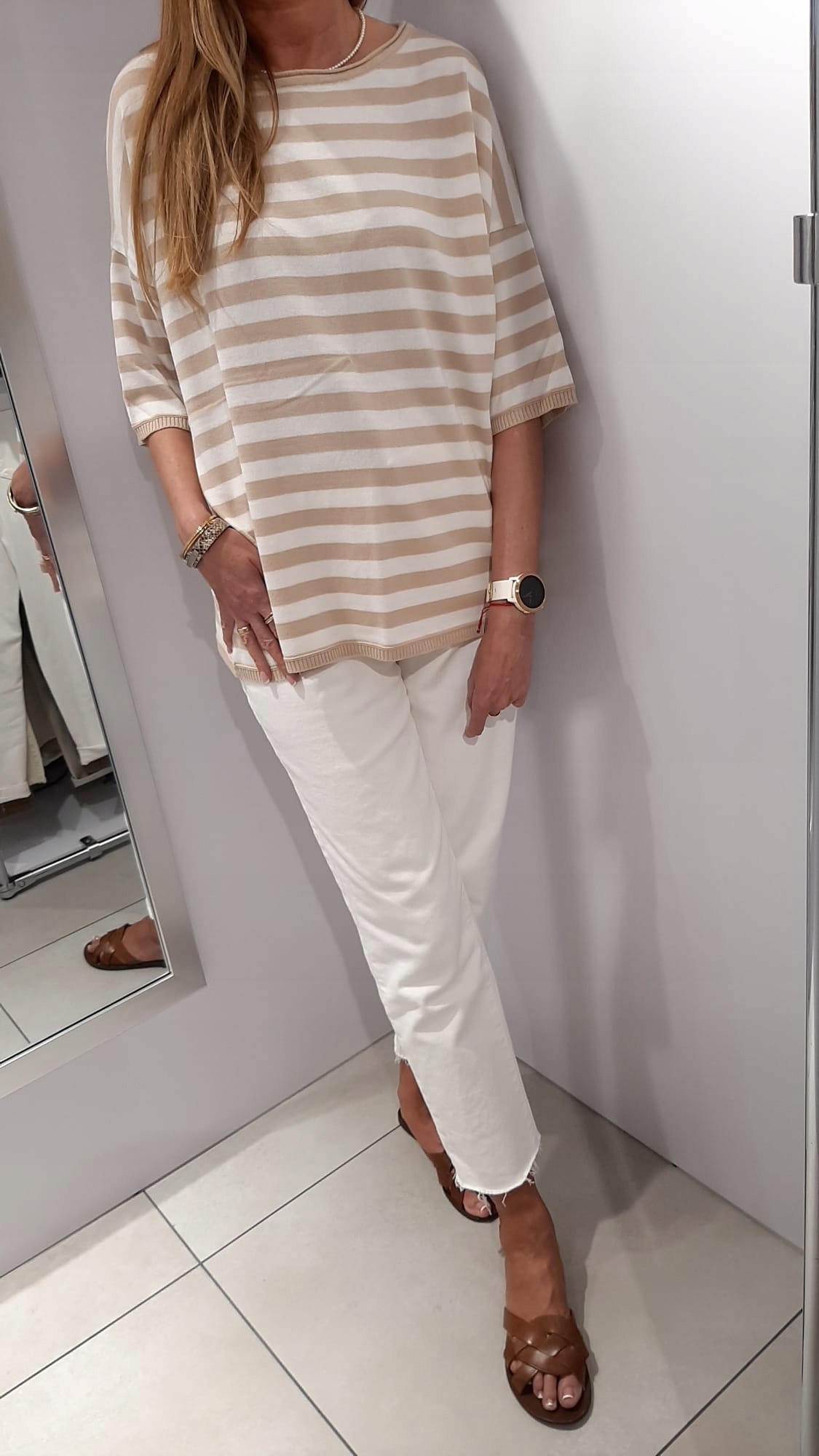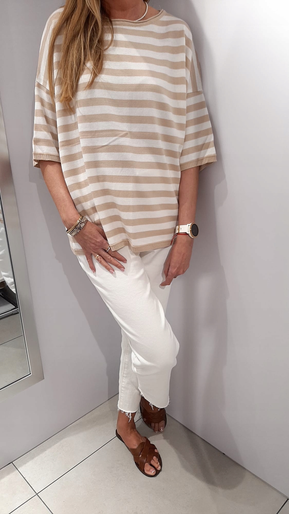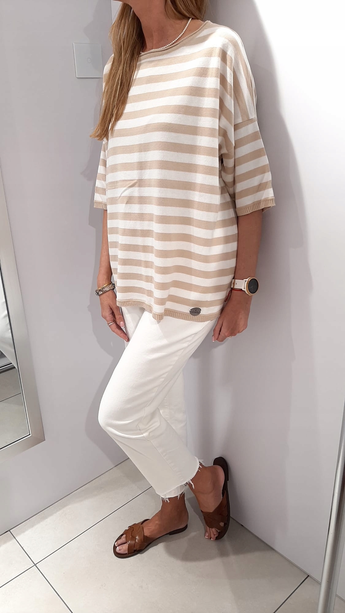 • Luźna sweterkowa bluzka w paski. Rękawy 3/4 zakończone ściągaczem. Na przodzie nowe logo naszywka