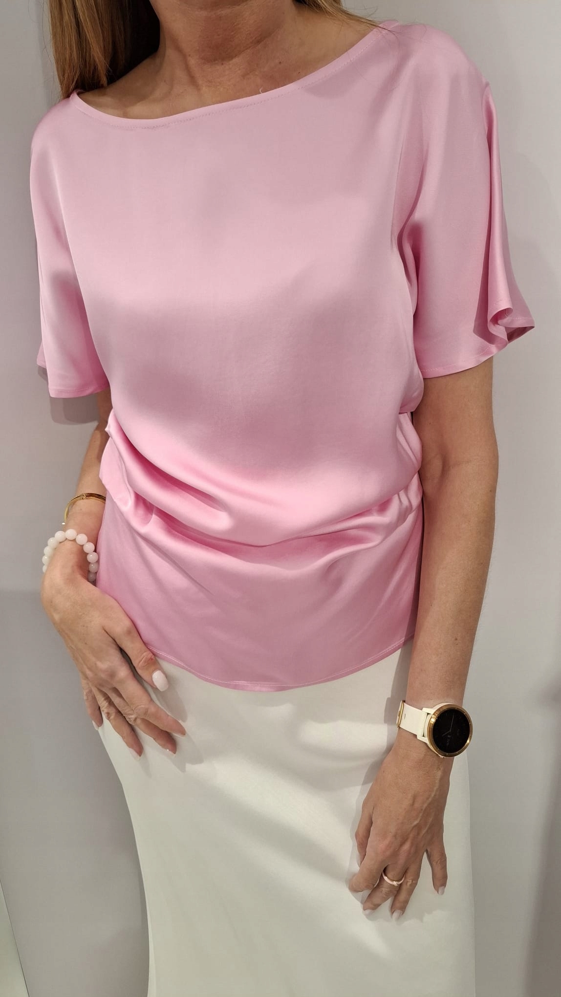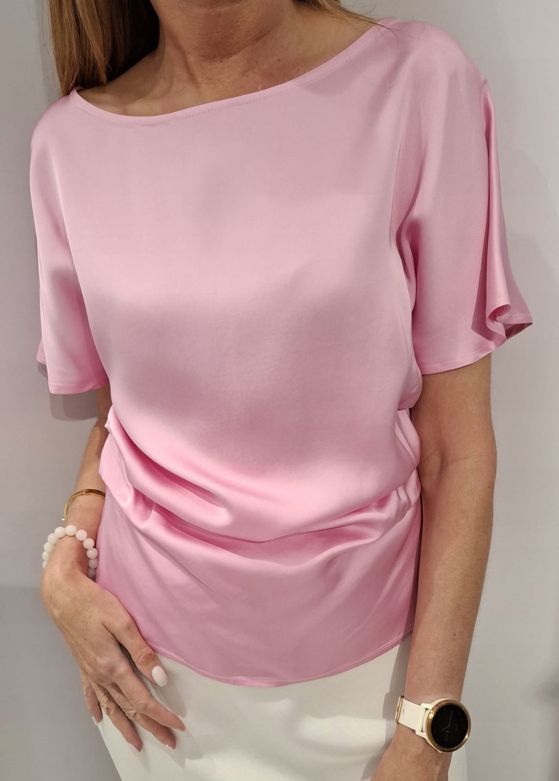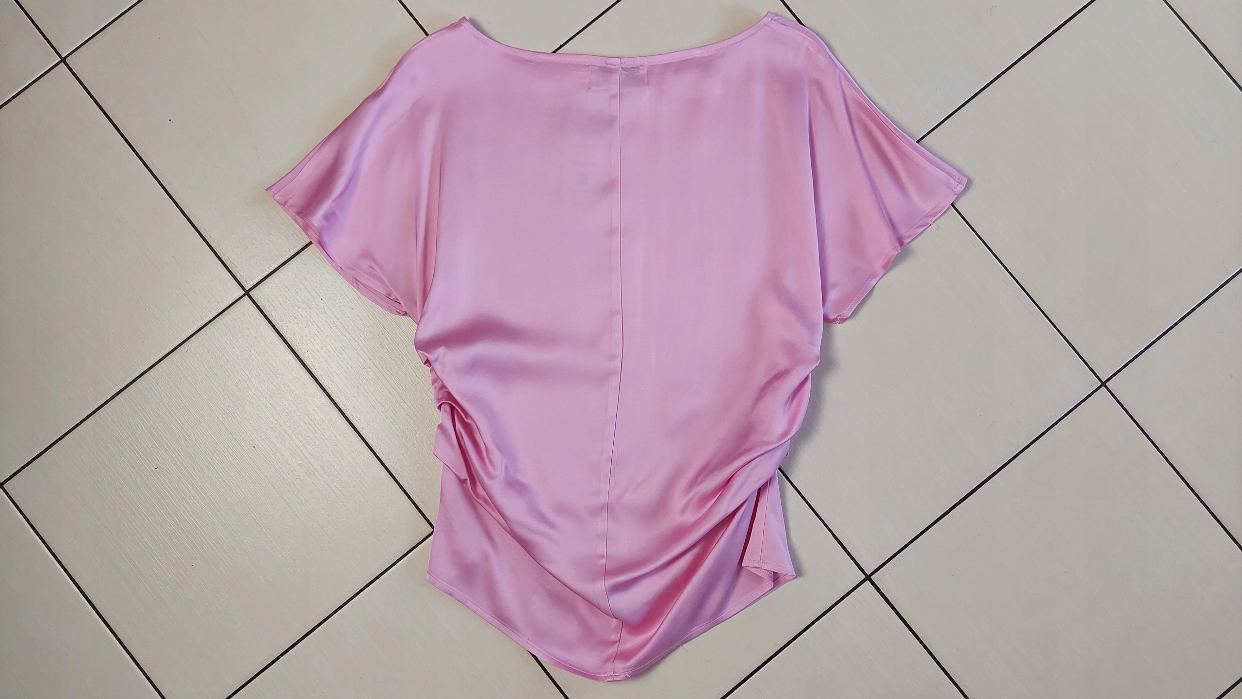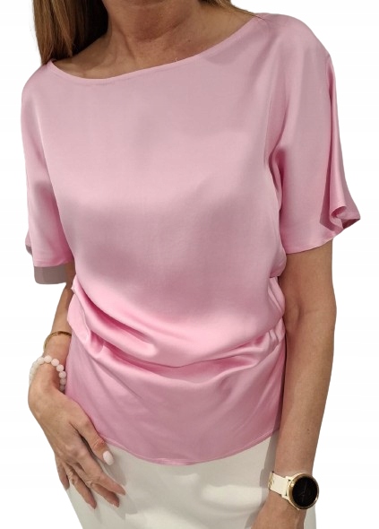 - Satynowa bluzka. Wykonana z wysokiej jakości materiału. Taliowany krój. Charakteru nadają na bokach marszczenia