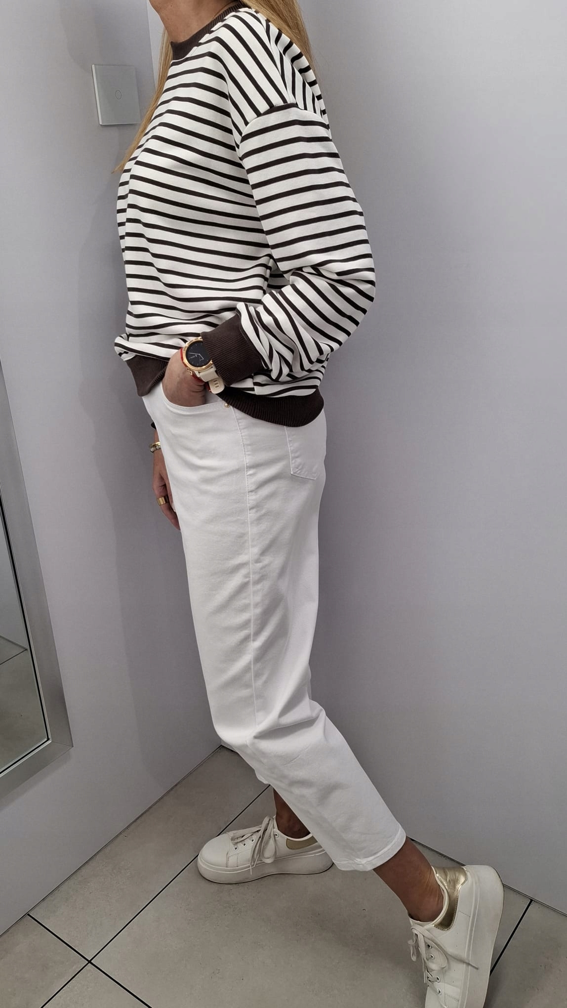 - Oryginalna bluza w paski. Wykona z cienkiego, dresowego materiału.