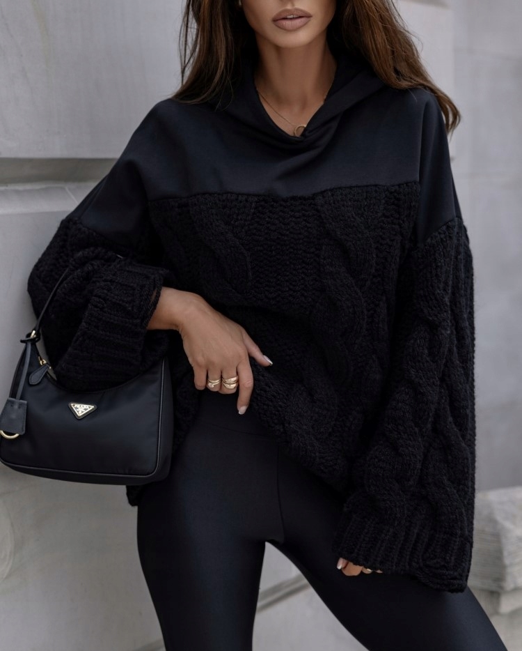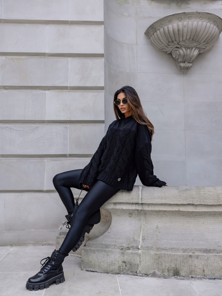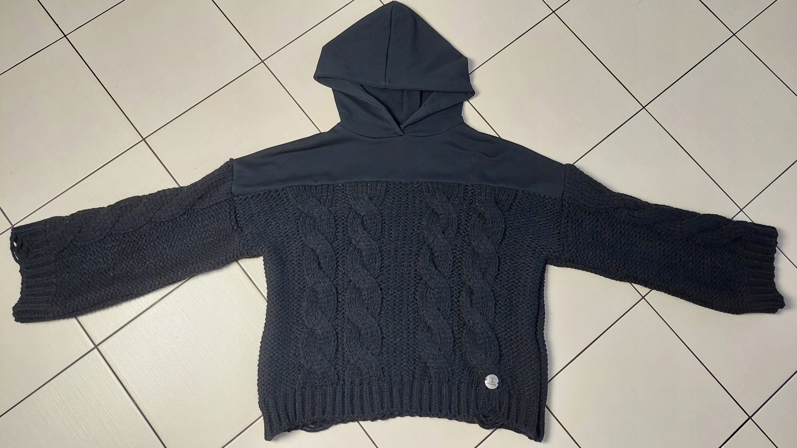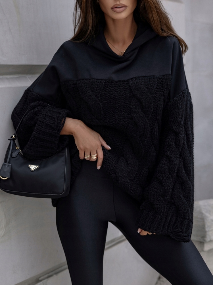 - Oryginalny, oversize’owy sweter z kapturem. Wykonany z dwóch różnych materiałów co nadaje mu sportowego charakteru.