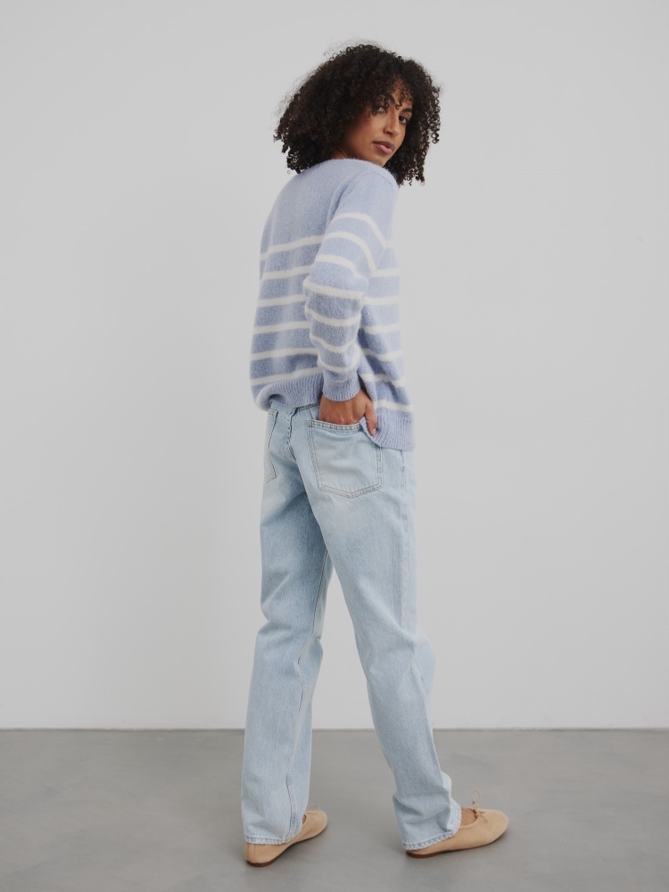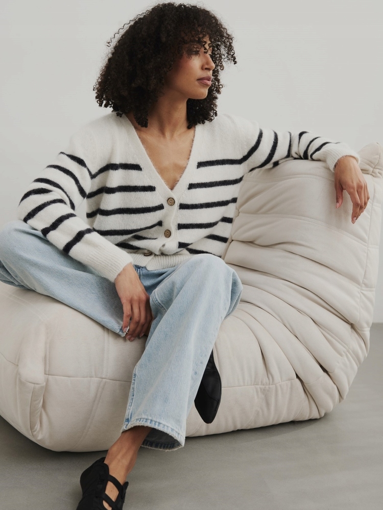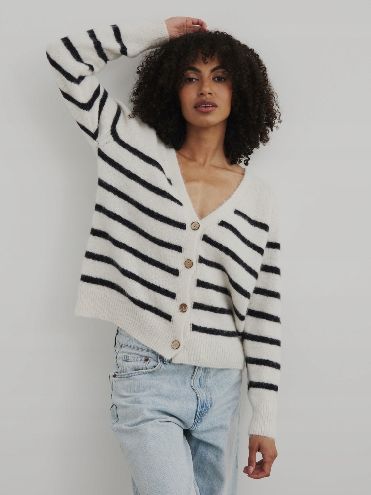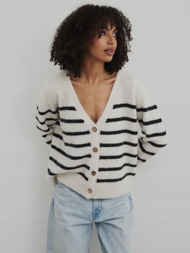 - Rewelacyjny kardigan w paski, zapinany na guziki. Wykonany z najwyższej jakości materiału. Dodatkowym atutem jest szeroki dekolt V.
