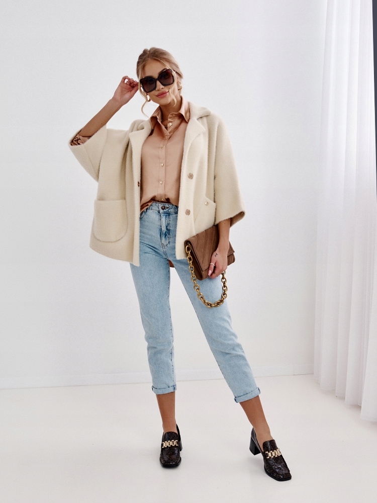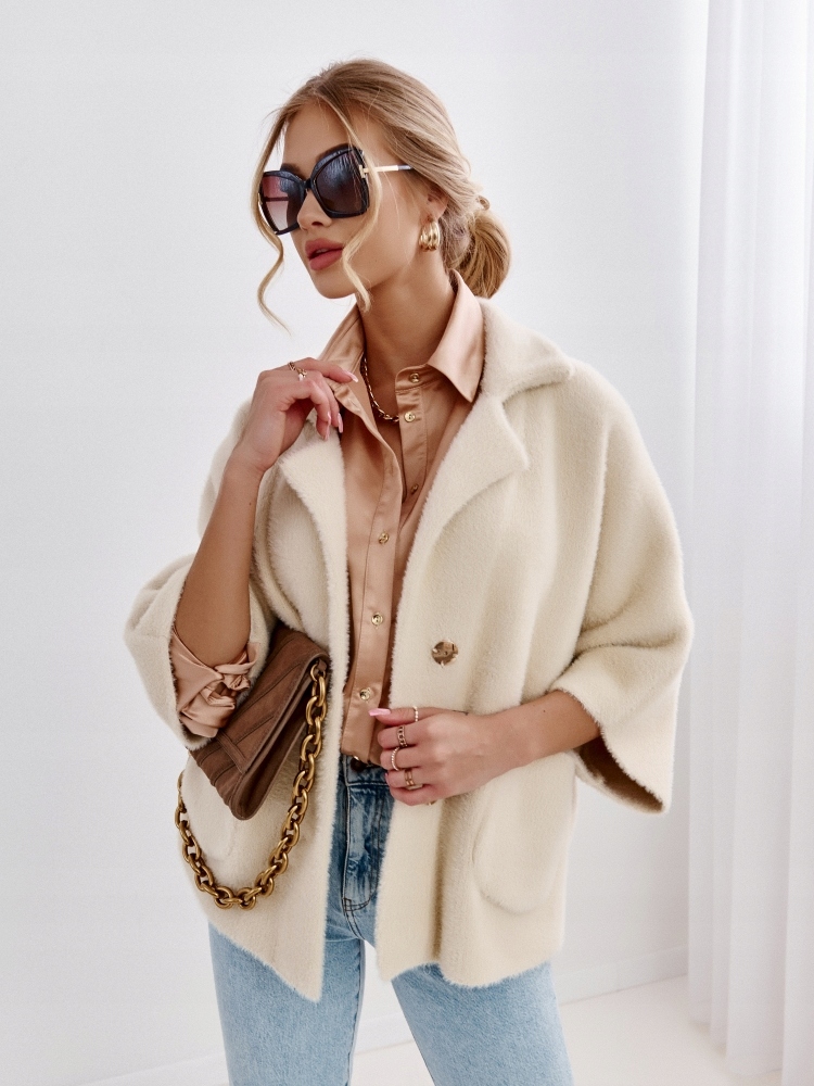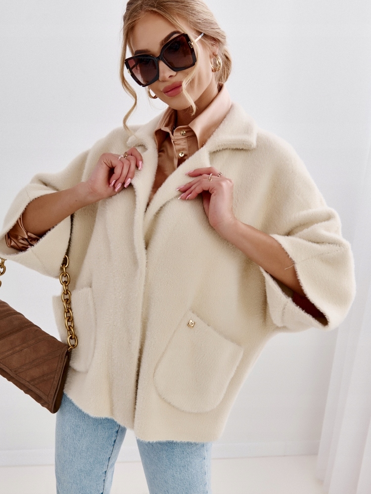 - Wyjątkowa, sweterkowa kurteczka zapinana na dwie praktyczne napy. Wykonana z materiału typu ” Alpaka” Po bokach znajdują się pojemne kieszenie. Świetnie sprawdzi się jako uzupełnienie wielu stylizacji.