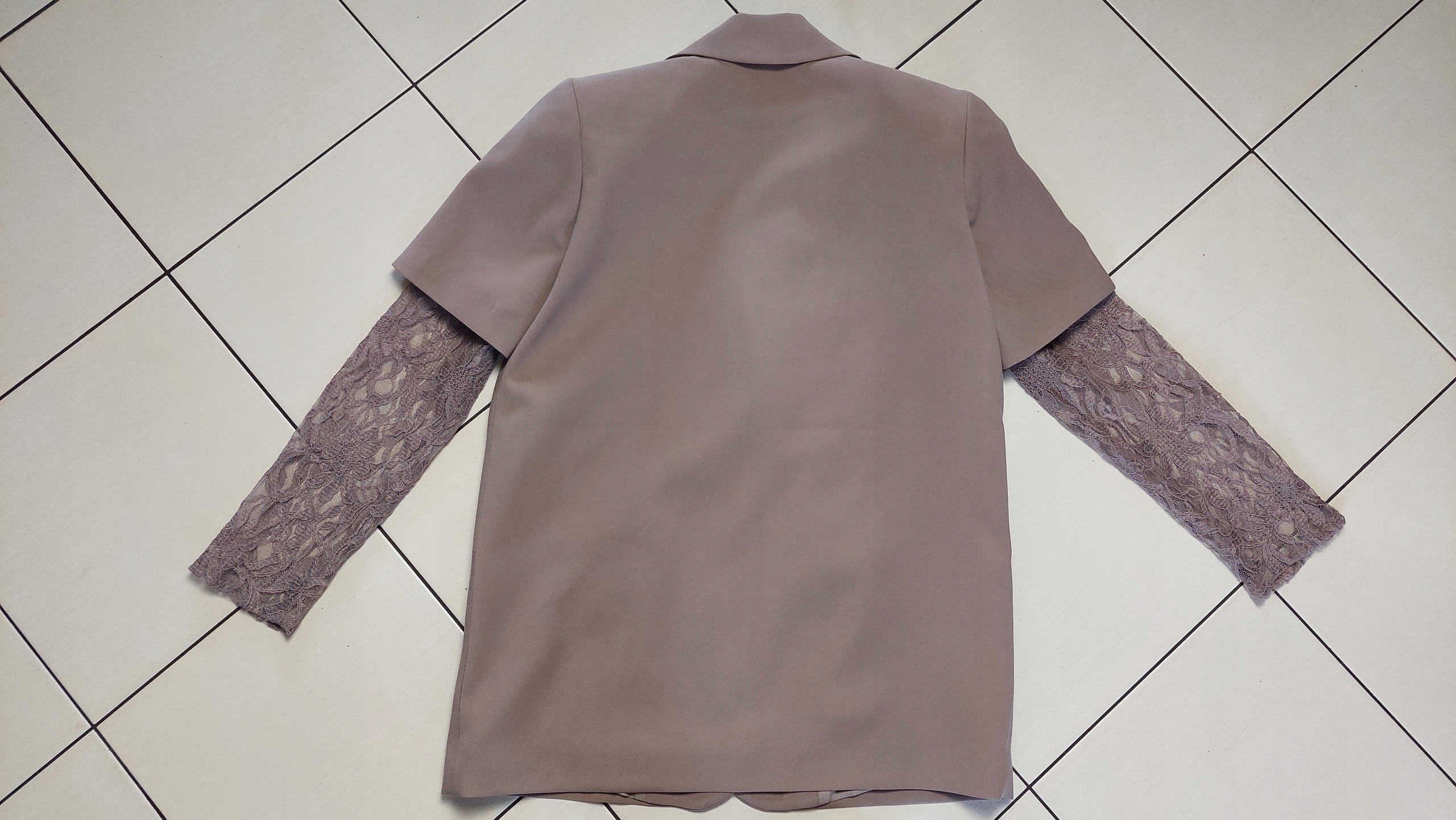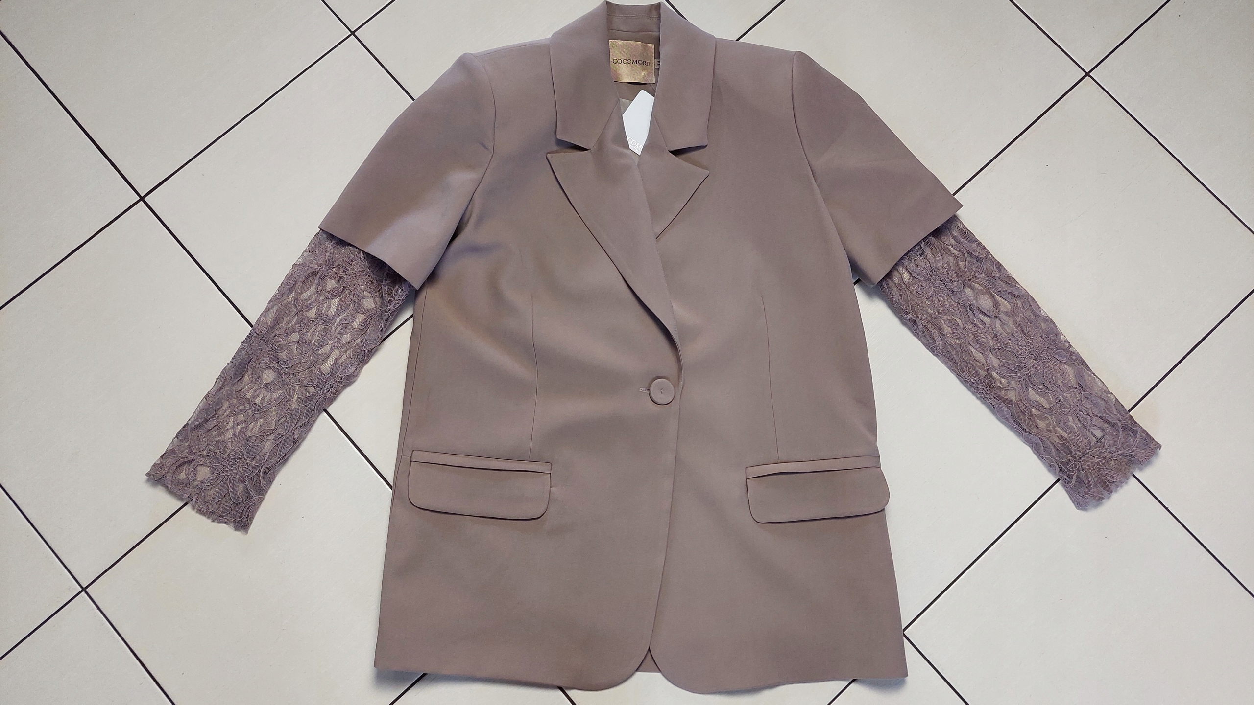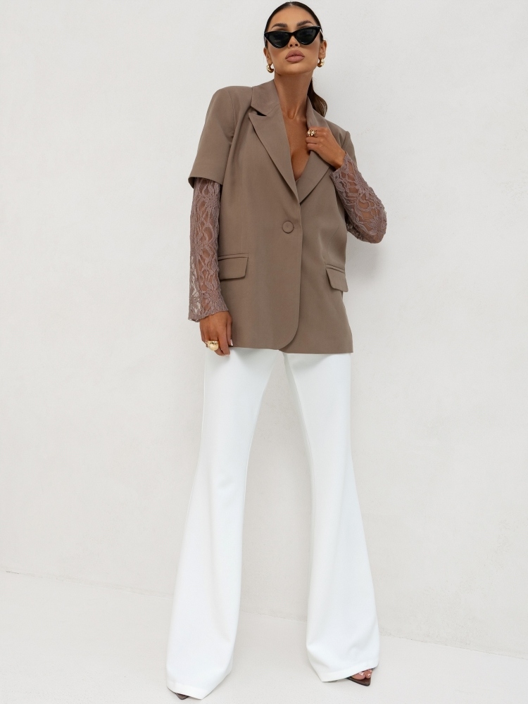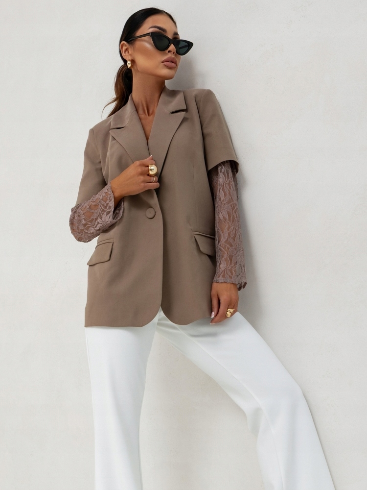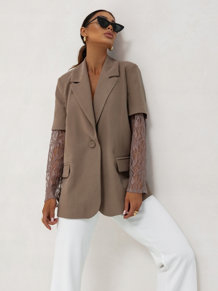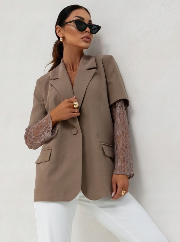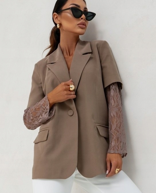 - Rewelacyjna hybrydowa marynarka z podszewką, zapinana na guzik, na ramionach poduszki. Oryginalności nadają koronkowe rękawy. Możliwość skompletowania ze spodniami