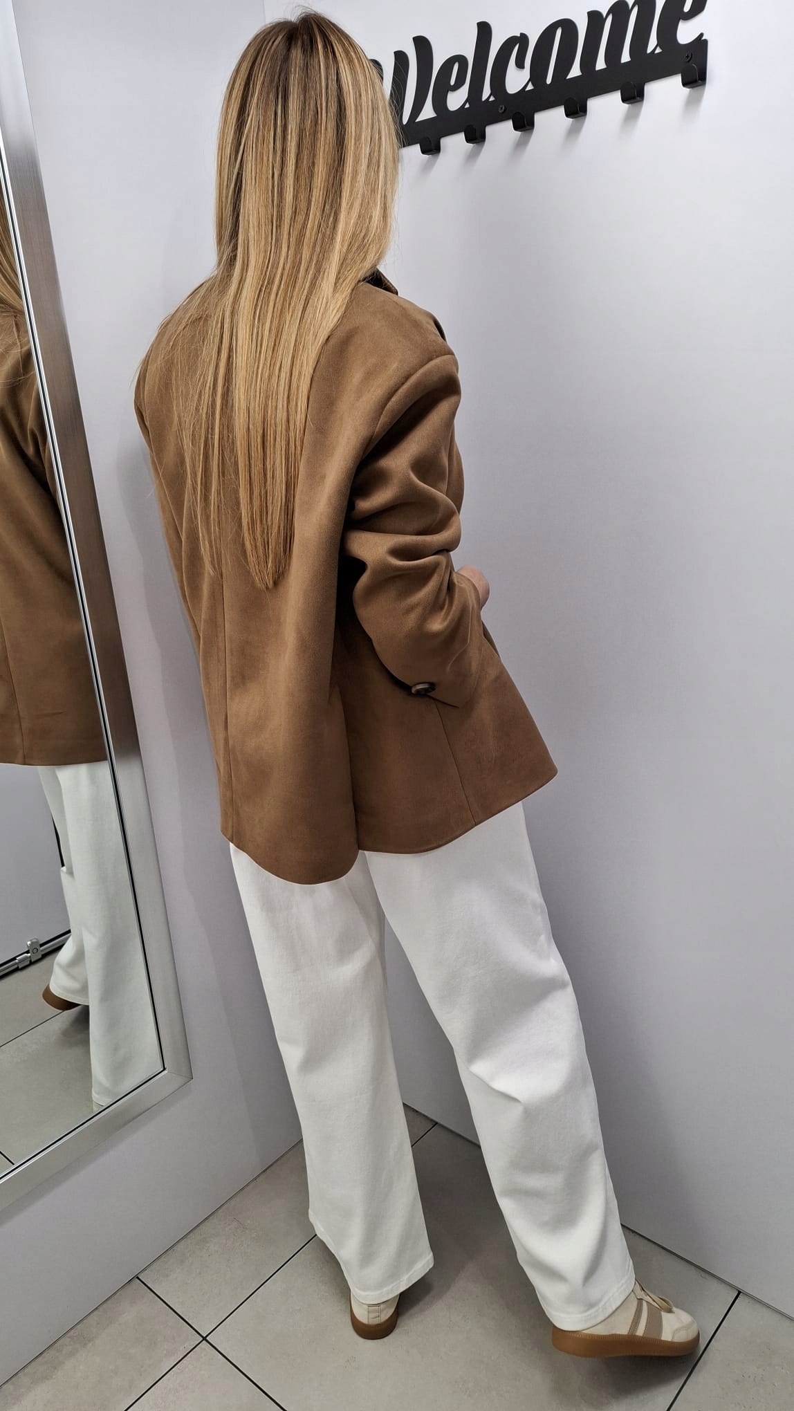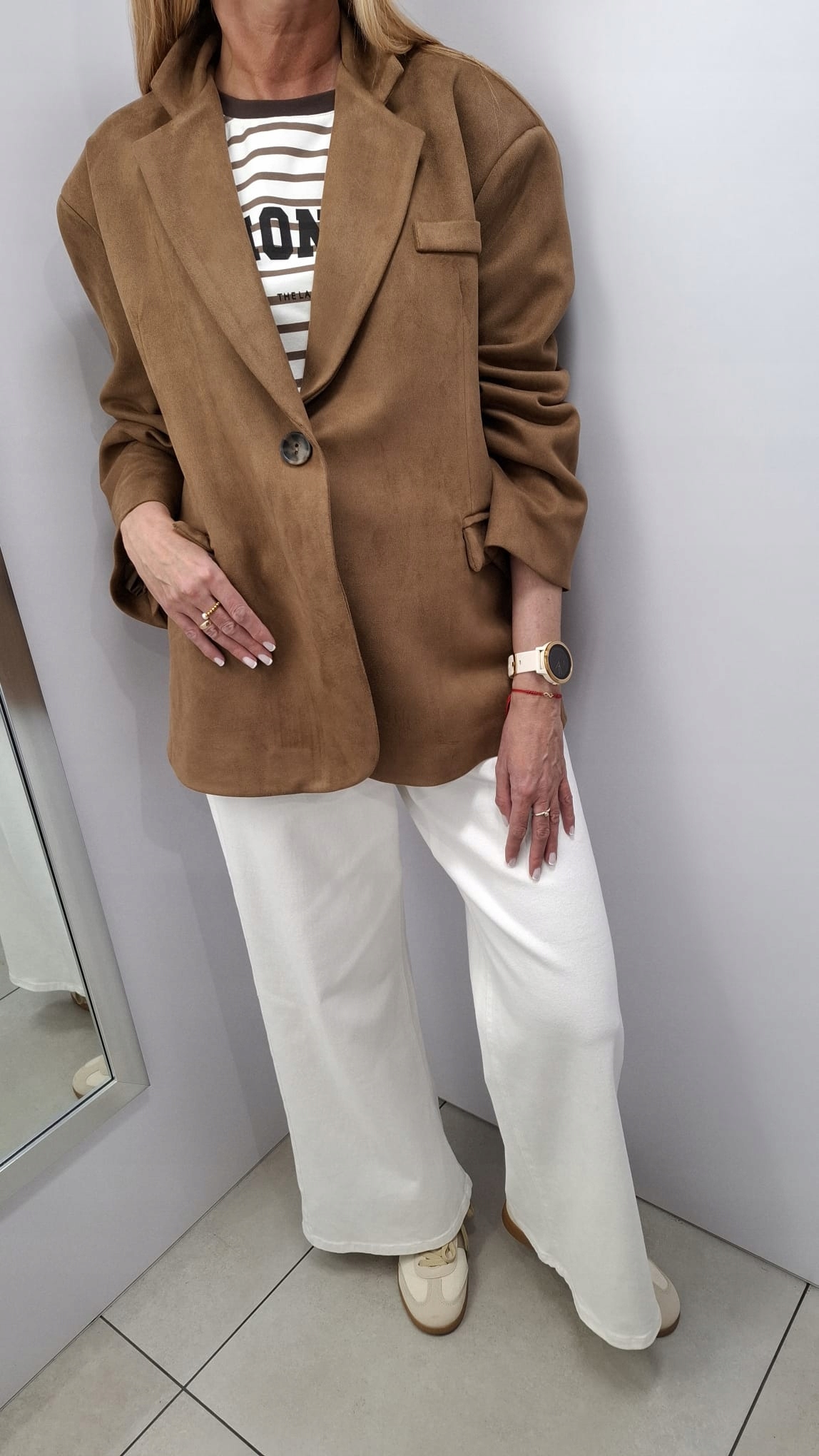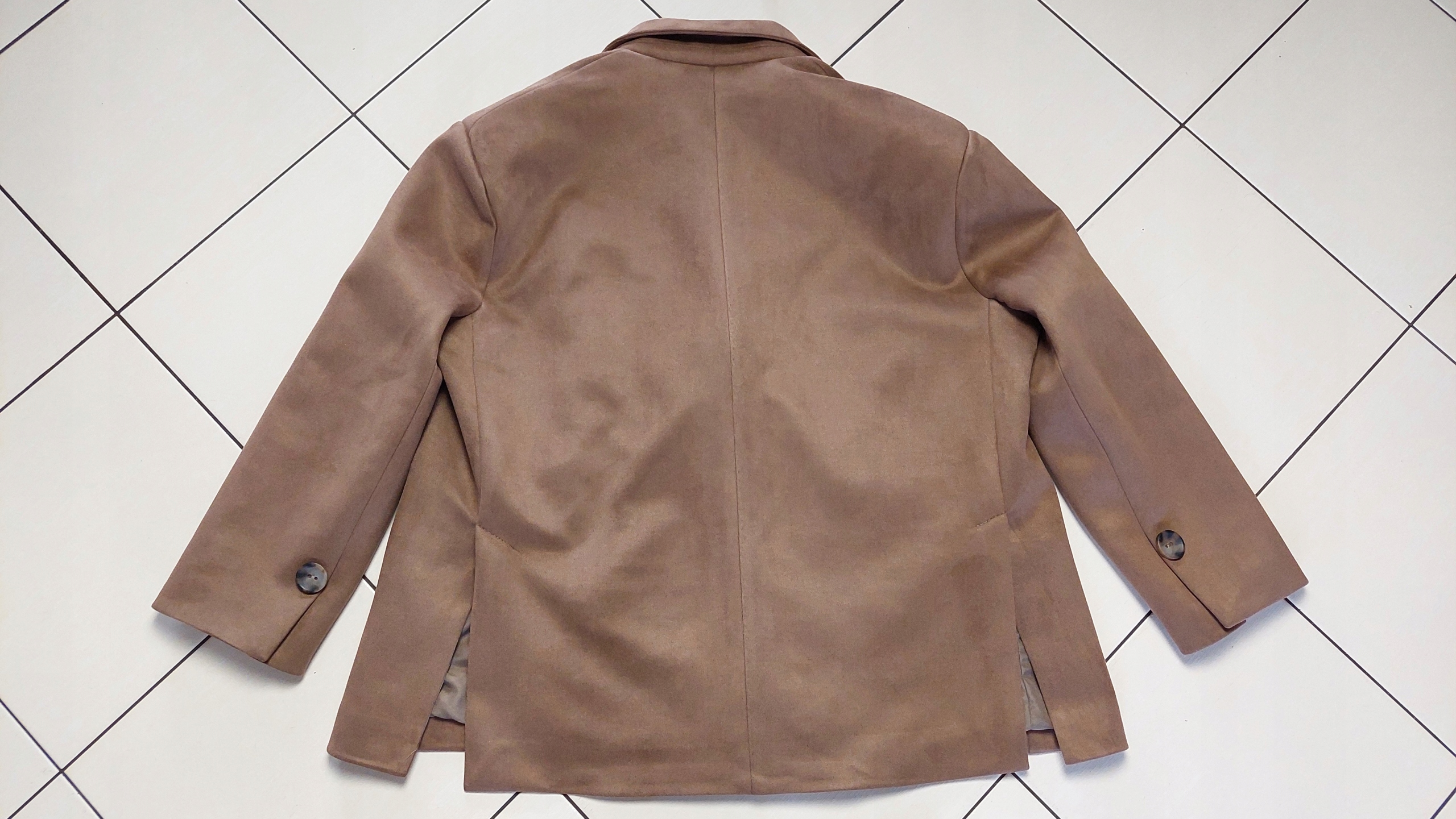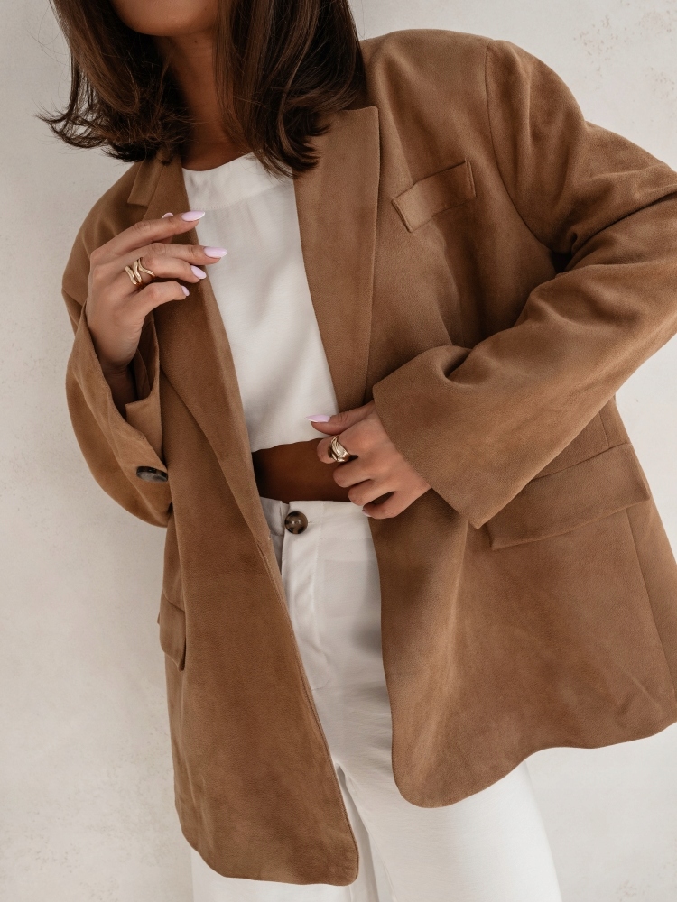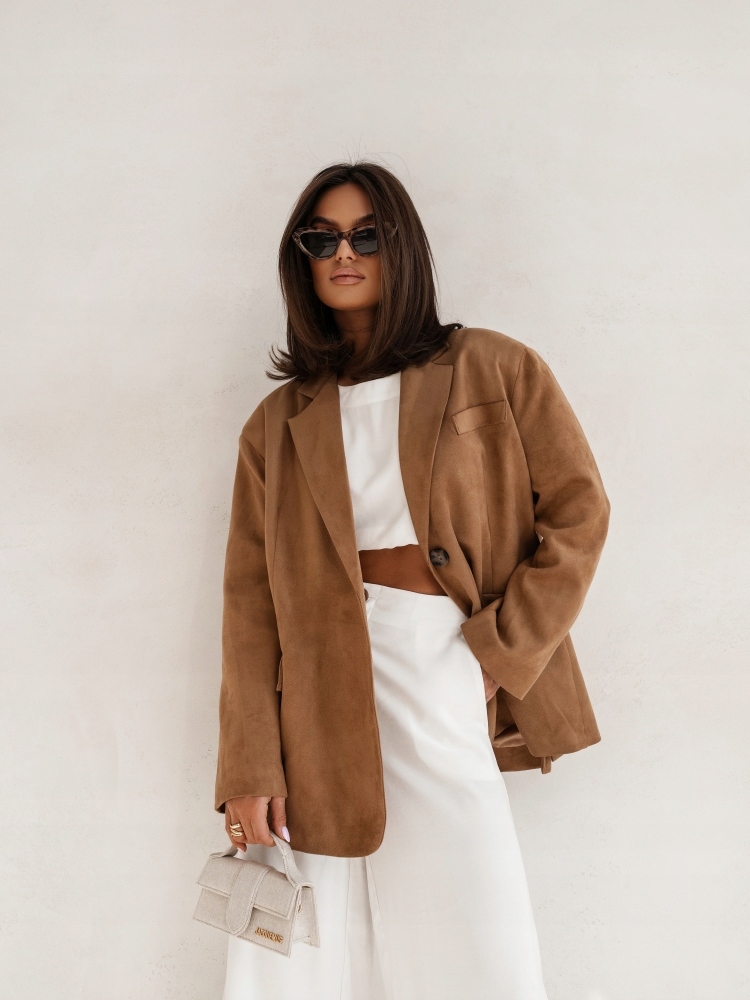 - Krój oversize, z podszewką, zapinana na guzik, na ramionach poduszki. Z powodzeniem może zastąpić kurtkę. Wykonana z materiału przypominającego zamsz