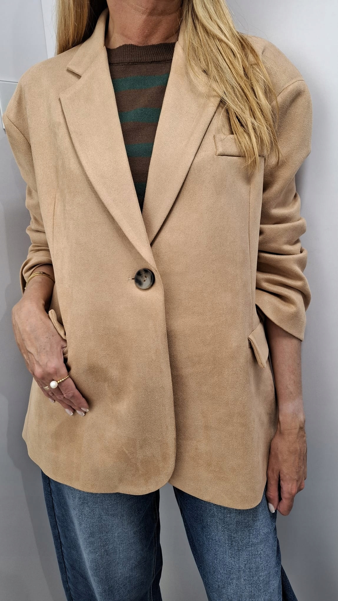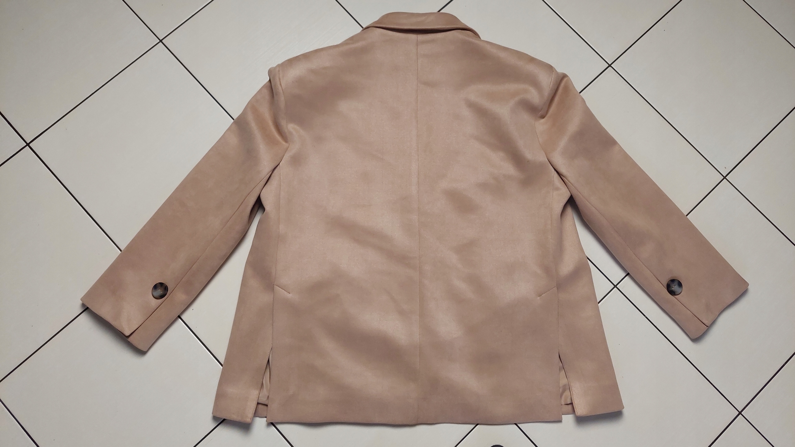 - Krój oversize, z podszewką, zapinana na guzik, na ramionach poduszki. Z powodzeniem może zastąpić kurtkę. Wykonana z materiału przypominającego zamsz