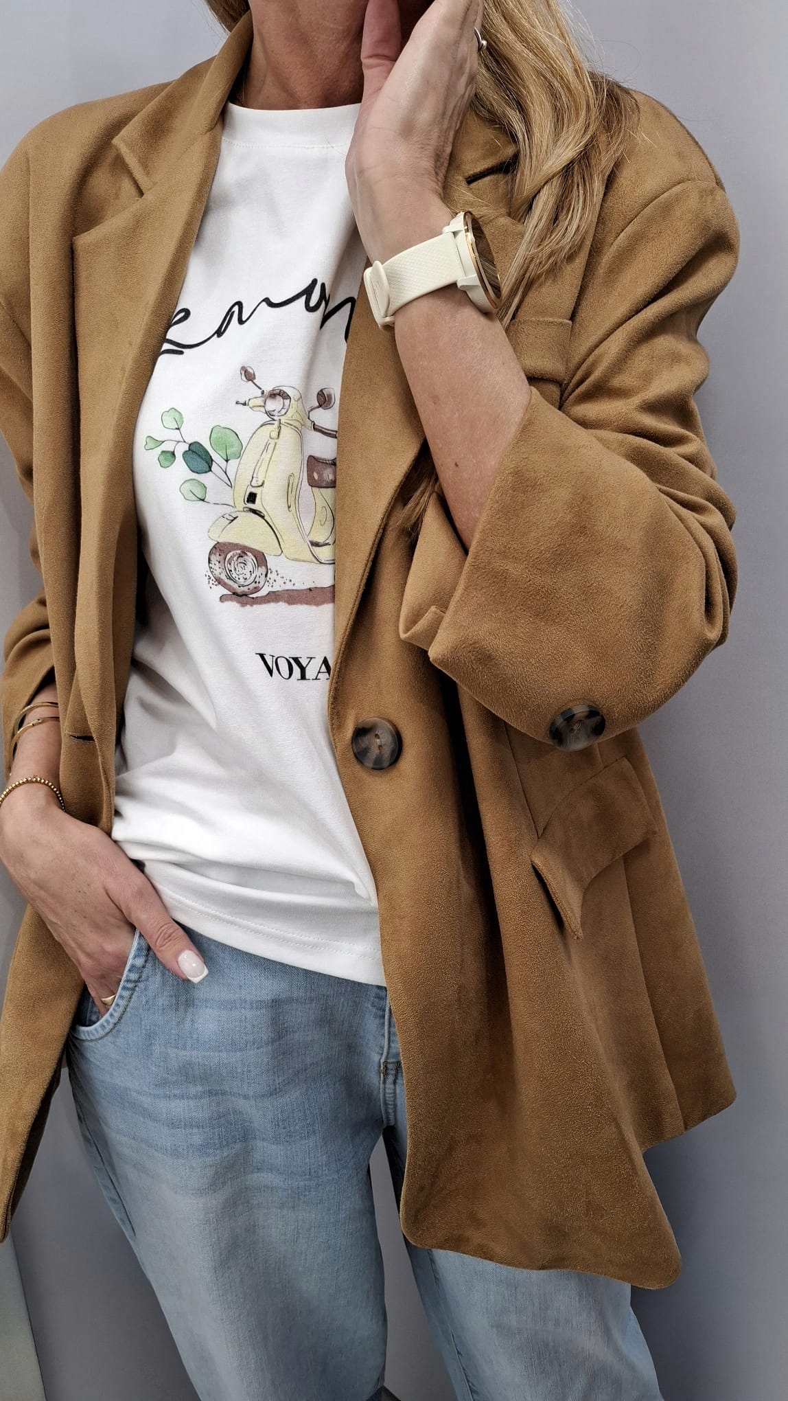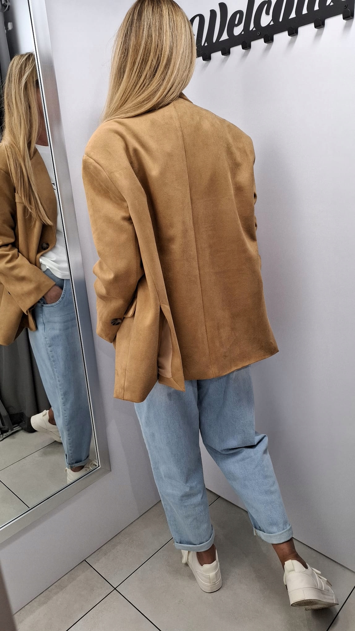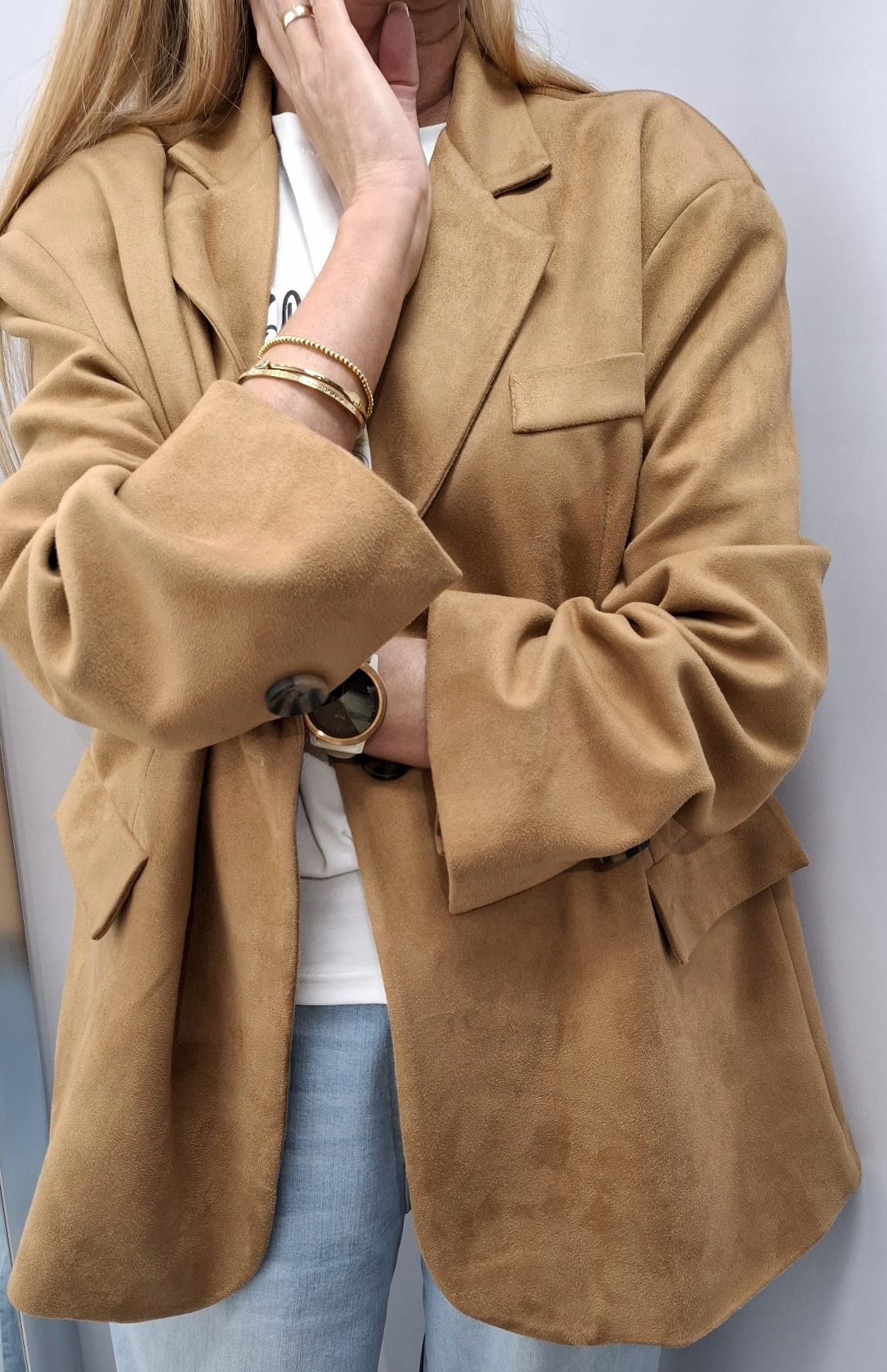 - Krój oversize, z podszewką, zapinana na guzik, na ramionach poduszki. Z powodzeniem może zastąpić kurtkę. Wykonana z materiału przypominającego zamsz