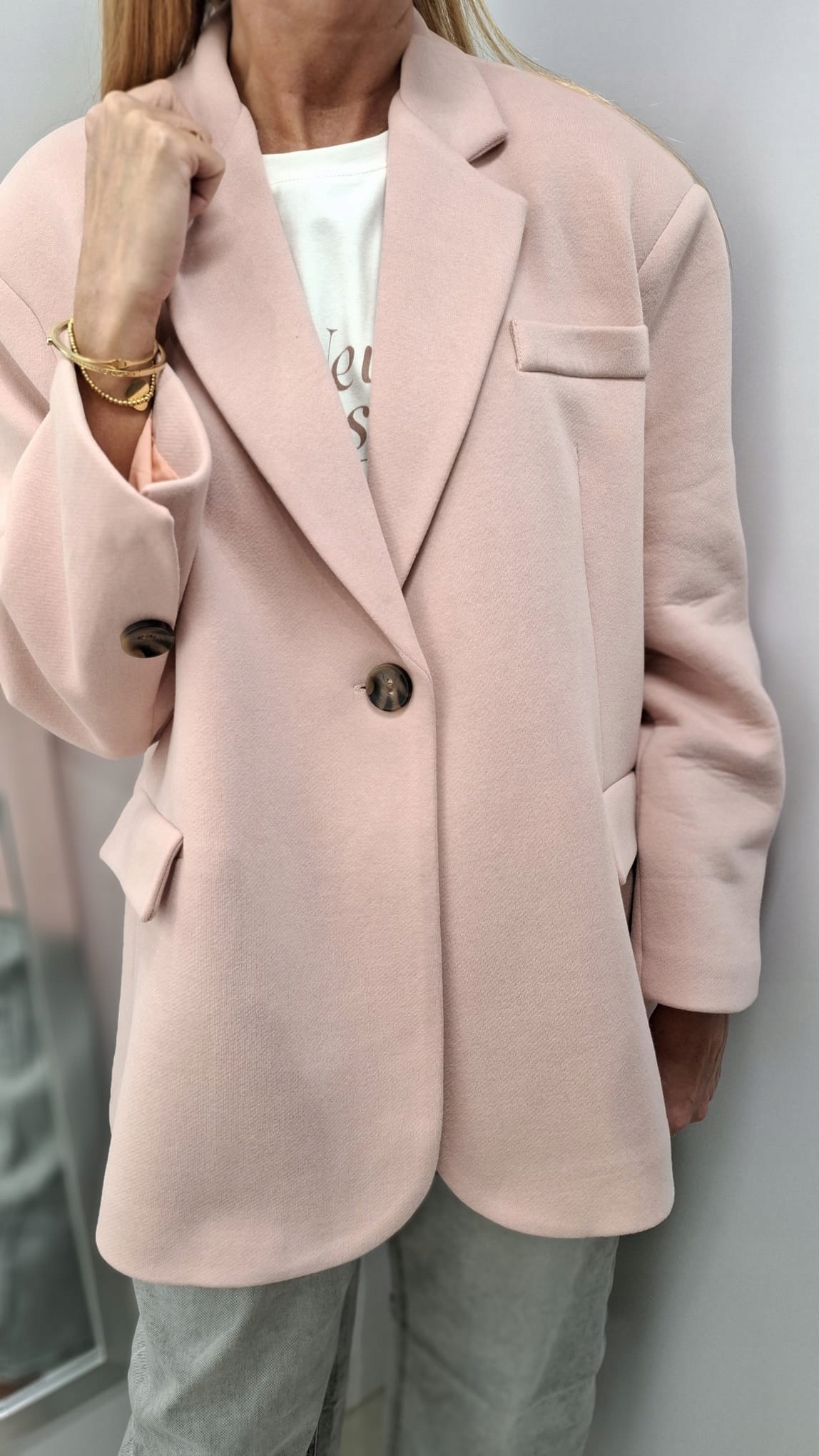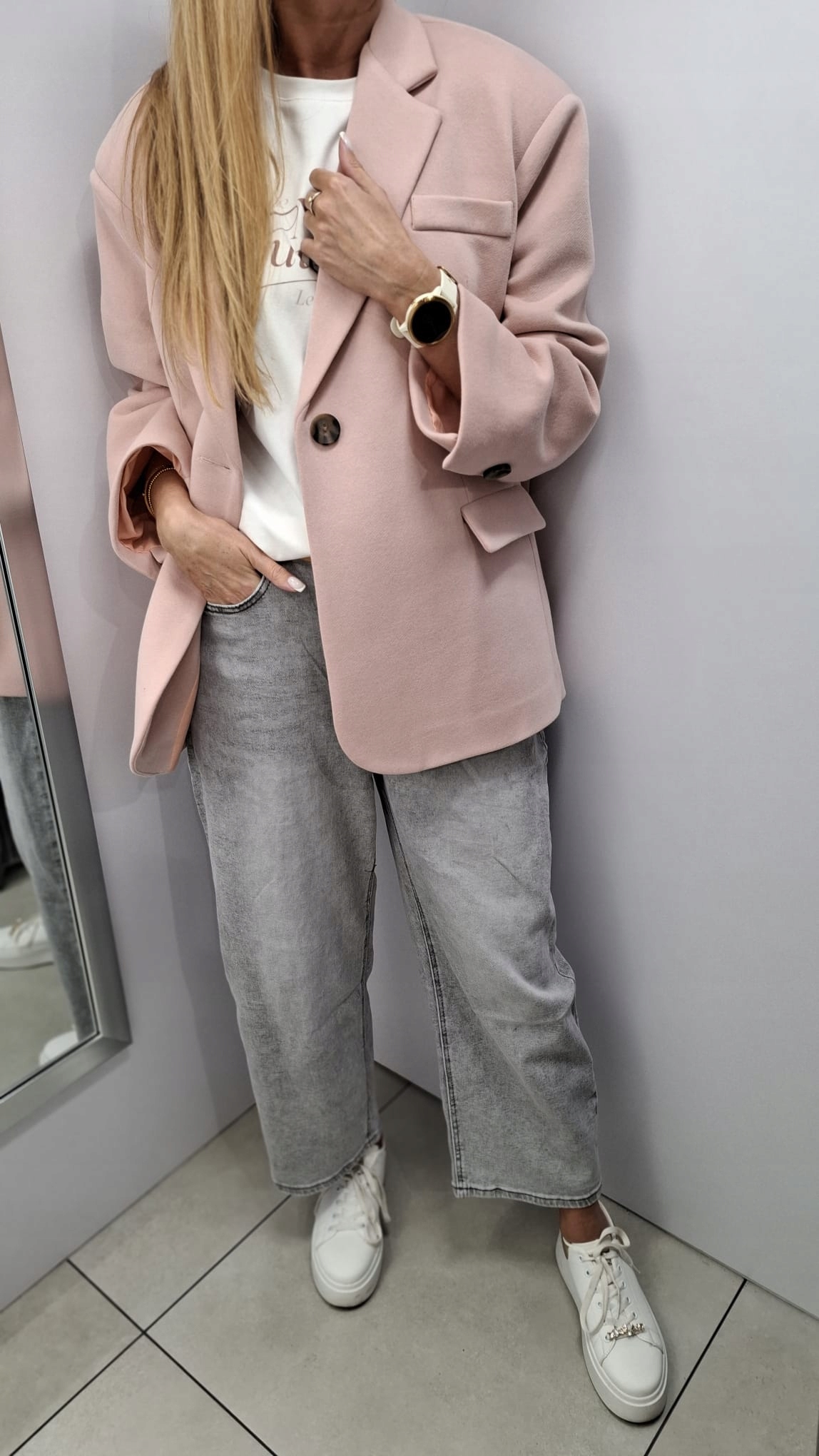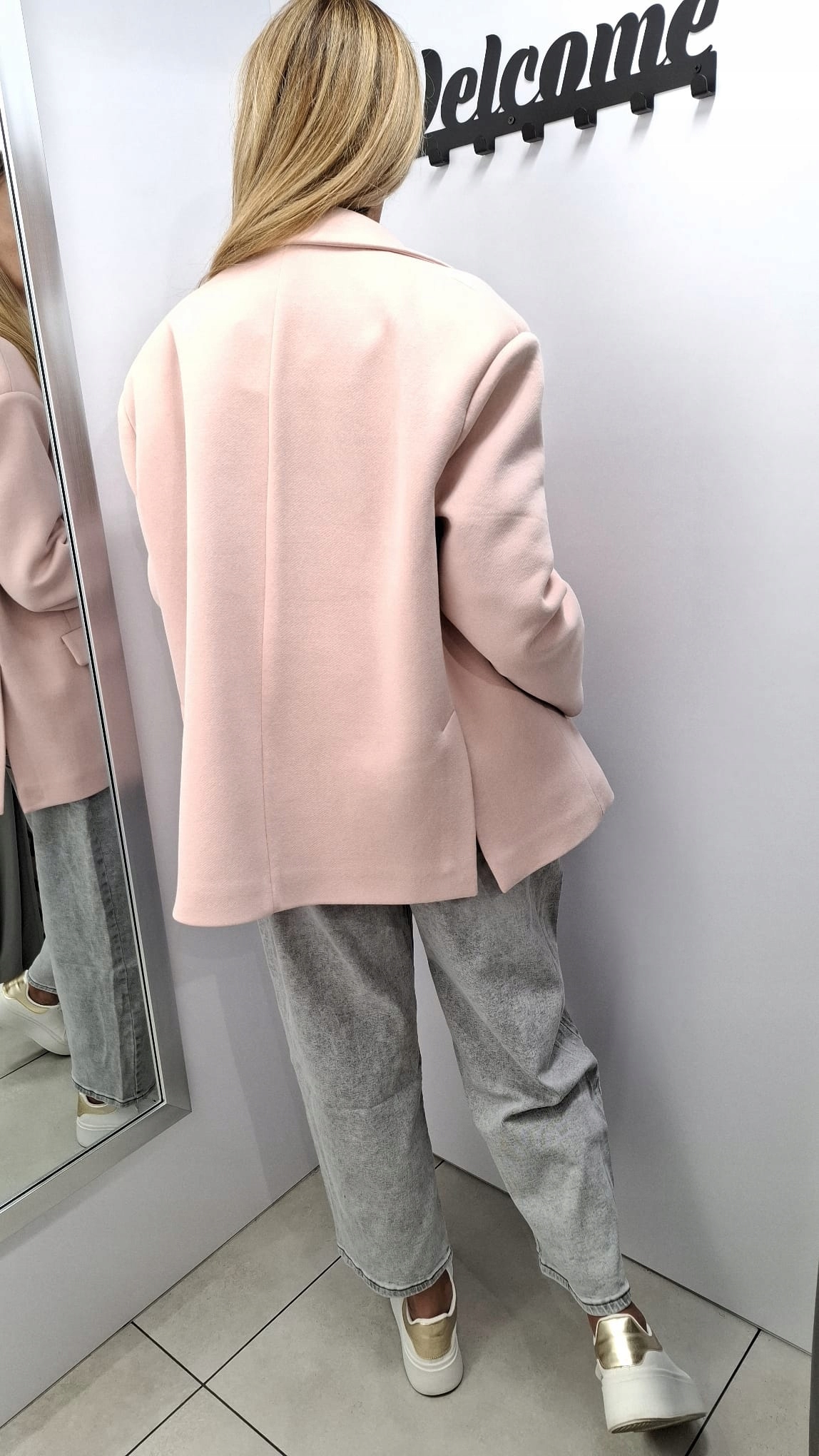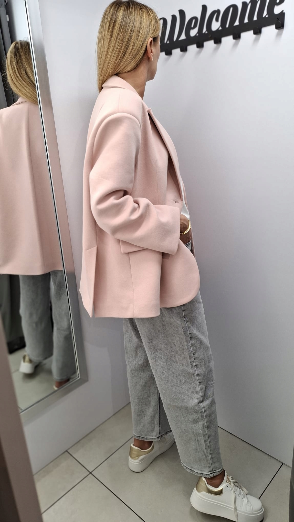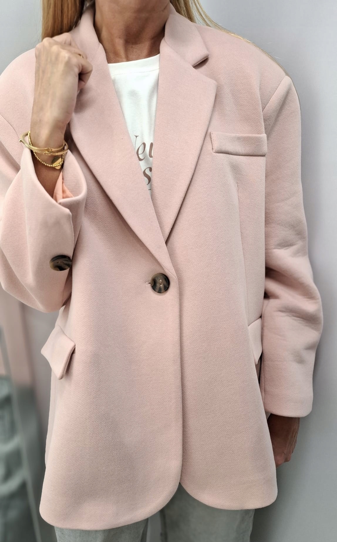 - Krój oversize, z podszewką, zapinana na guzik, na ramionach poduszki. Z powodzeniem może zastąpić kurtkę. Wykonana z materiału przypominającego fakturą dres