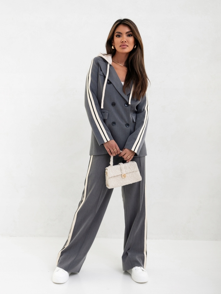 - Sportowo elegancka marynarka, zapinana na guziki. Taliowany krój. Sportowego charakteru nadają ozdobne lampasy na rękawach oraz odpinany kaptur.