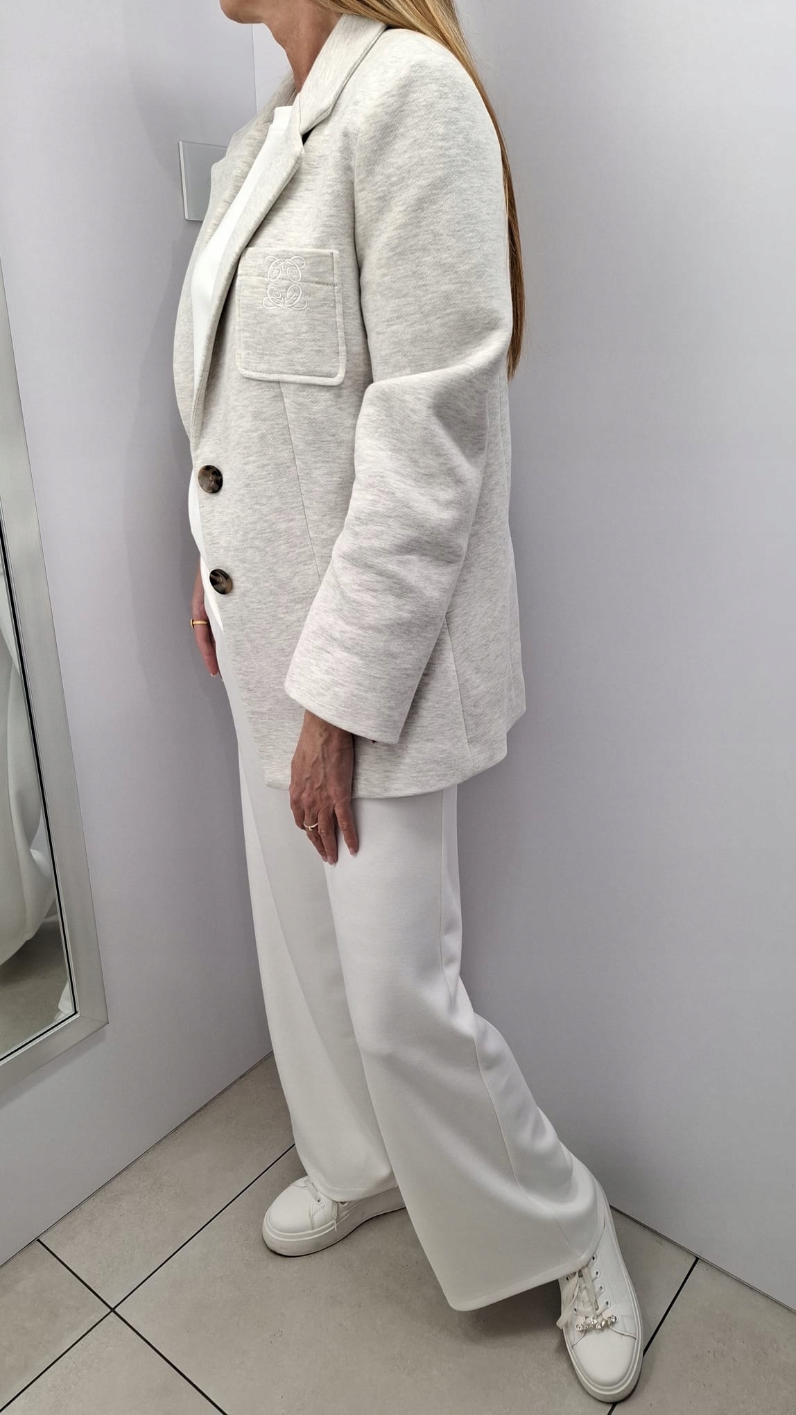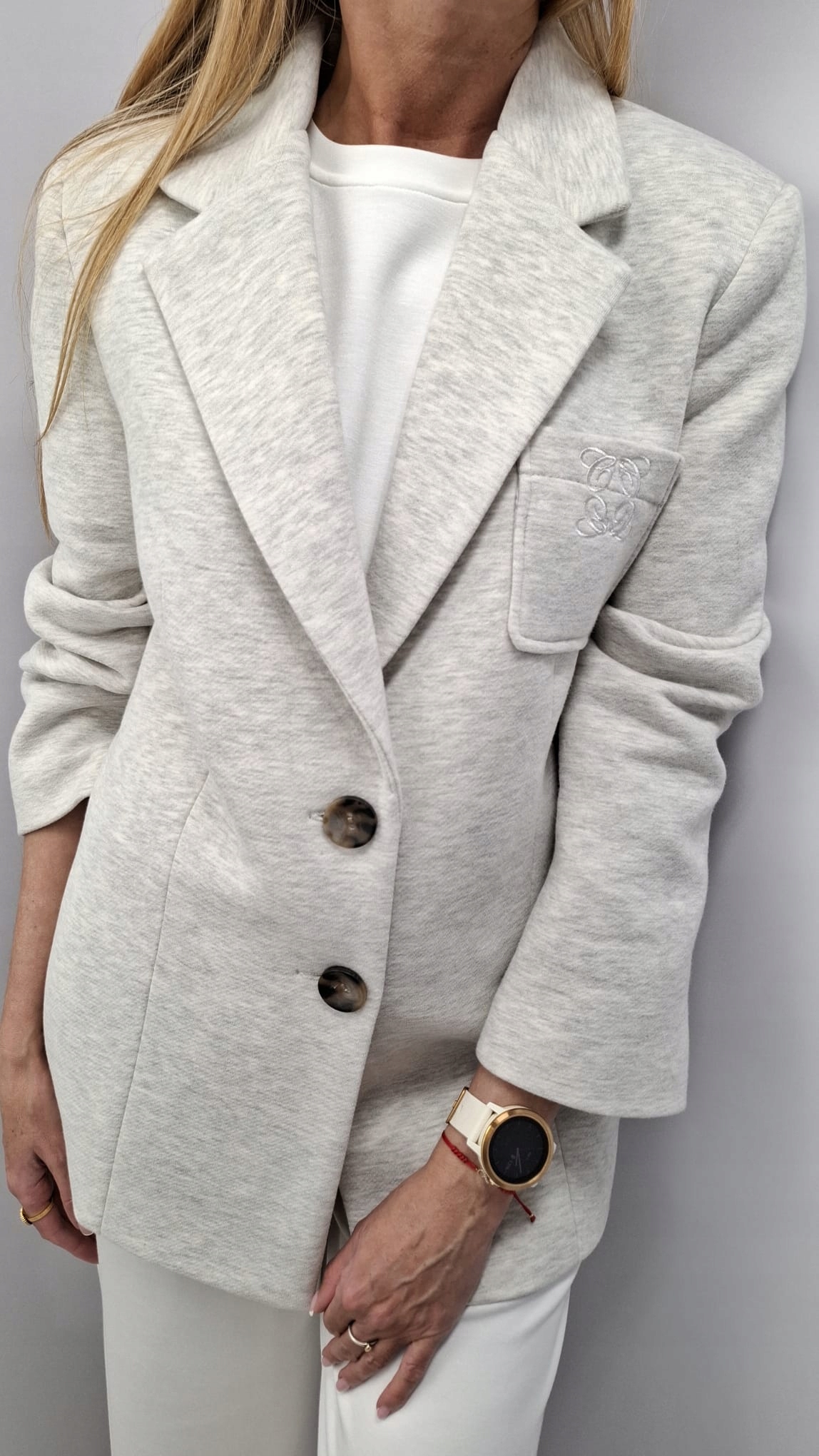 - Rewelacyjna marynarka z podszewką, zapinana na guziki, na ramionach poduszki. Na przodzie kieszonka z haftowanym logo. Z powodzeniem może zastąpić kurtkę. Wykonana z materiału przypominającego fakturą dres