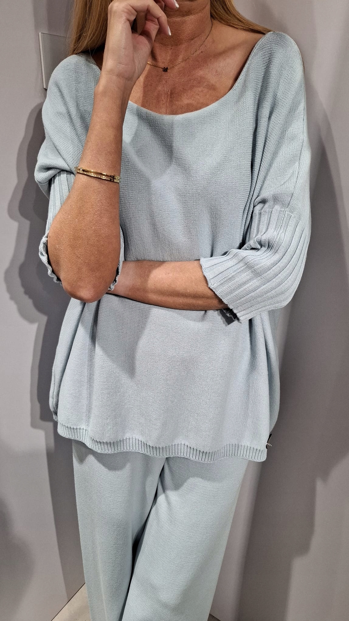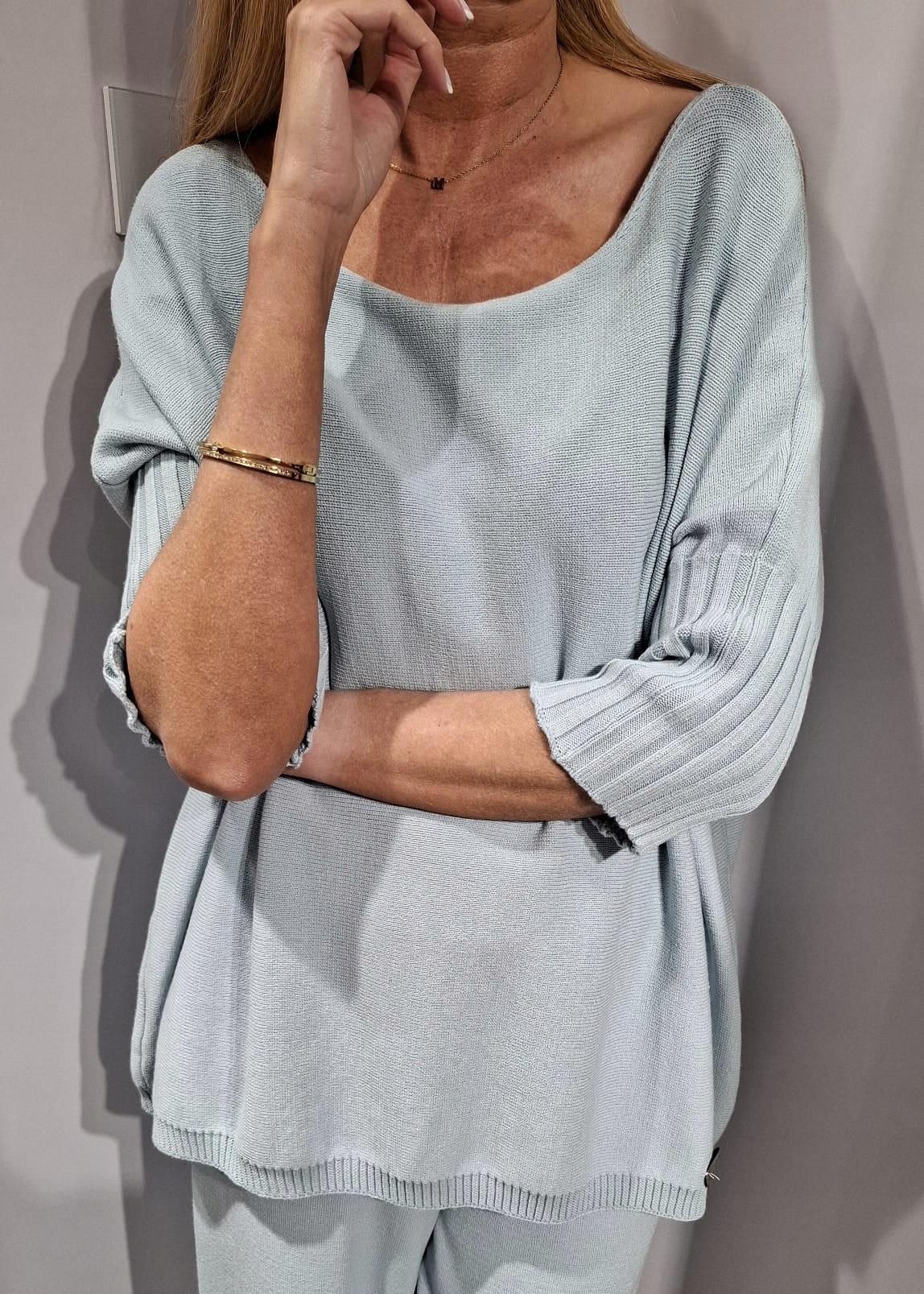 - Rewelacyjna sweterkowa bluzka. Wykonana z miłej i miękkiej przędzy. Krój Oversize. Możliwość skompletowania ze spodniami i kardiganem narzutką.