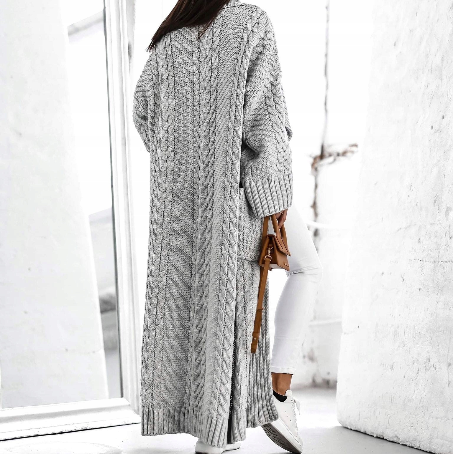 - Oversize’owy krój, Zapinany na guzik, Splot w piękny warkocz, Obszerne kieszenie po bokach, Długi luźny rękaw, Szeroki kołnierz