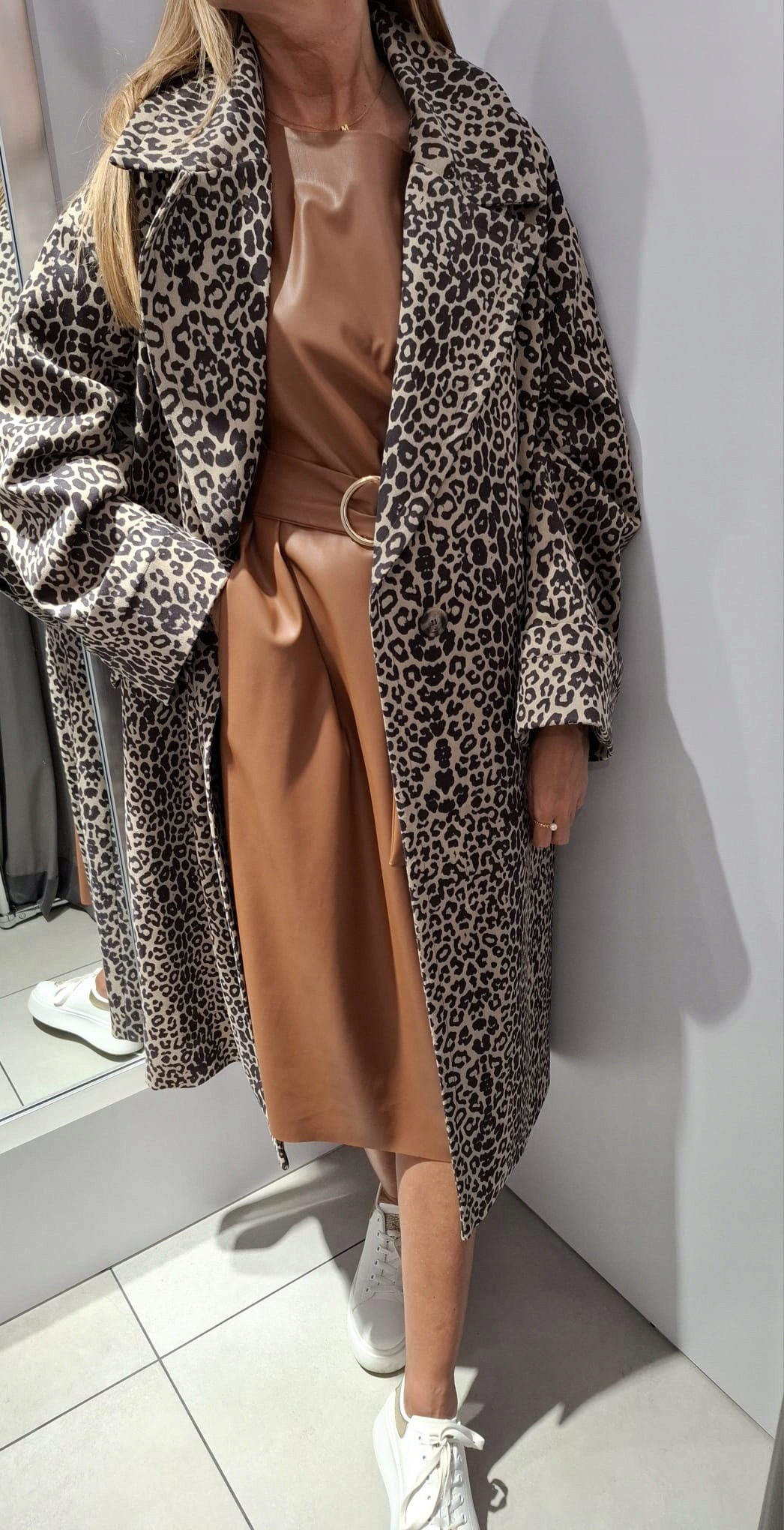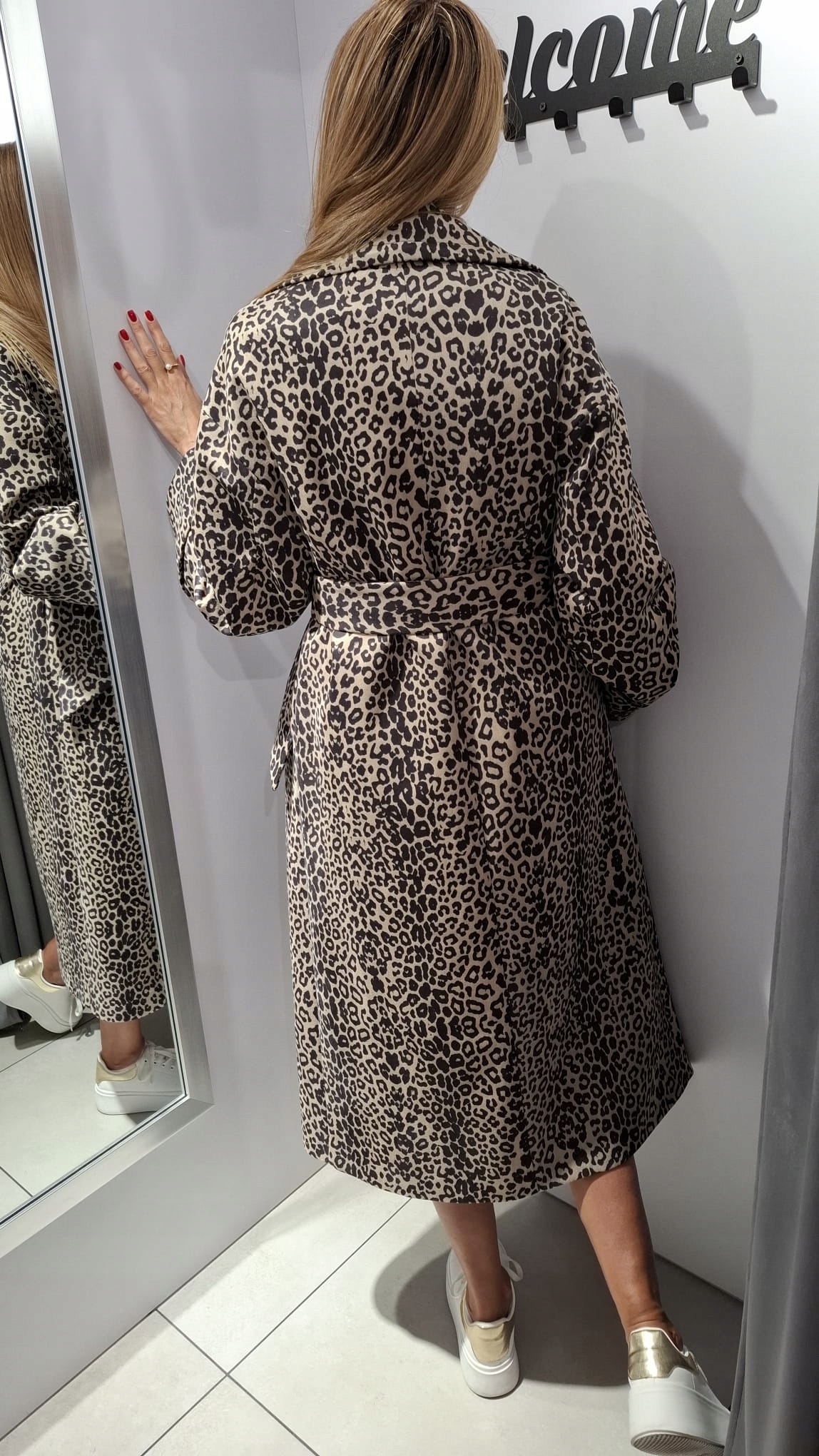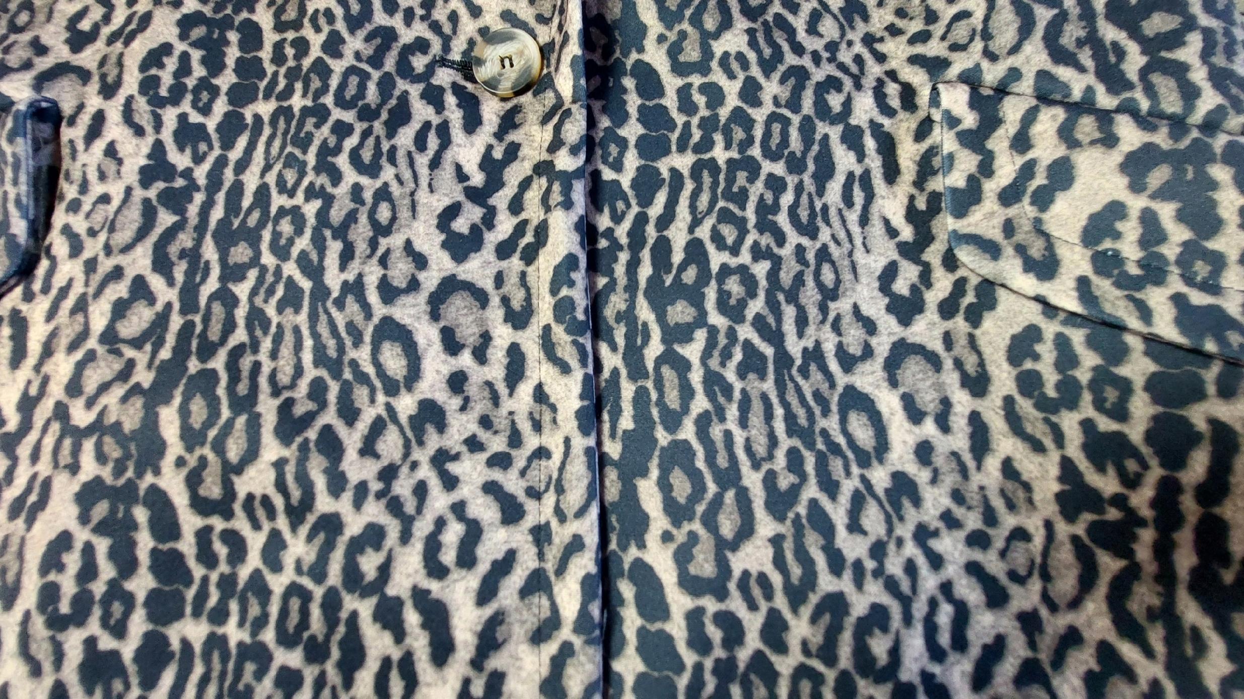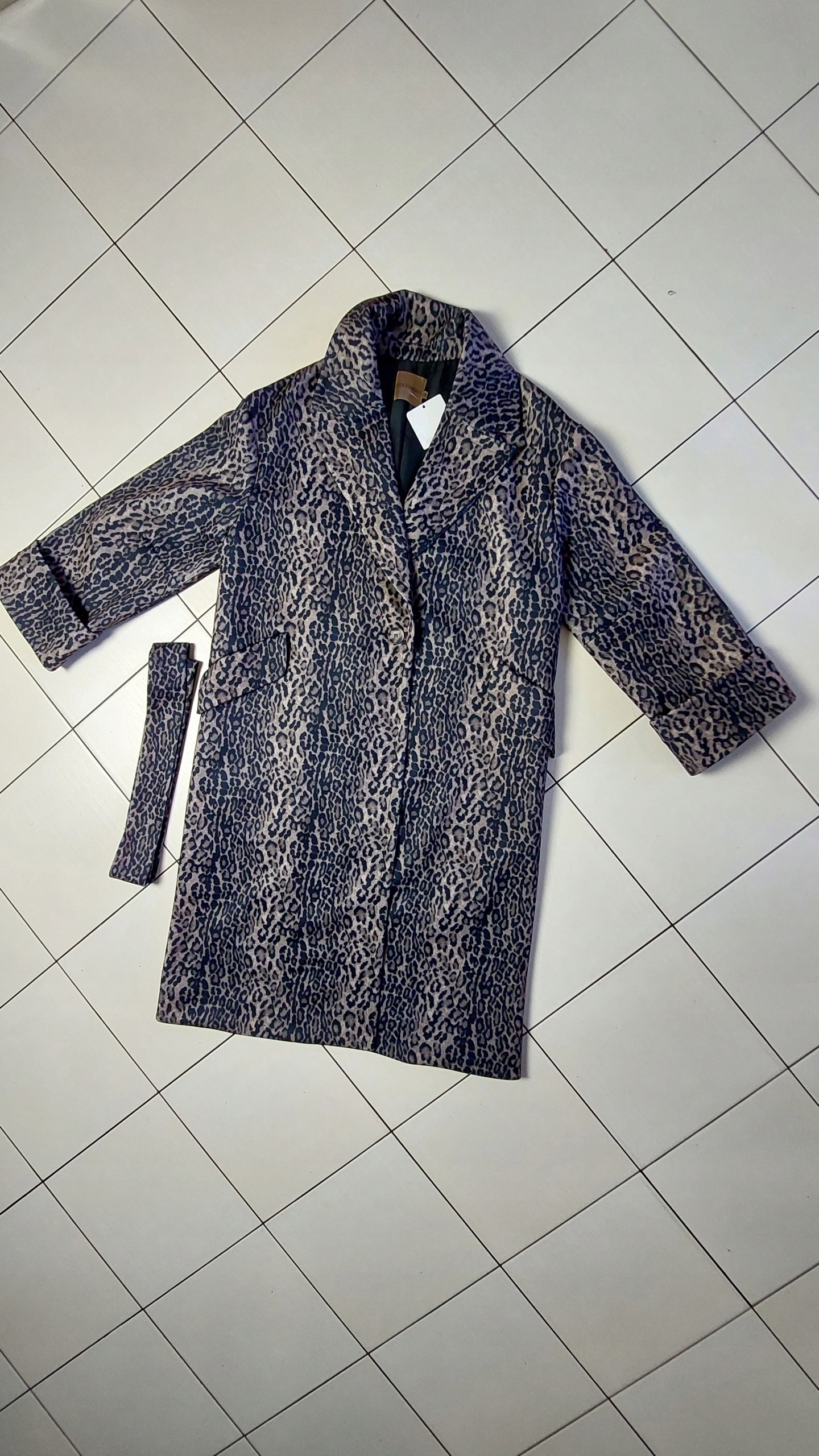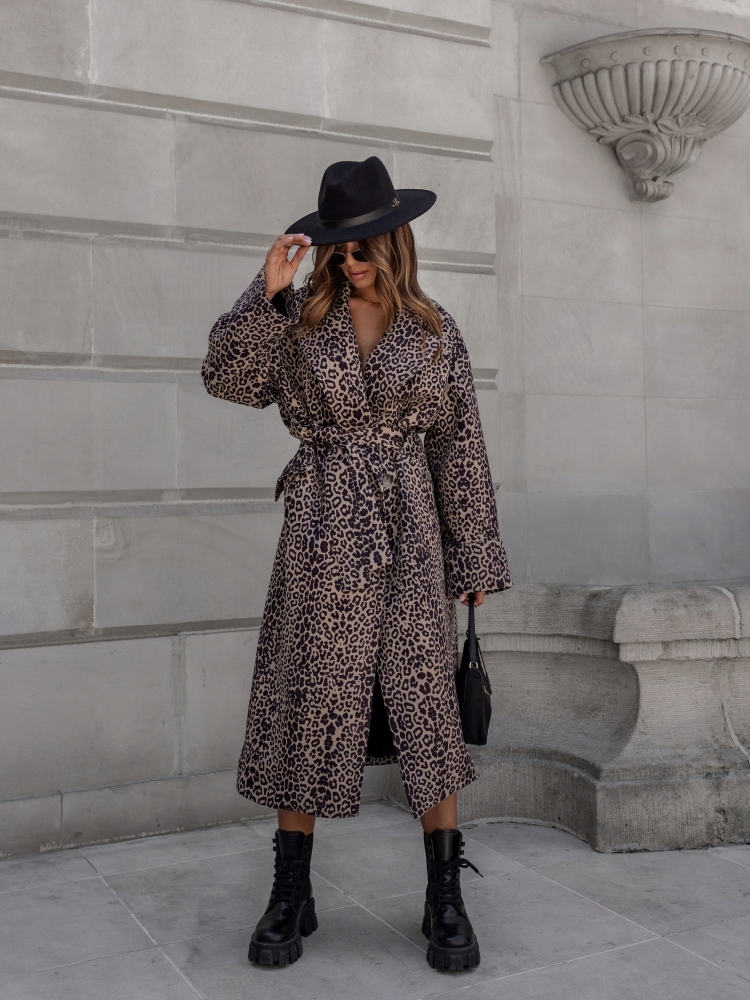 - Fantastyczny Płaszcz w modny zwierzęcy print. Zapinany na guzik oraz wiązany pasek z tego samego materiału. Posiada podszewkę, dwie kieszenie kieszenie, Szeroki kołnierz, wywinięte rękawy