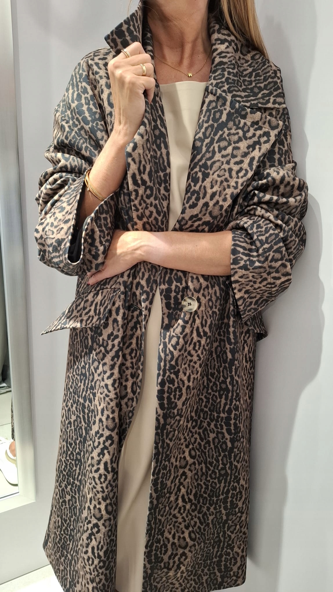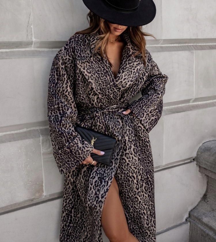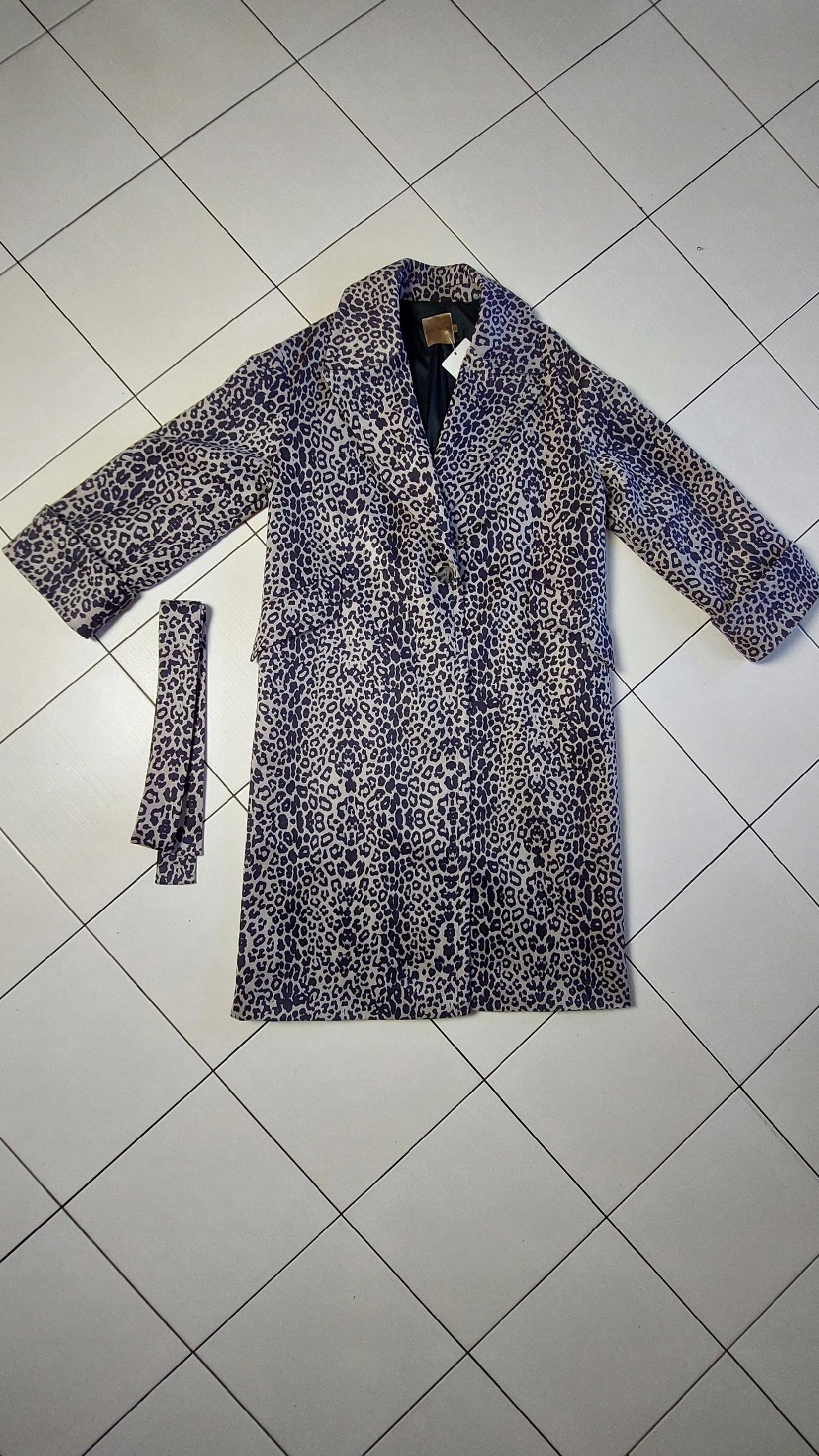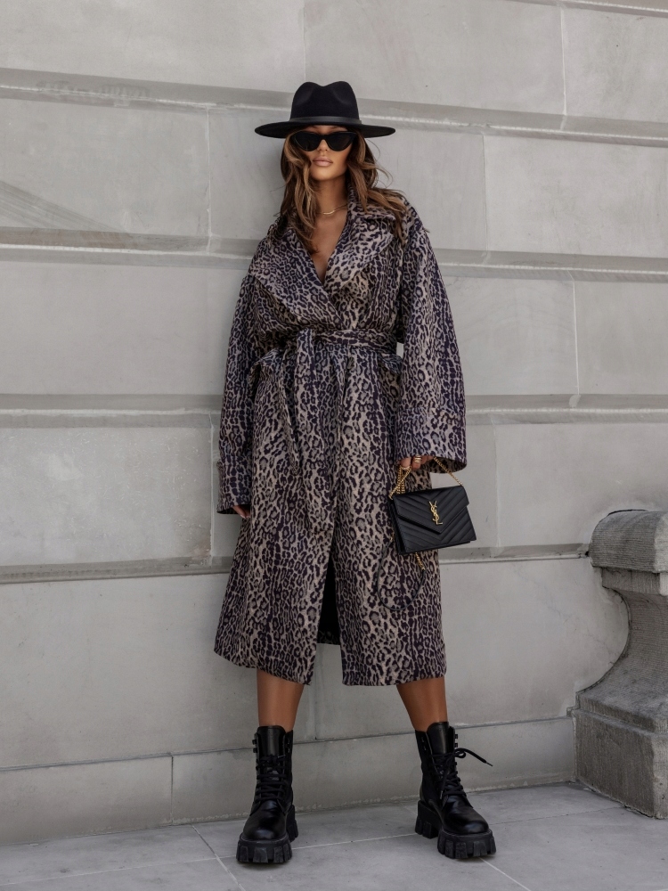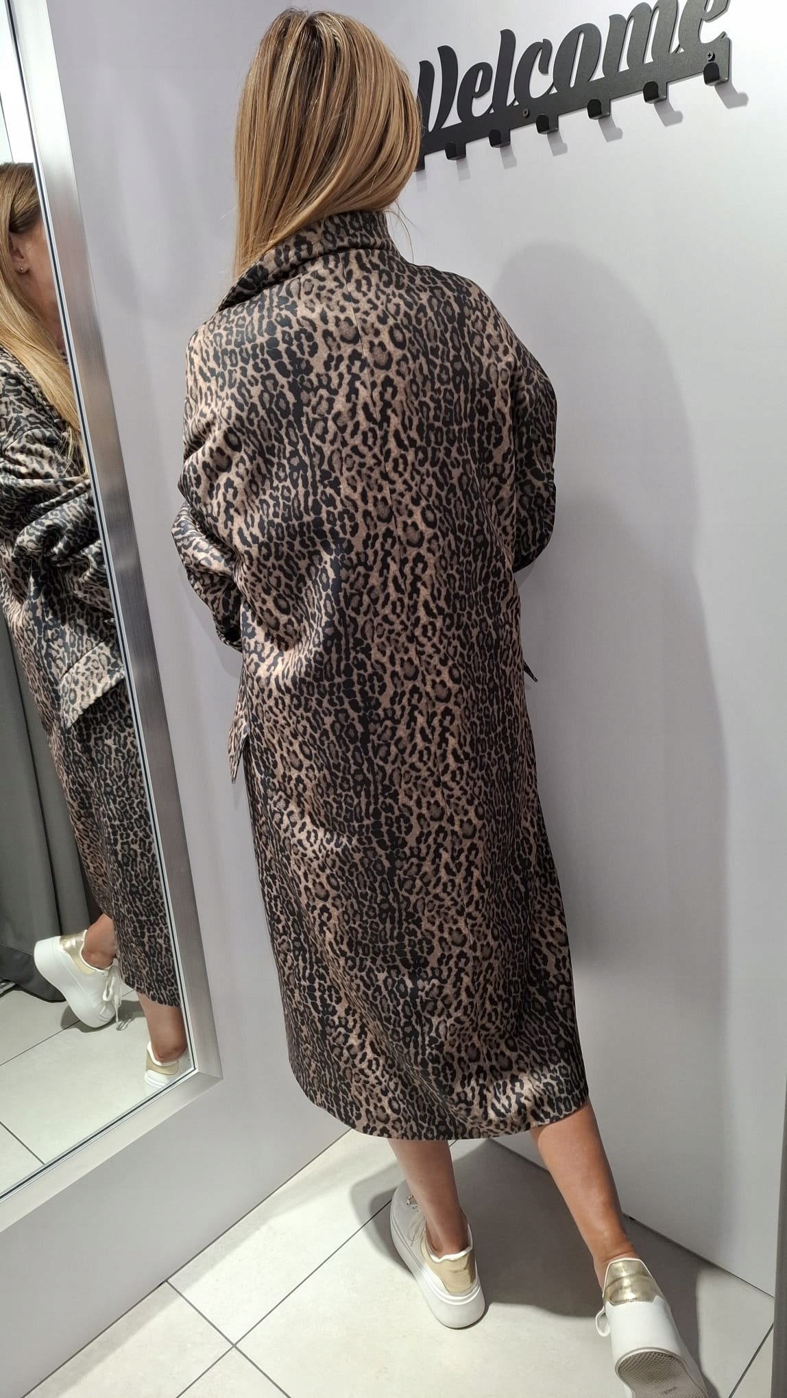- Fantastyczny Płaszcz w modny zwierzęcy print. Zapinany na guzik oraz wiązany pasek z tego samego materiału. Posiada podszewkę, dwie kieszenie kieszenie, Szeroki kołnierz, wywinięte rękawy