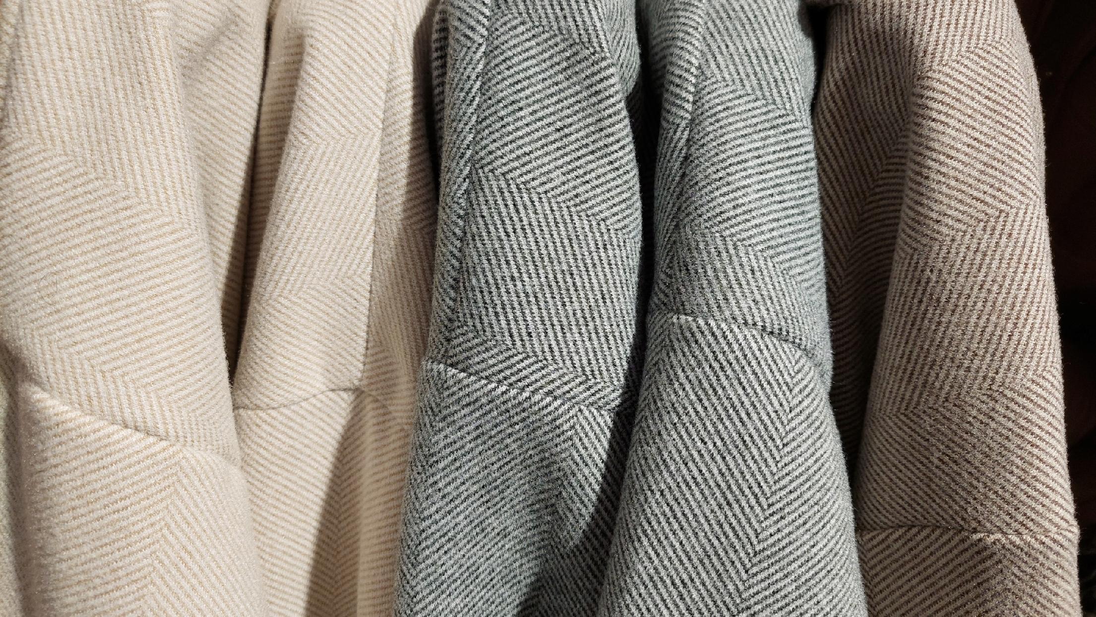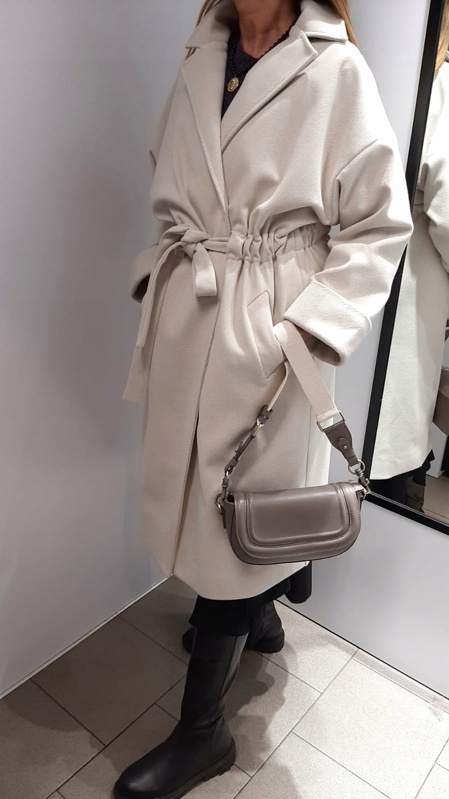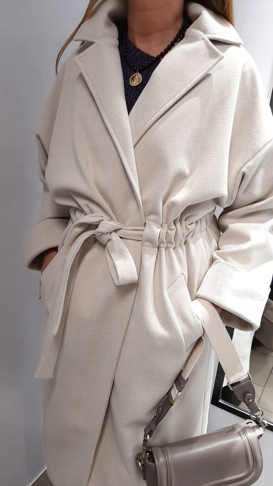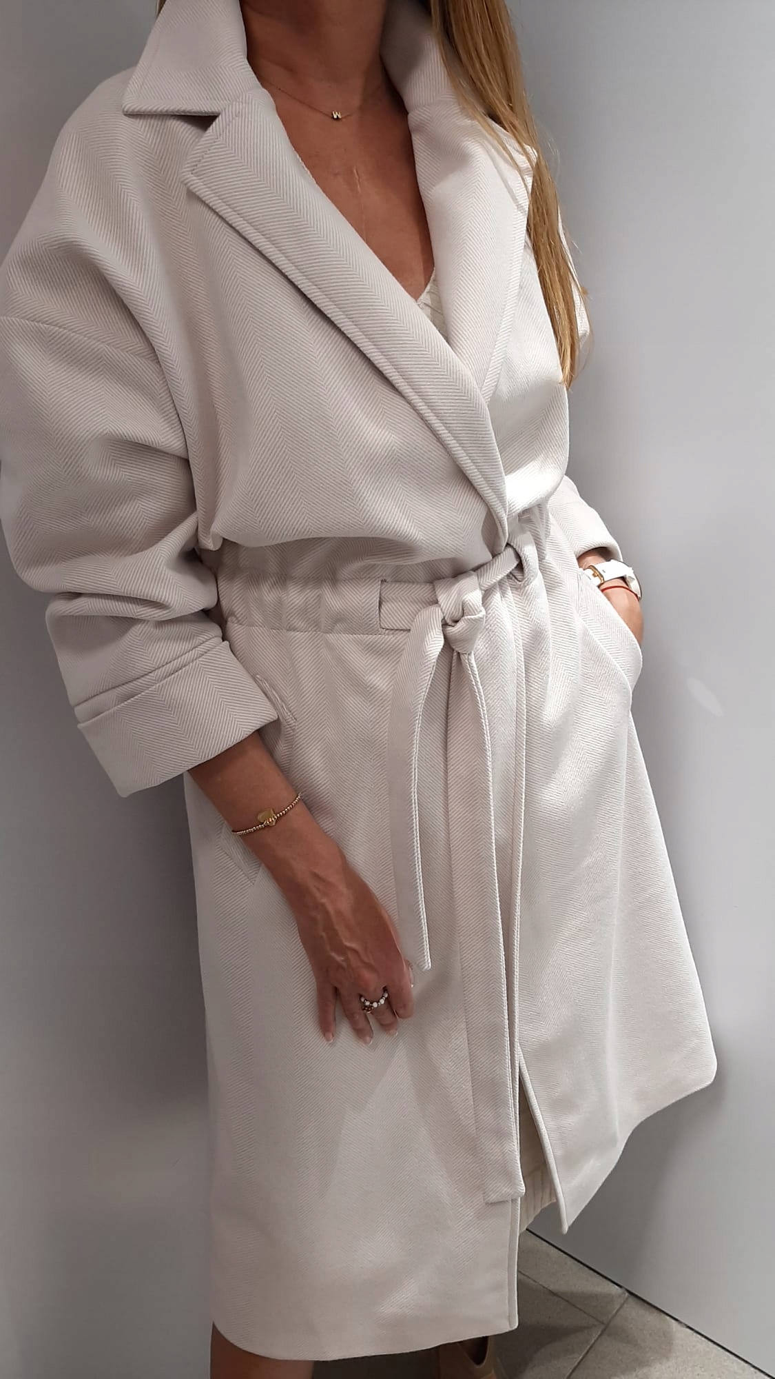 - Elegancki płaszcz, wykonany z wysokiej jakości materiału w jodełkę. W talii gumka oraz wiązanie. Dwie kieszenie. Wywinięte rękawy oraz podszewka