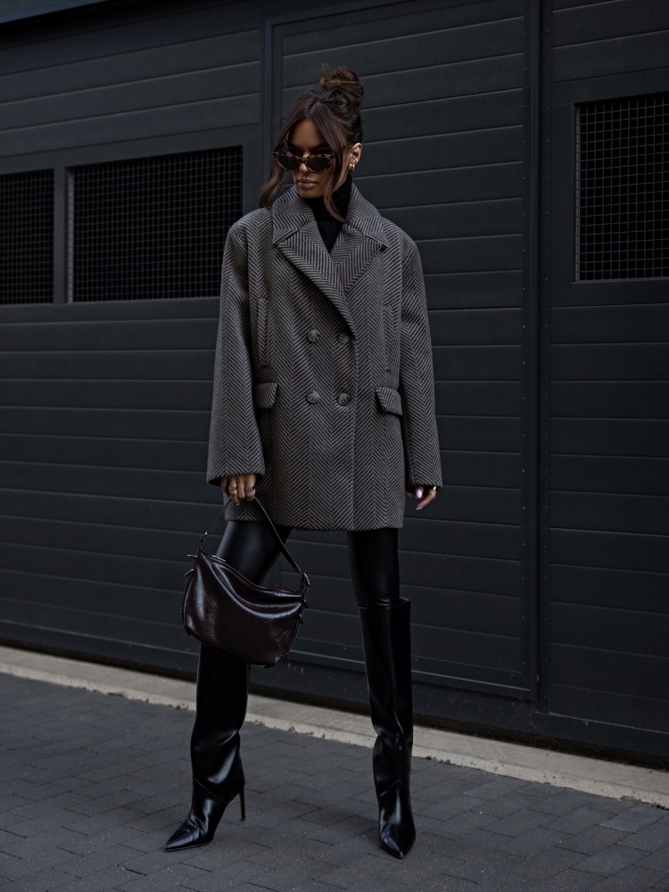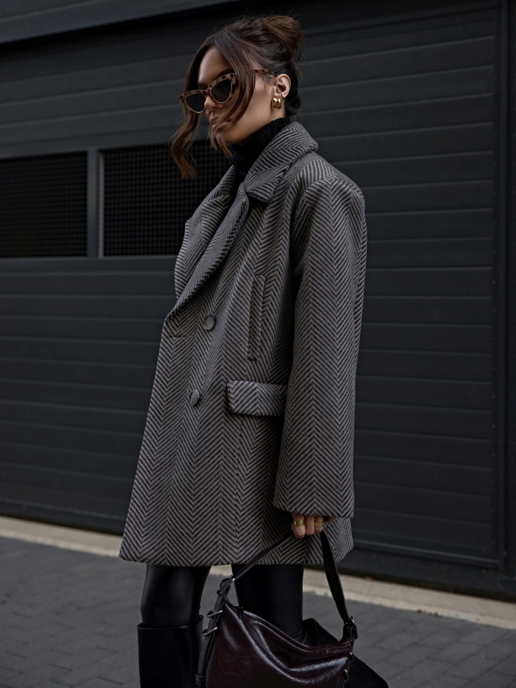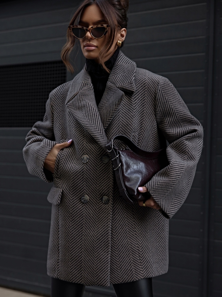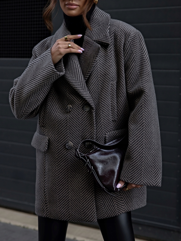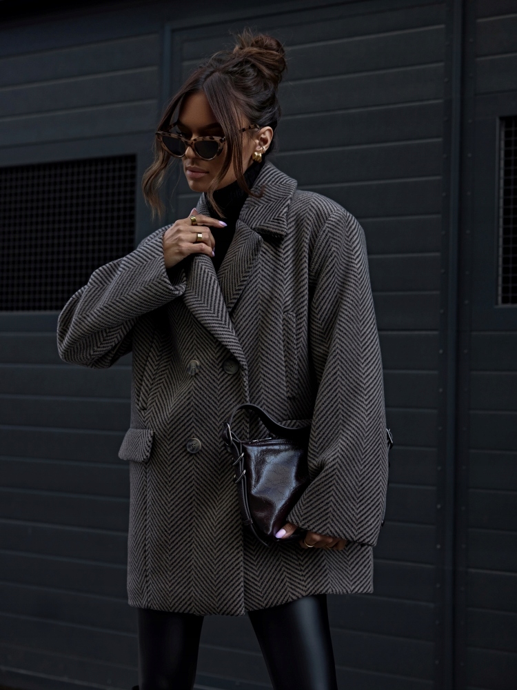 - Rewelacyjny oversize’owy płaszcz, wykonany z wysokiej jakości miłego i miękkiego materiału w jodełkę. Posiada kieszenie oraz podszewkę