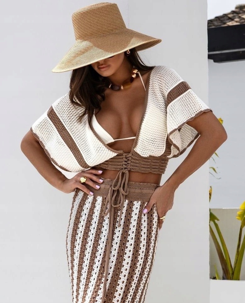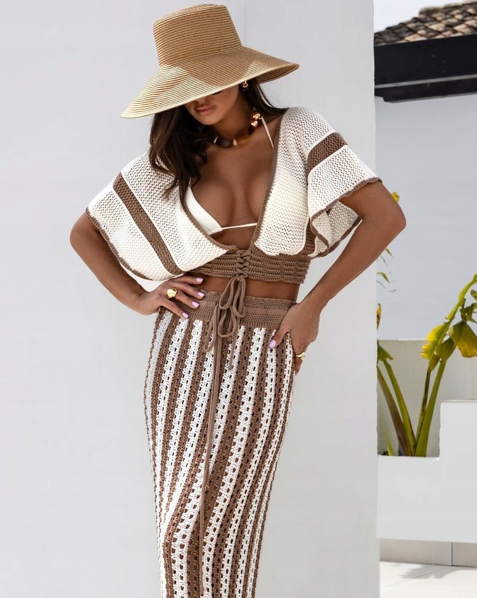 COCOMORE Ażurowa Spódnica w Pasy Camelowy + Ecru Nowość