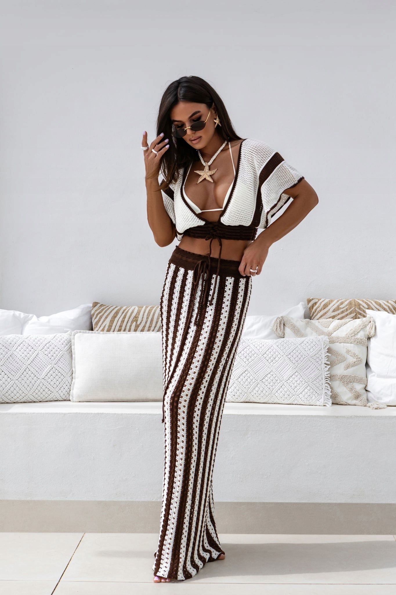 COCOMORE Ażurowa Spódnica w Pasy Ciemny Brązowy + Ecru Nowość