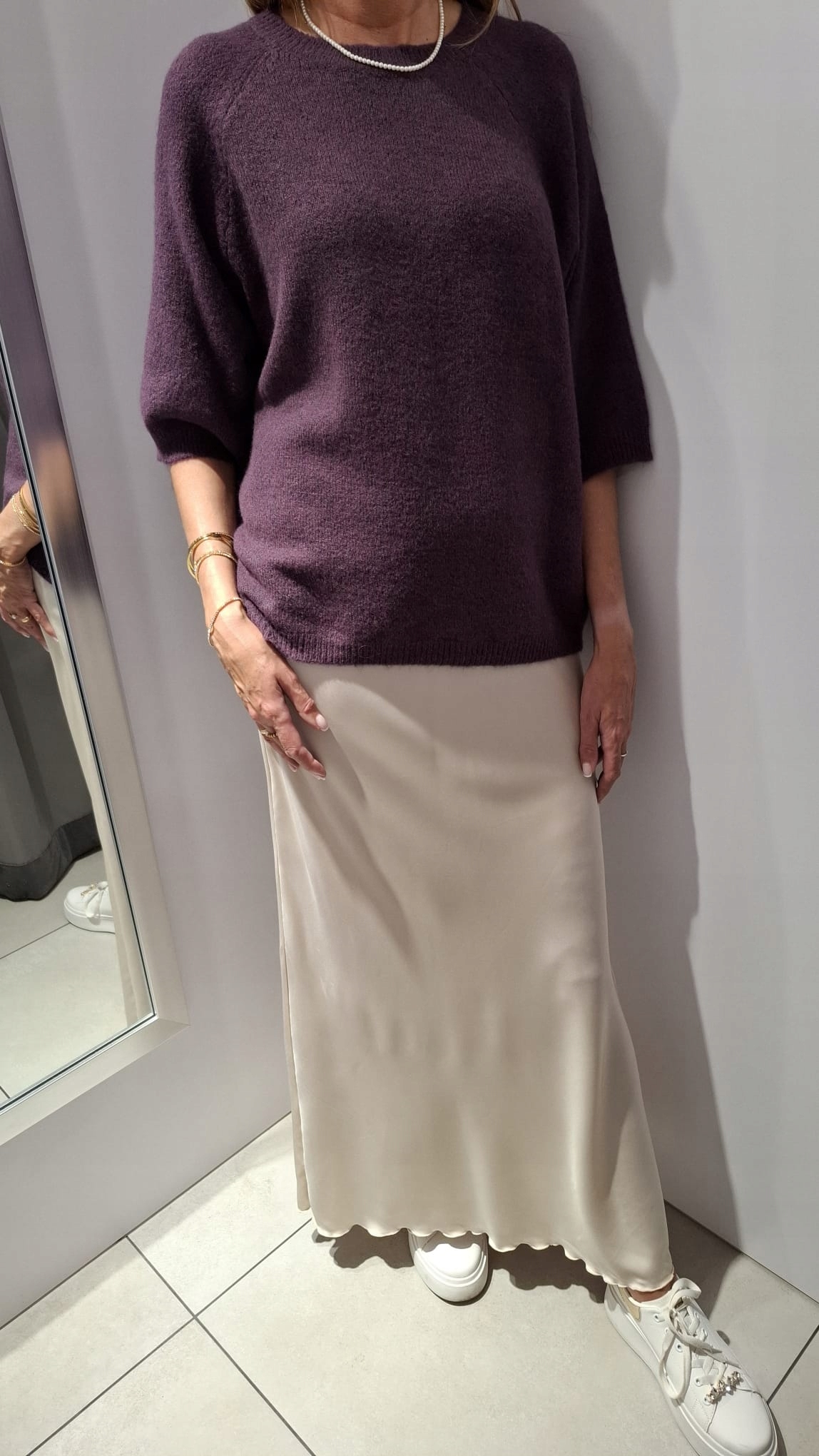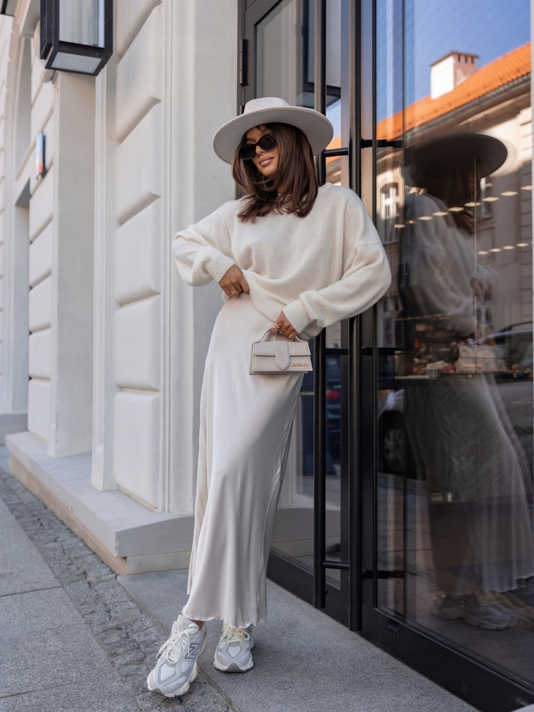 - Rewelacyjna satynowa spódnica. Rozkloszowany krój, długość maxi. Posiada w pasie gumkę. Sprawdzi się w wielu stylizacjach.
