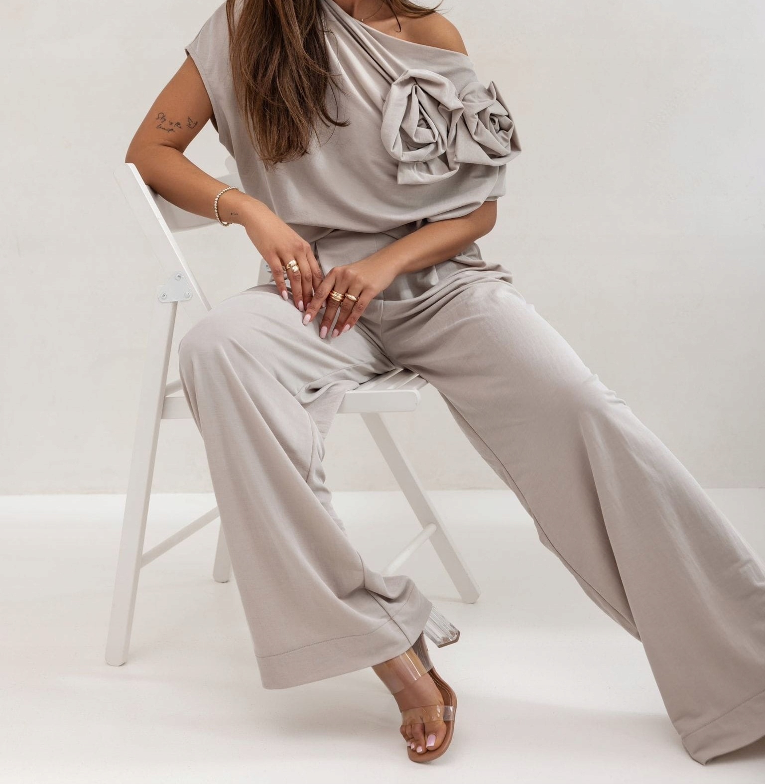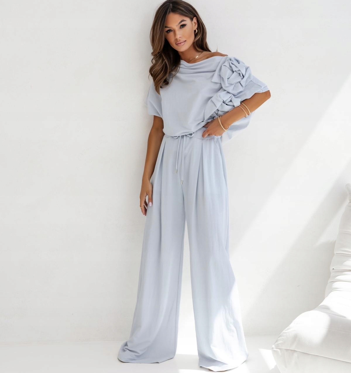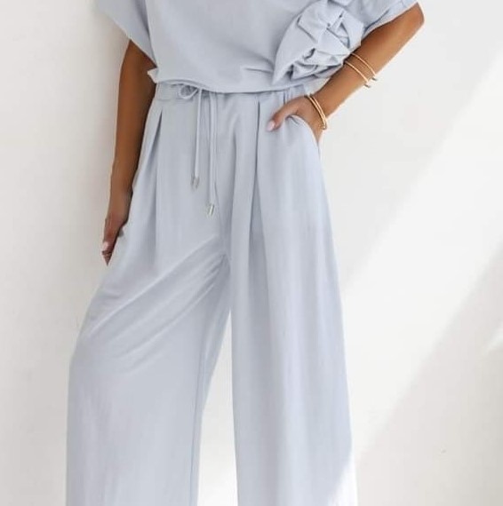 - Szerokie, luźne spodnie z rozszerzanymi nogawkami. Wysoki stan, na przodzie zaszewki. W talii ściągacz z dodatkowymi, wiązanymi tasiemkami. Po bokach dwie kieszenie. Skompletuj z bluzką lub marynarką