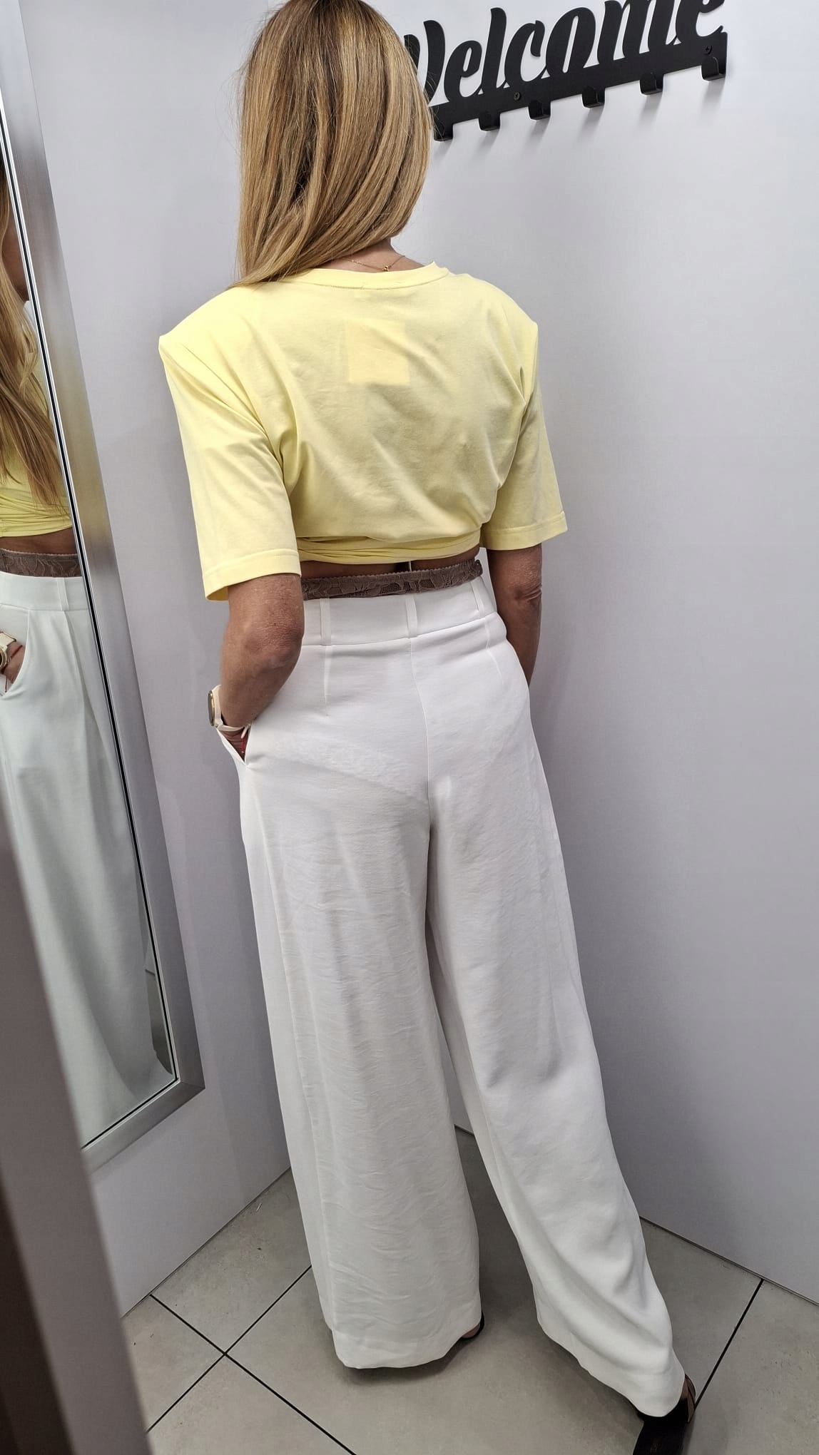 - Rewelacyjne szerokie spodnie. Wysoki stan, na przodzie zaszewki. Zapinane na zamek i guziki, dodatkowo w pasie znajdują się szlufki. Po bokach dwie kieszenie. W talii ozdobna koronka. Możliwość skompletowania z marynarką