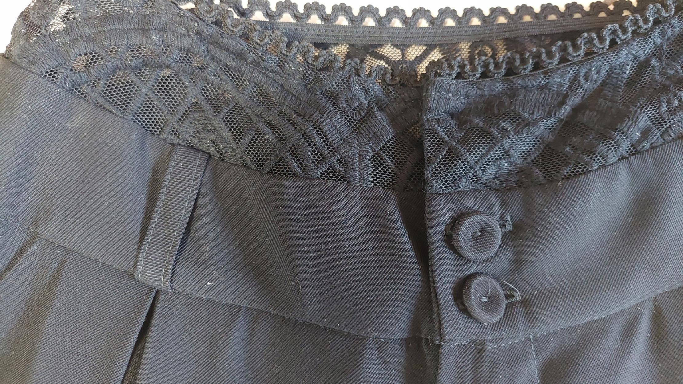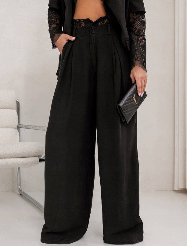 - Rewelacyjne szerokie spodnie. Wysoki stan, na przodzie zaszewki. Zapinane na zamek i guziki, dodatkowo w pasie znajdują się szlufki. Po bokach dwie kieszenie. W talii ozdobna koronka. Możliwość skompletowania z marynarką