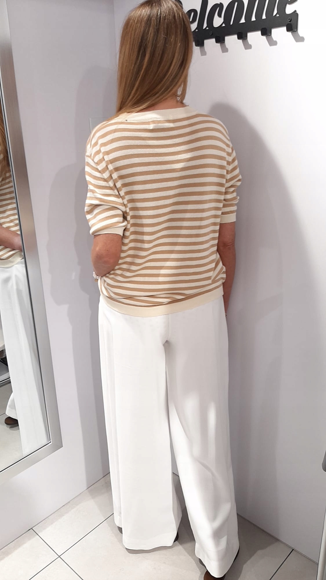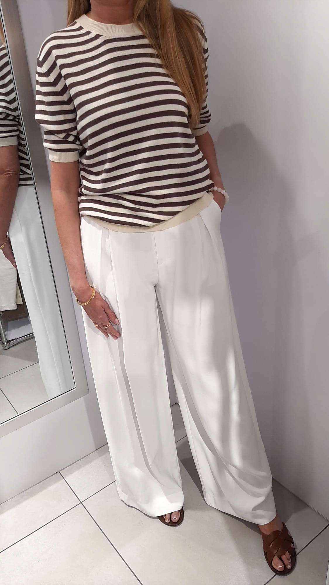 - Szerokie, luźne spodnie, na przodzie zaszewki. Zapinane na zamek i dwa wewnętrzne guziki, dodatkowo w pasie są szlufki. Po bokach dwie kieszenie. Sprawdzą się zarówno w elegancki jak i sportowych stylizacjach.