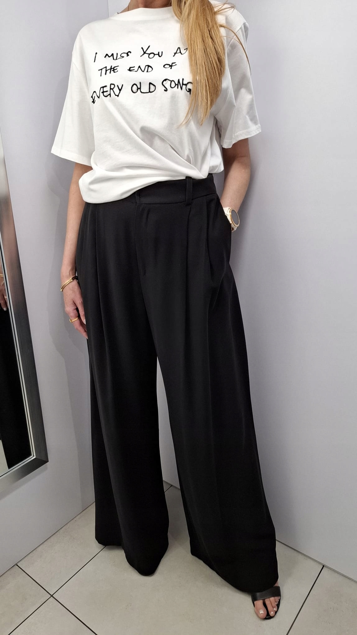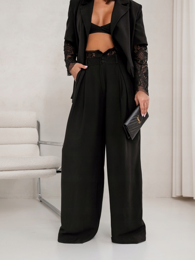 - Szerokie, luźne spodnie. Wysoki stan, na przodzie zaszewki. Zapinane na zamek i guzik, dodatkowo w pasie są szlufki. Po bokach dwie kieszenie. Sprawdzą się zarówno w elegancki jak i sportowych stylizacjach. Możliwość skompletowania z Marynarką