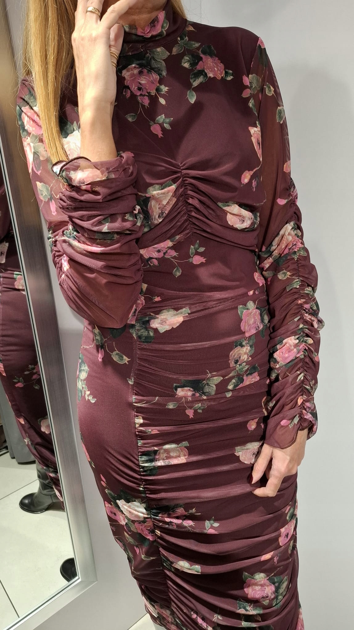 - Wyjątkowa sukienka w róże. Wykonana z elastycznego materiału. Półgolf z zapięciem z tyłu na dwa guzki. Na przodzie marszczenia.