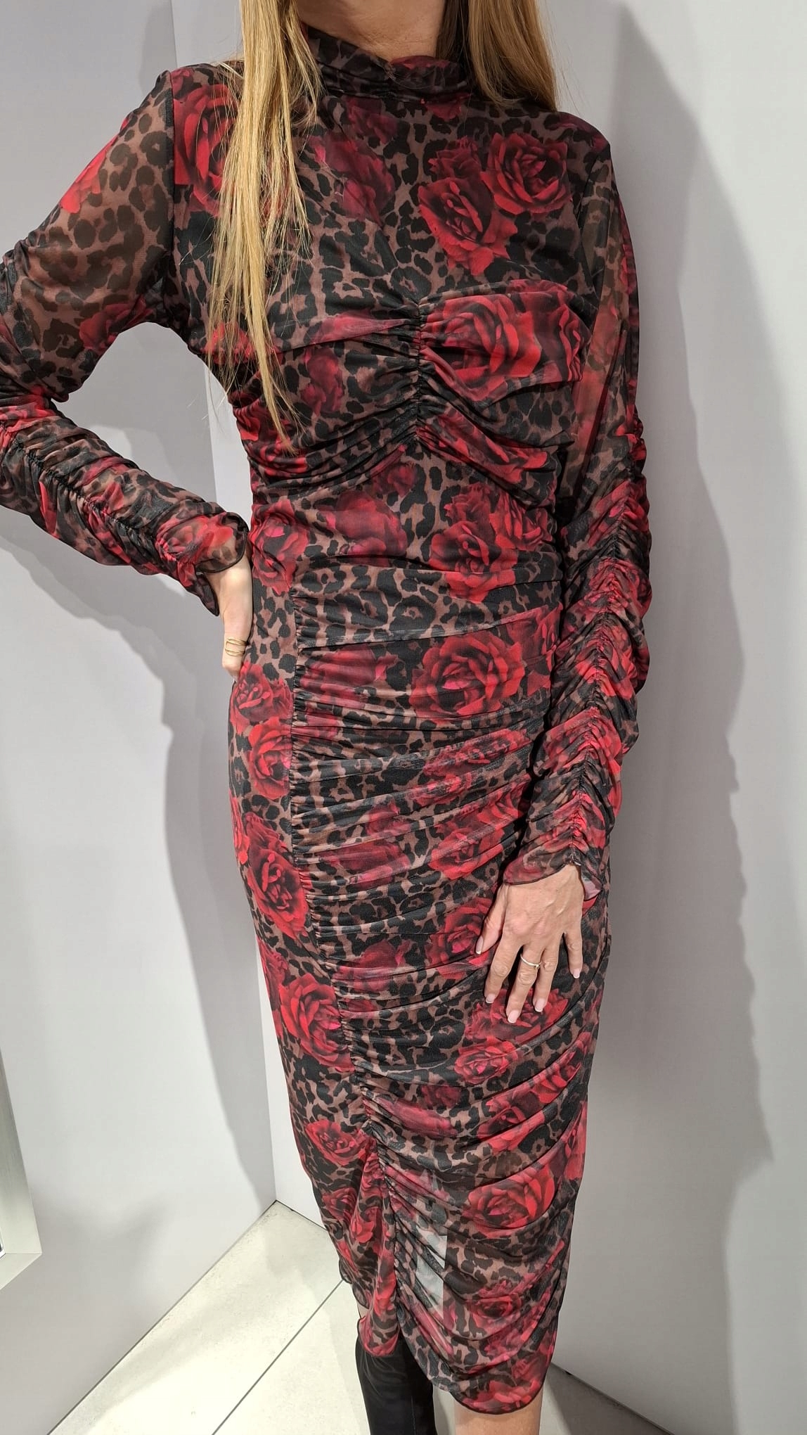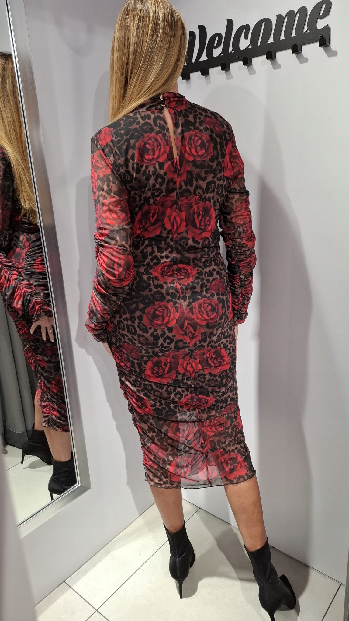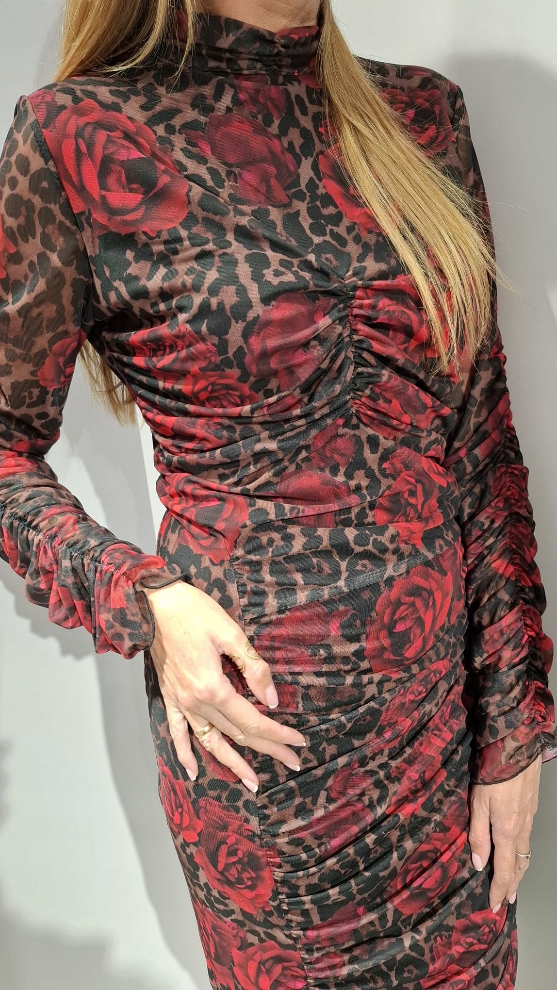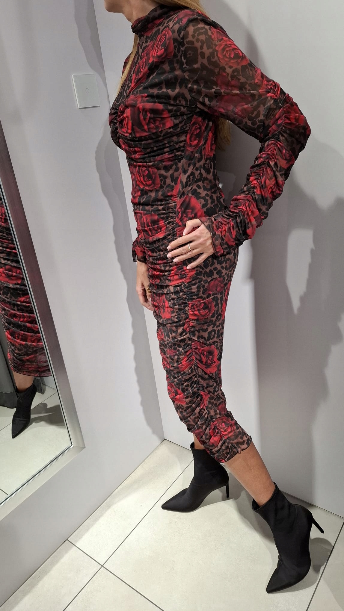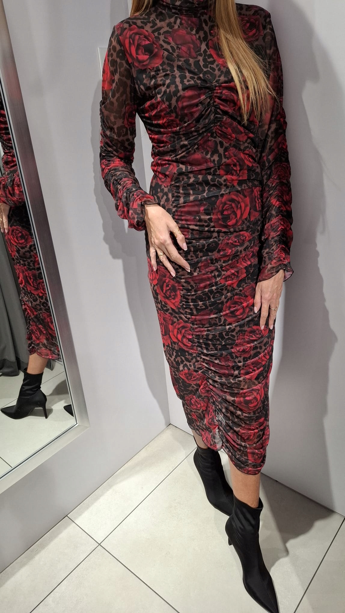 - Wyjątkowa sukienka w modny print róże połączone z panterką. Wykonana z elastycznego materiału. Półgolf z zapięciem z tyłu na dwa guzki. Na przodzie i na rękawach marszczenia.