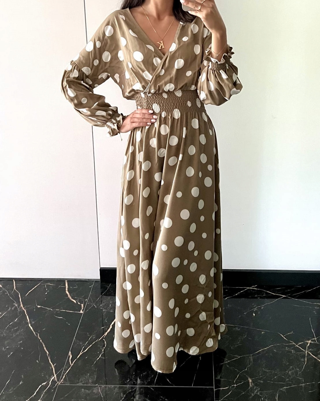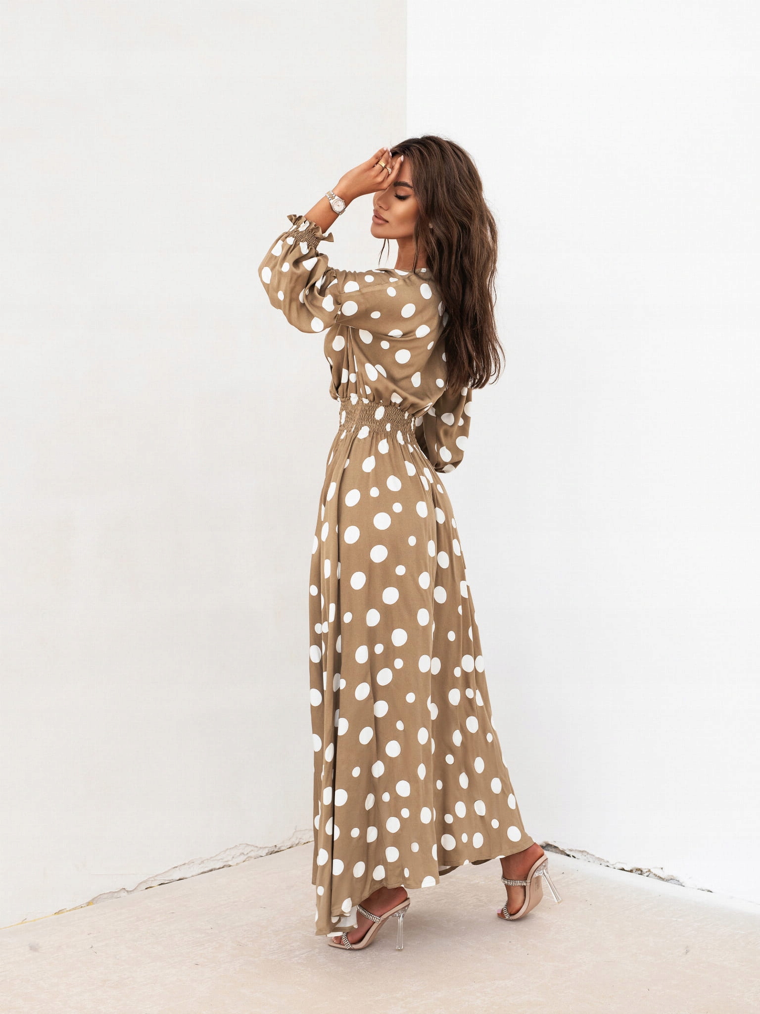 - Wyjątkowa sukienka o długości maxi. Kopertowy dekolt. W tali szeroka gumka. Bufiaste rękawy zakończone falbanką z gumką. Dodatkowo sukienka ma dwie kieszenie oraz rozcięcie na boku