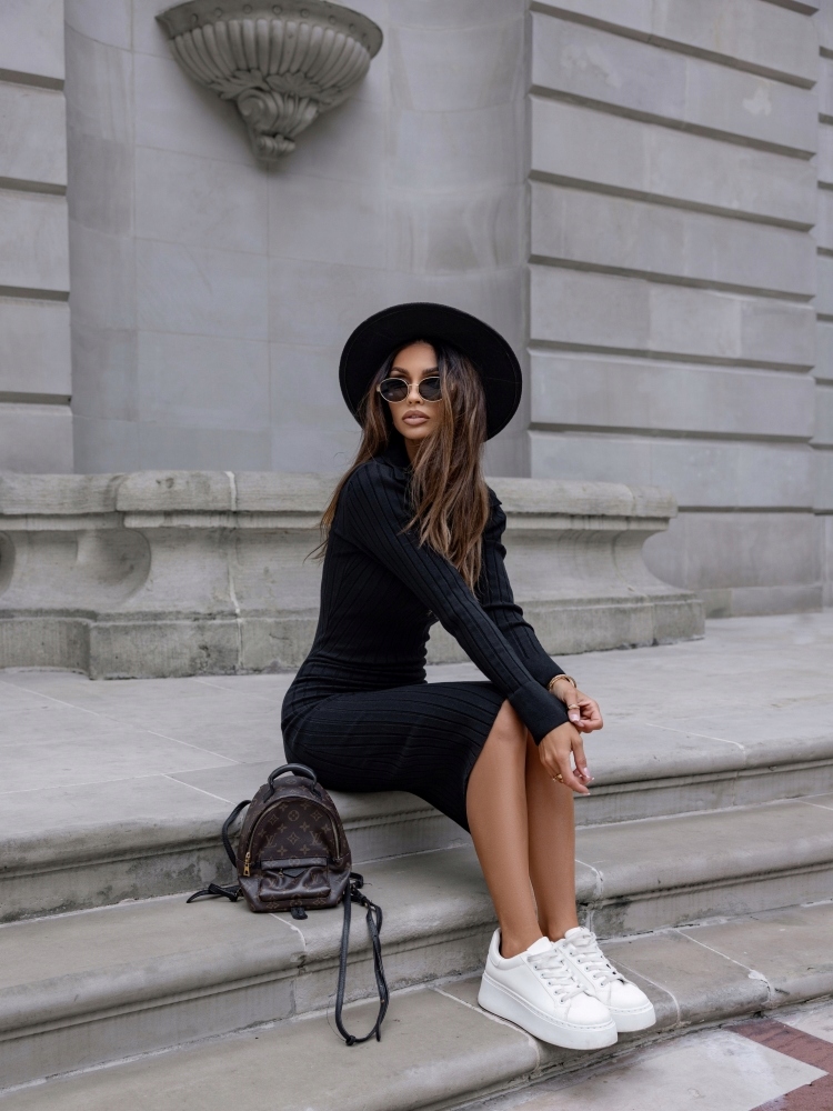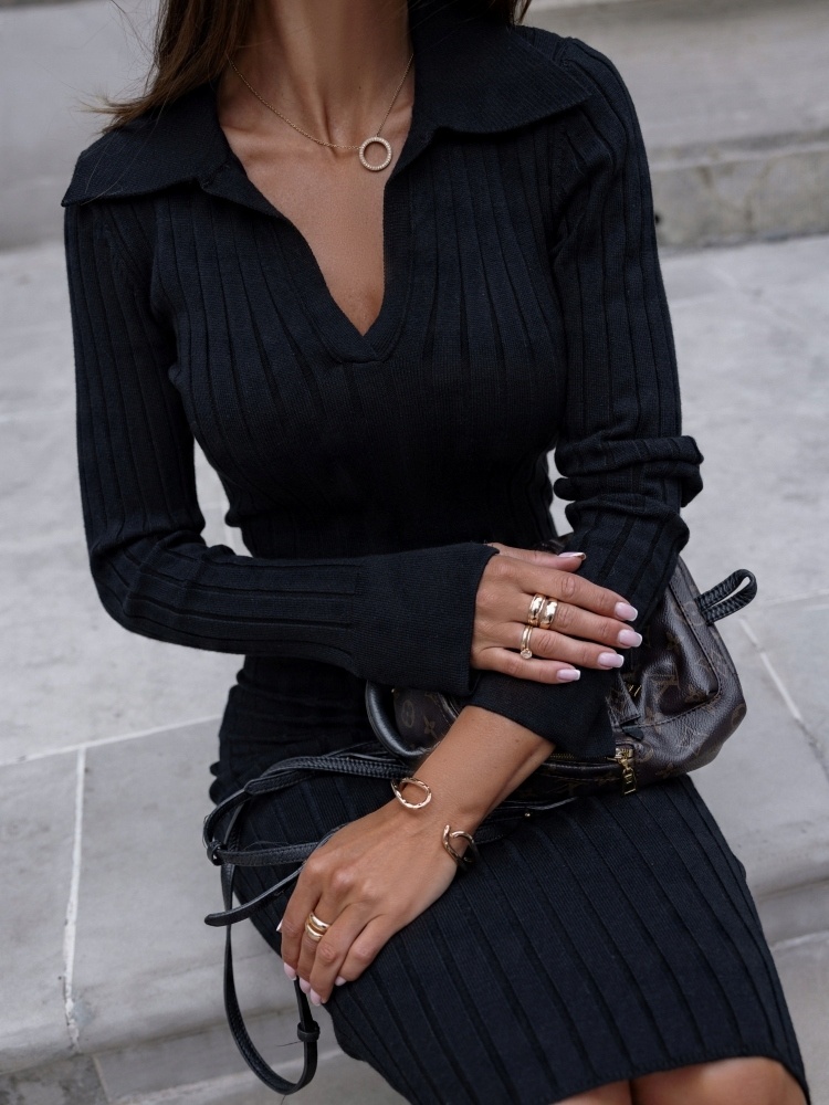 - Rewelacyjna prążkowana sukienka, wykonana z wysokiej jakości elastycznej dzianiny. Szyku dodaje taliowany krój oraz dekolt V z szerokim kołnierzykiem. Dodatkowym atutem są rękawy z rozciętym ściągaczem, który można wywinąć.