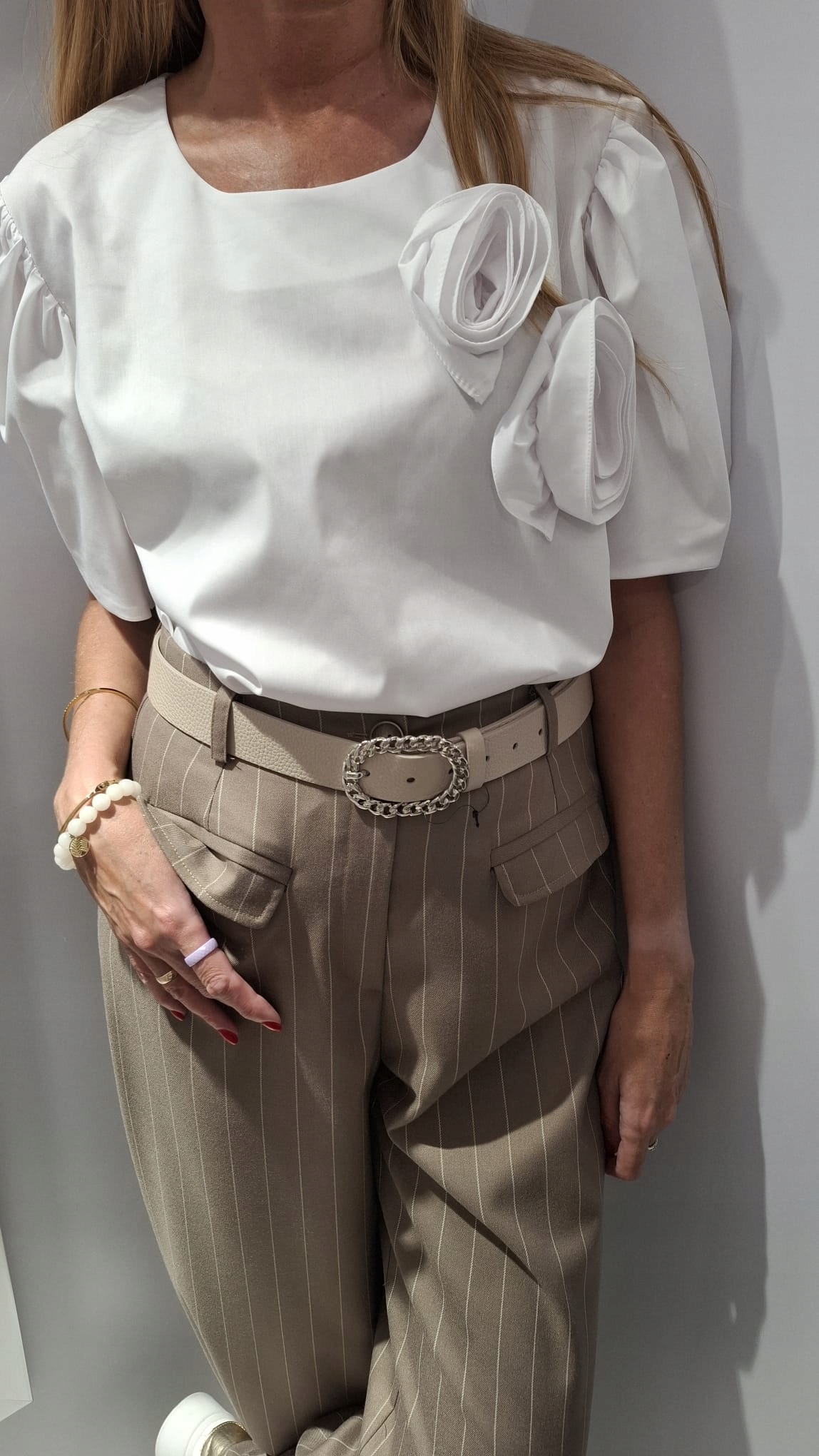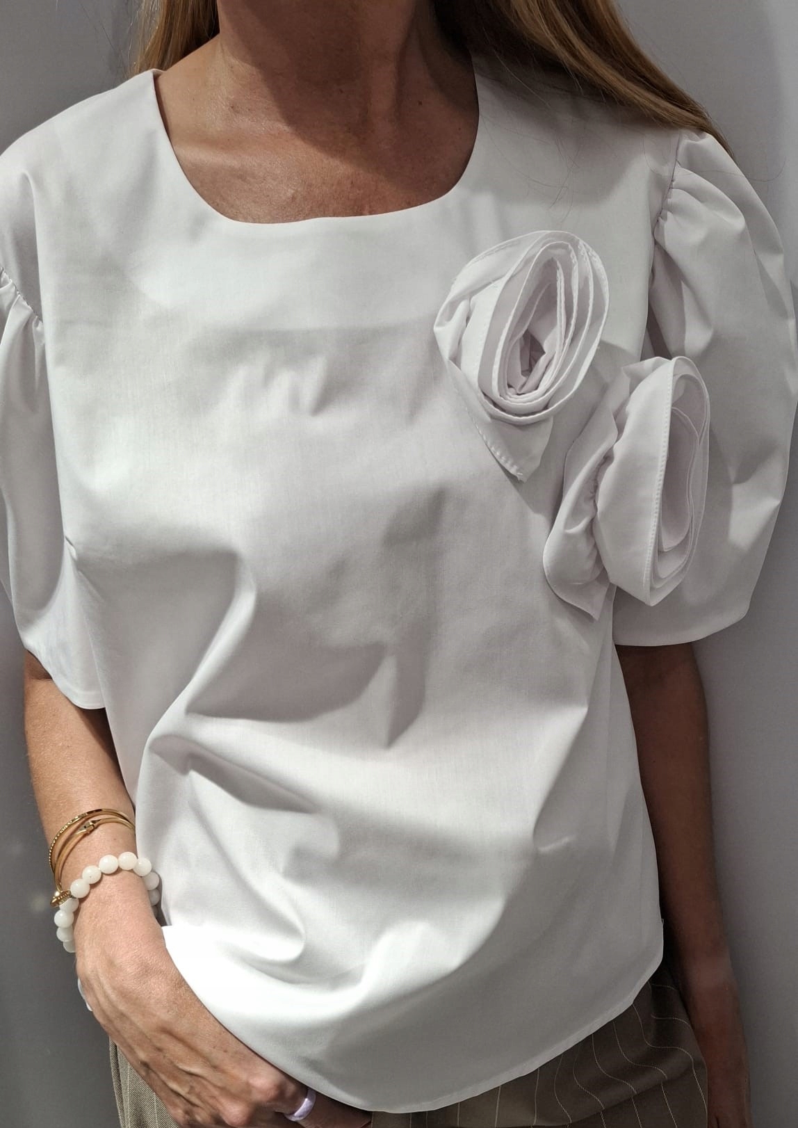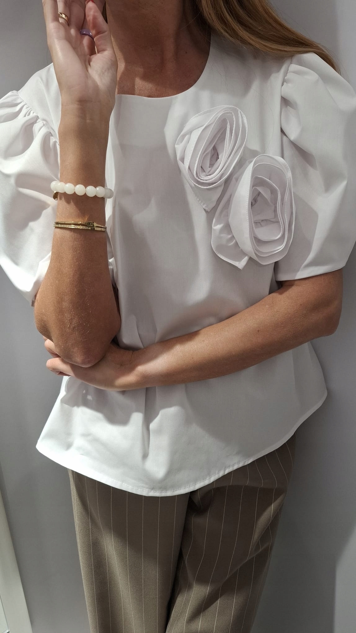 - Rewelacyjna bluzka, wykonana z koszulowego materiału. Charakteru nadają bufiaste rękawy oraz ozdobne kwiaty z tego samego materiału, przypinane na agrafkę. Dodatkowo na przodzie znajduje się blaszka z logo producenta. Z tyłu na górze zapięcie na guzik. Luźny krój zapewni wygodę