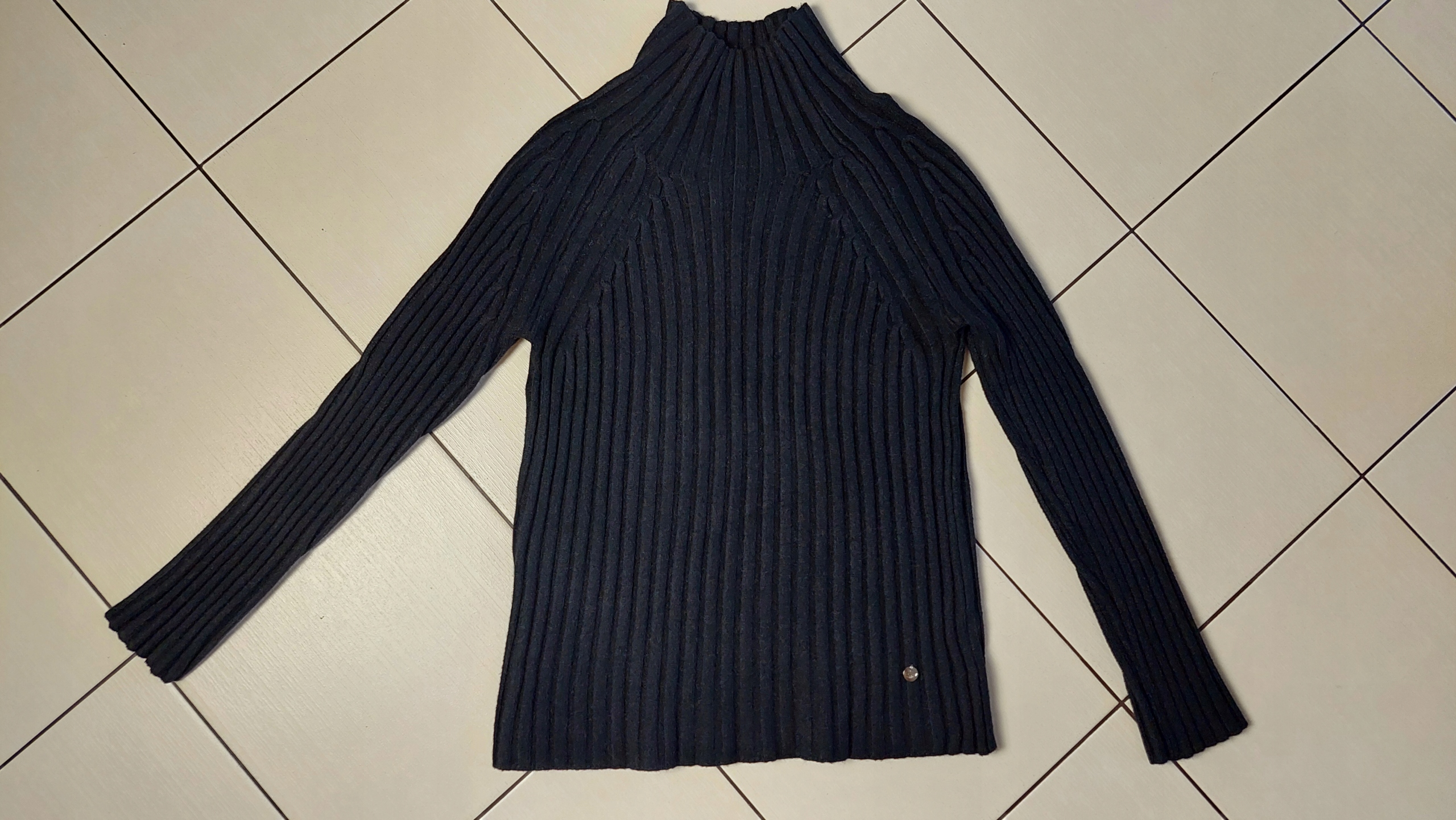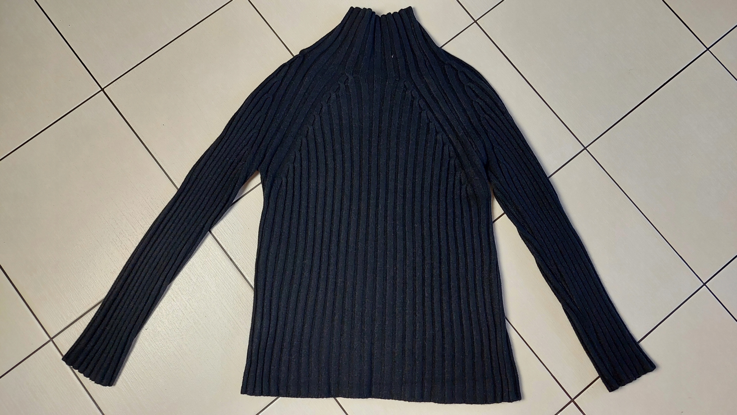 - Półgolf w pionowe prążki. Wykonany z milutkiej i mięciutkiej przędzy. Na przodzie znajduje się mała blaszka z logo producenta