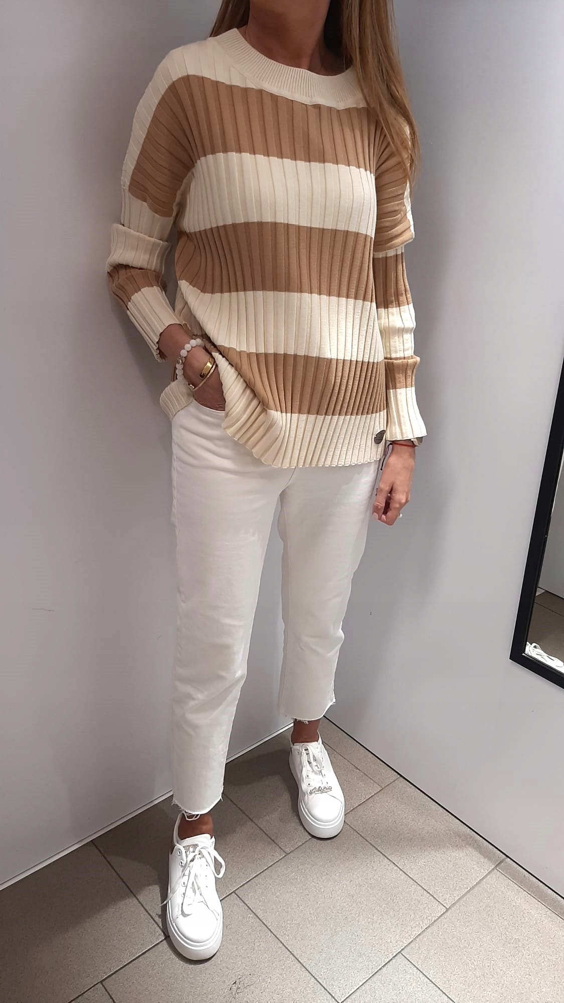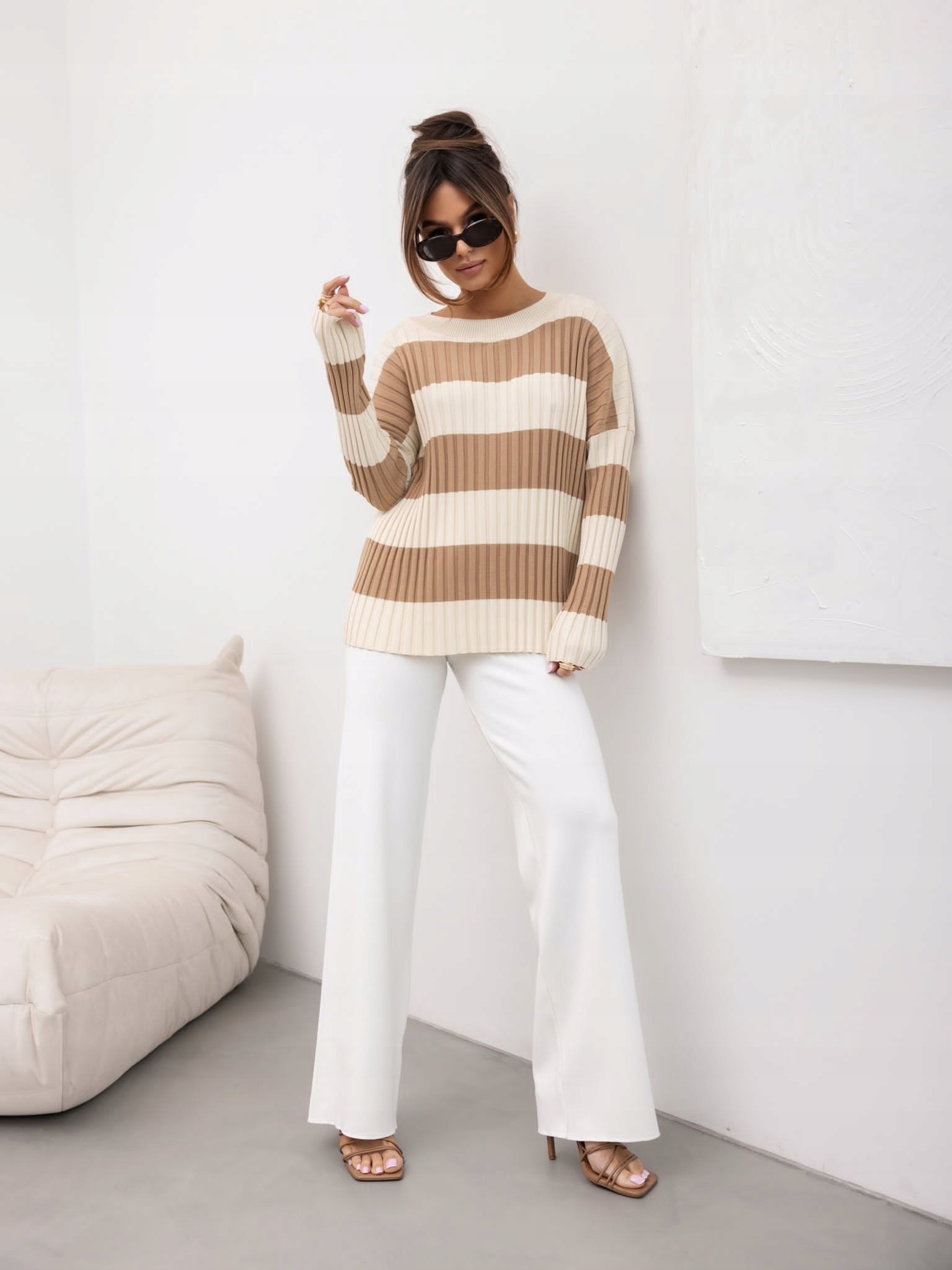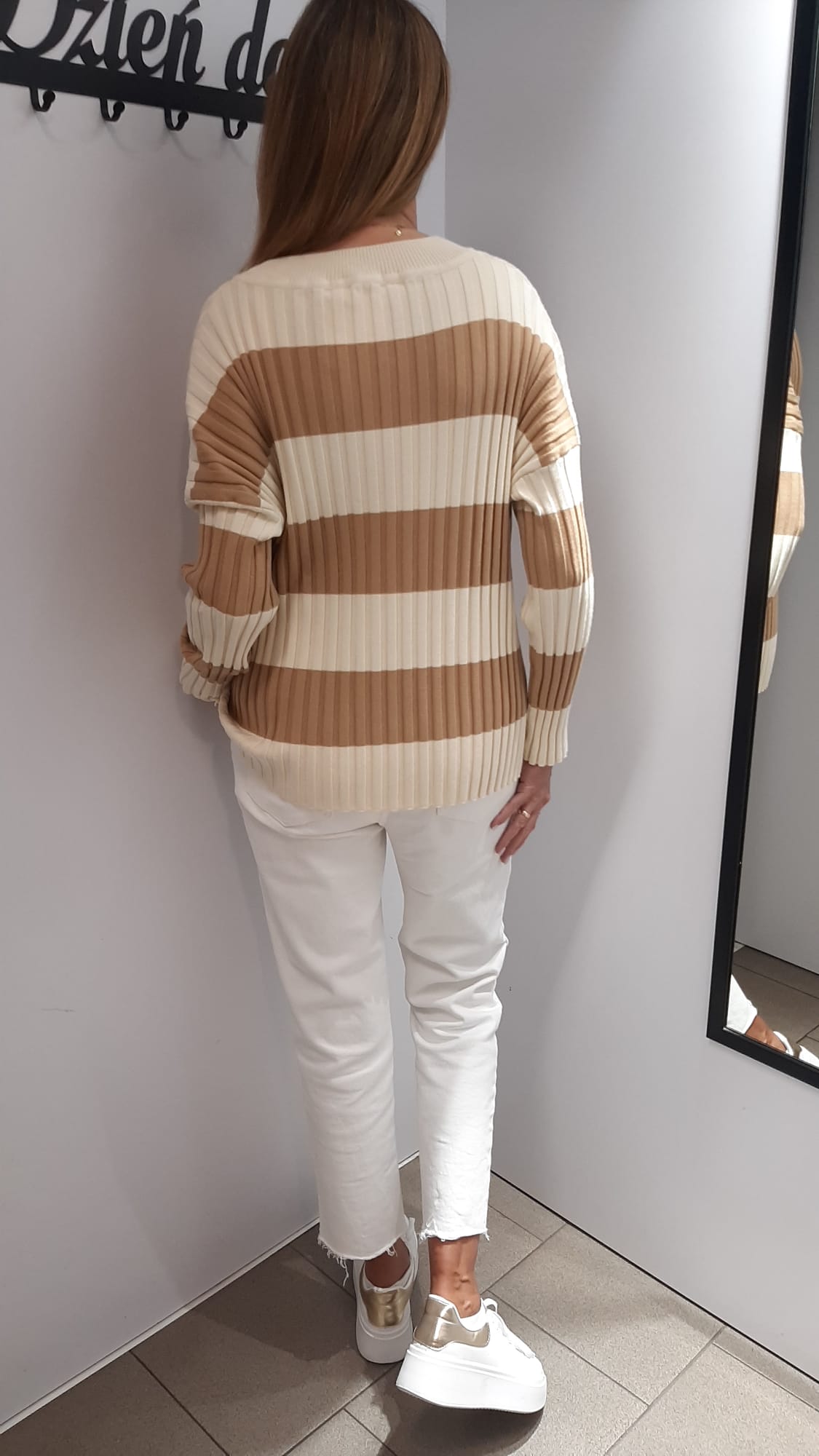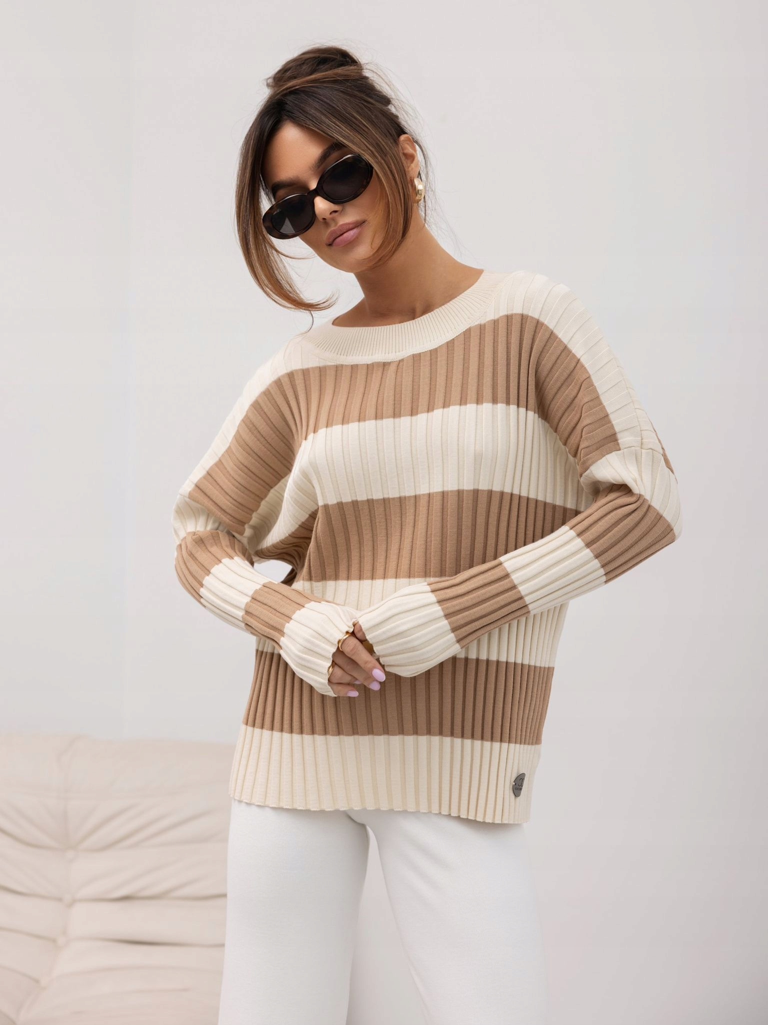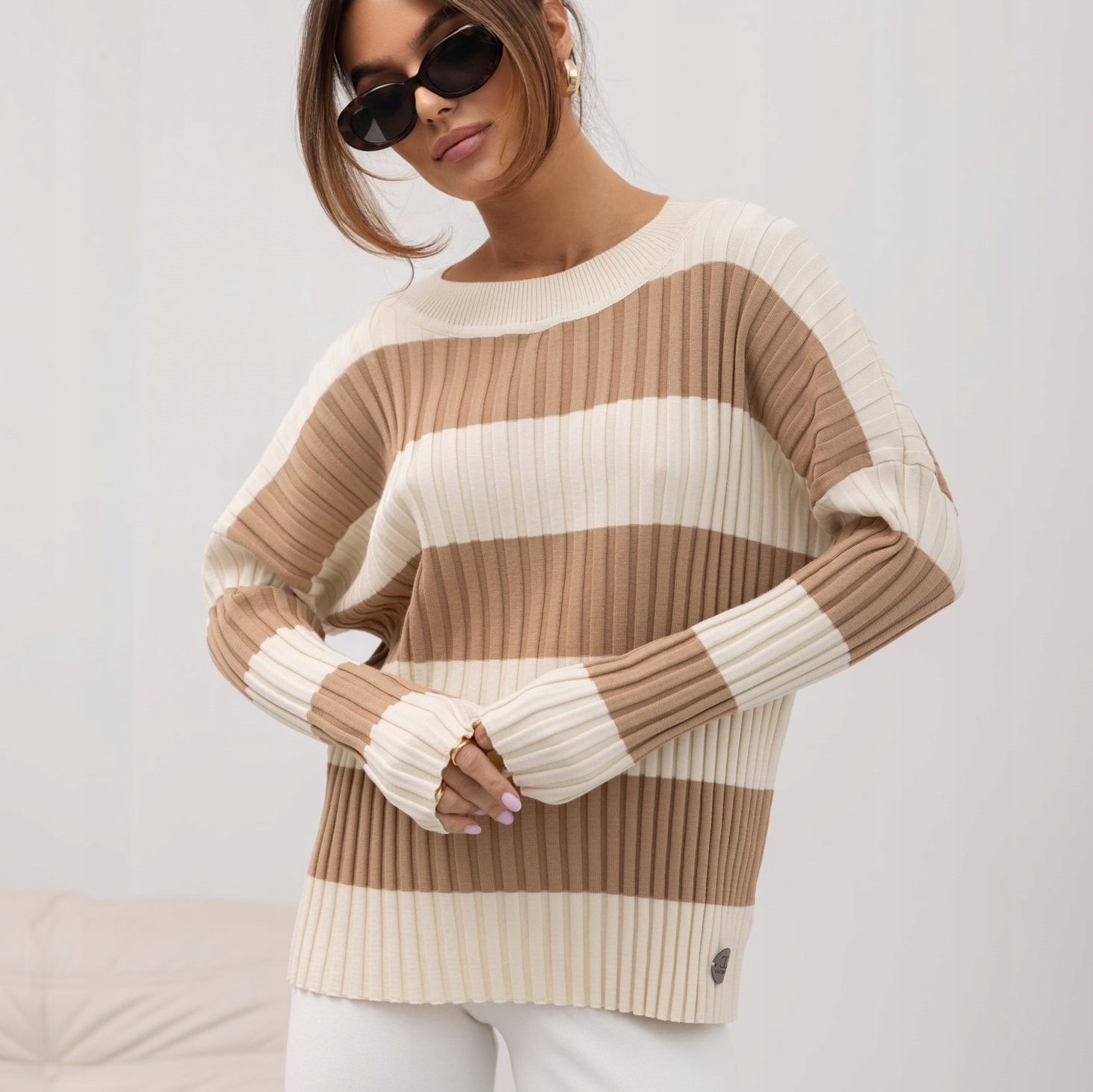 COCOMORE Prążkowany Sweter w Pasy Camelowy + Beżowy Nowość