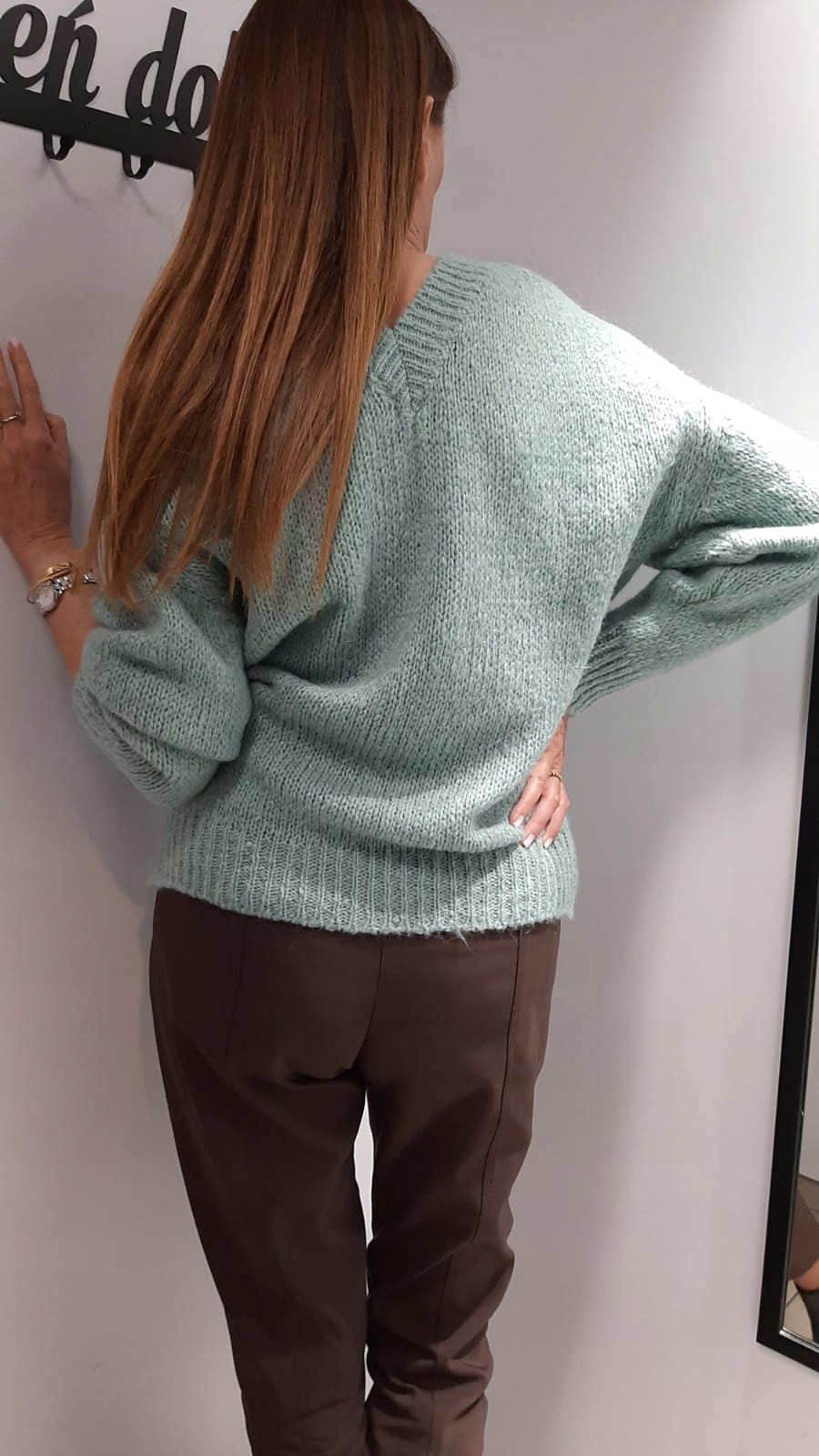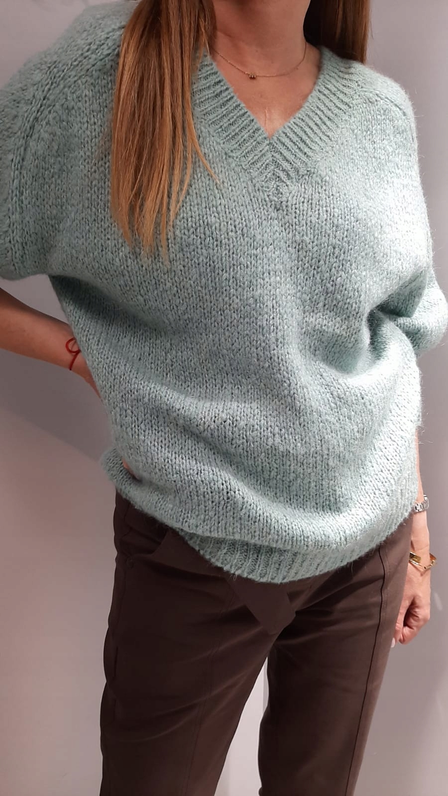 - Ponadczasowy sweterek z dekoltem V z przodu i z tyłu. Mięciutki i milutki w dotyku. Cienka włóczka