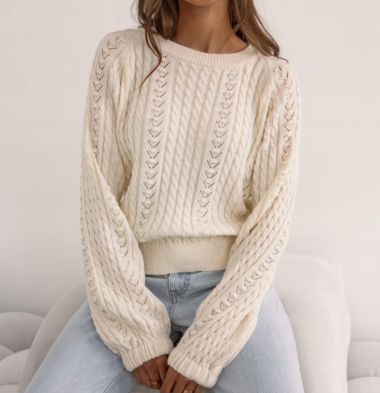 - Wyjątkowy ażurowy sweterek ze ściągaczami oraz bufkami na rękawach.