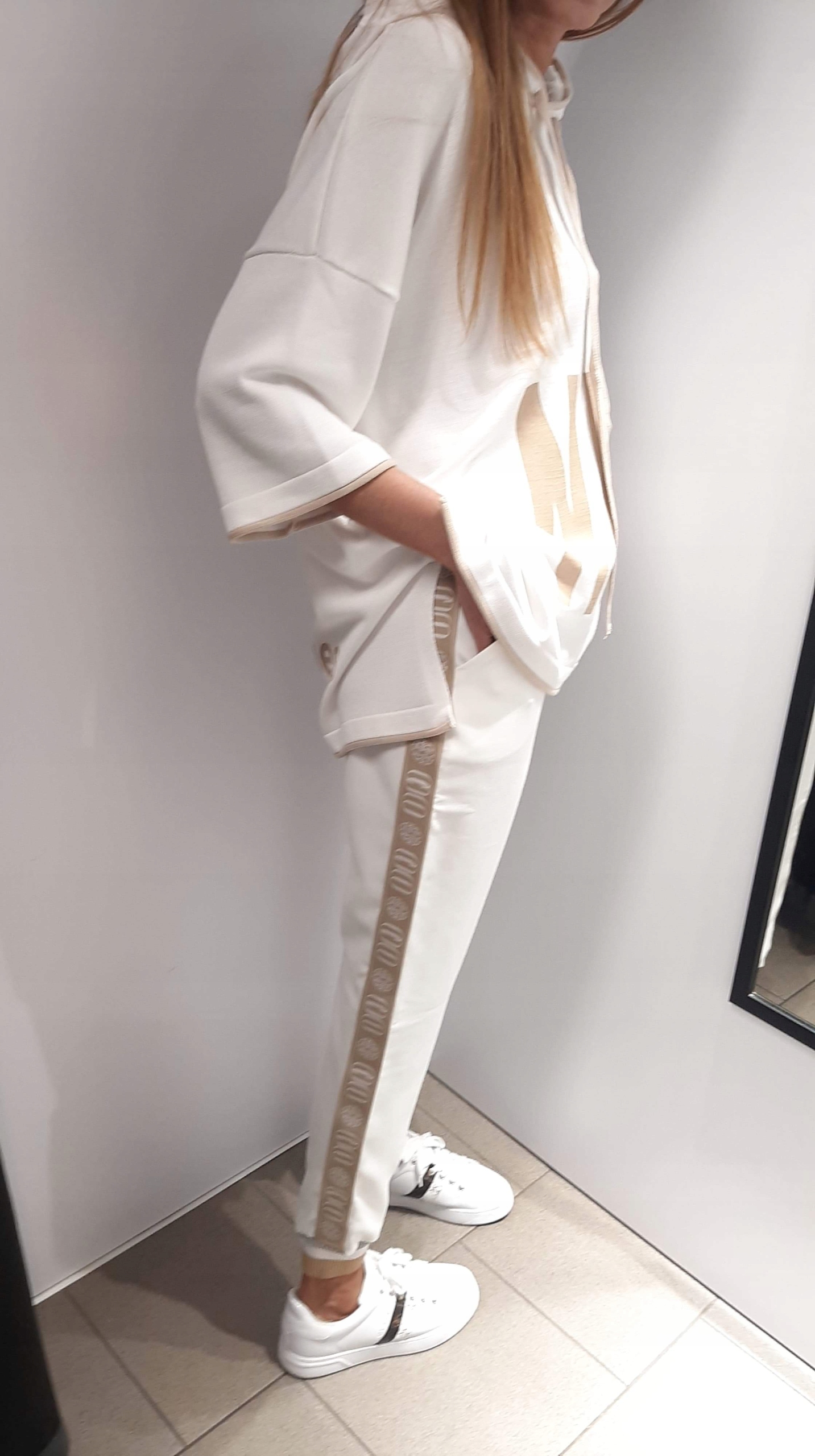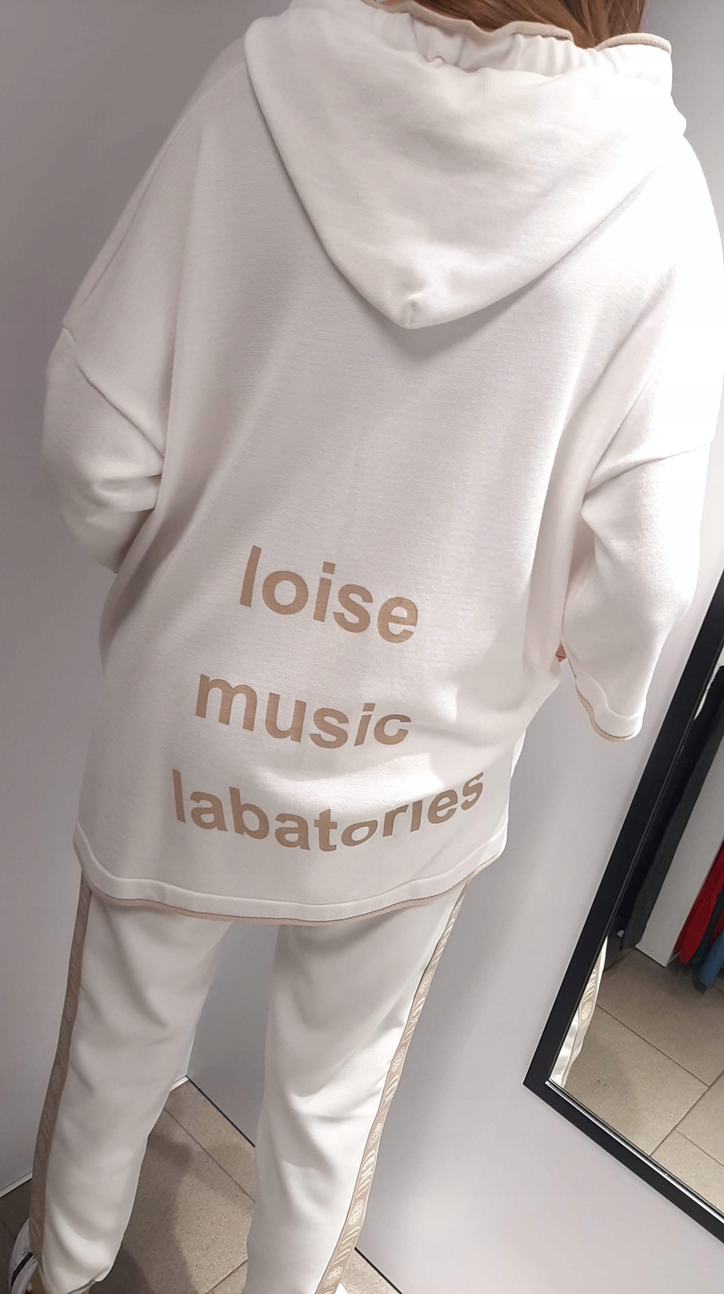 - Fantastyczna sweterkowa bluza NML w modnych biało-beżowych barwach. U góry znajduje się obszerny kaptur i ozdobne taśmy. Charakteru dodają nadruki.