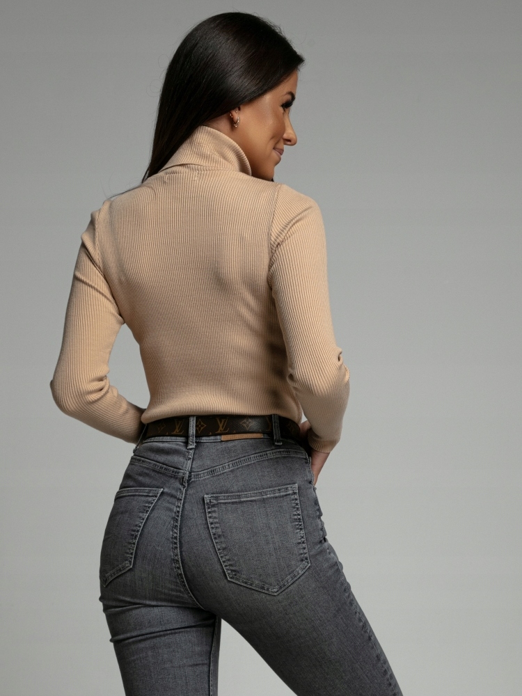 - Prążkowany sweterek z golfem. Na przodzie znajduje się naszywka z logo producenta. Wysokiej jakości elastyczny materiał