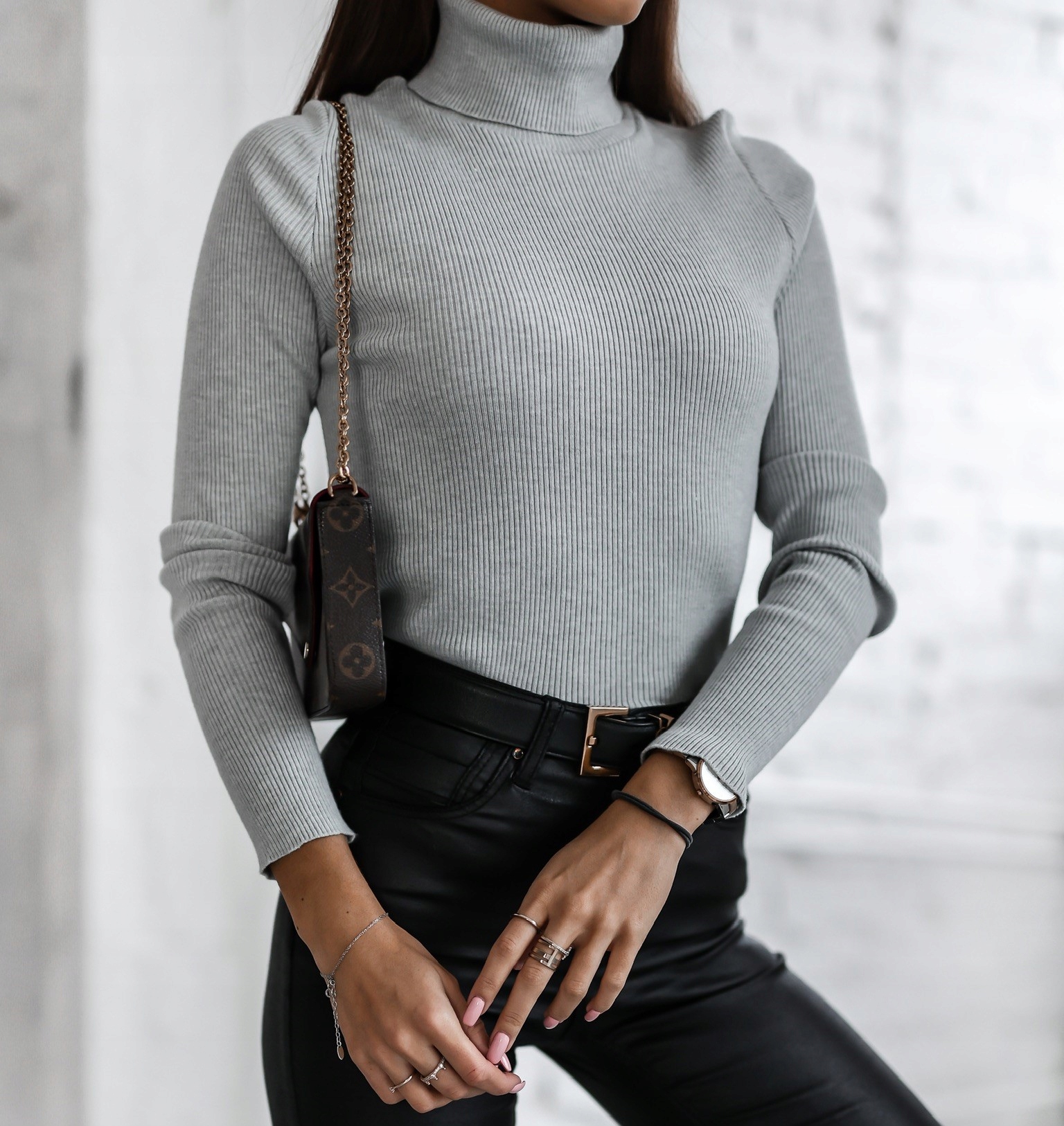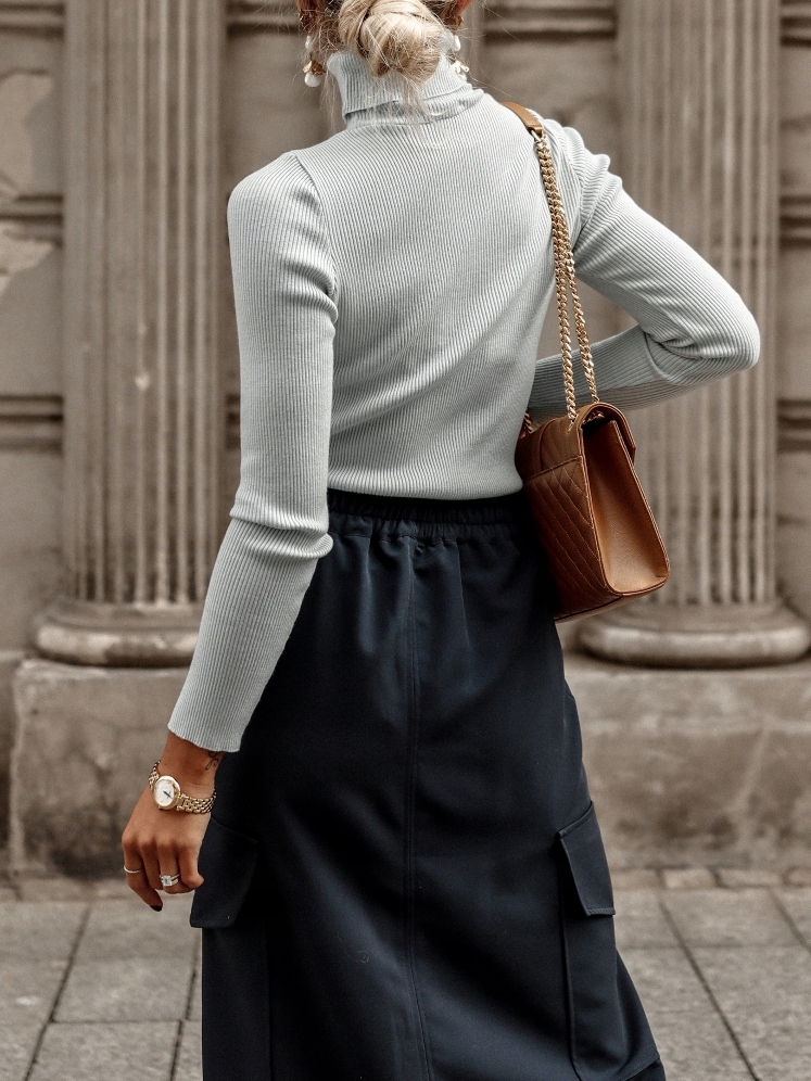 - Prążkowany sweterek z golfem. Na przodzie znajduje się naszywka z logo producenta. Wysokiej jakości elastyczny materiał