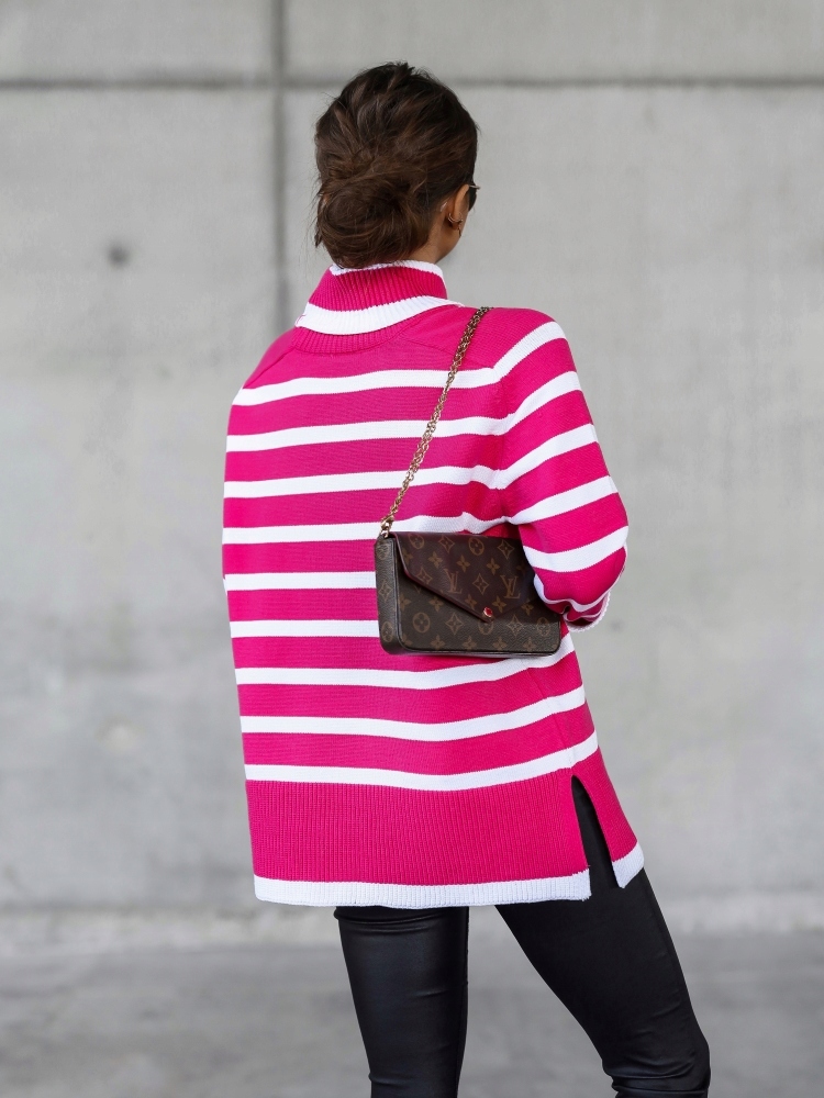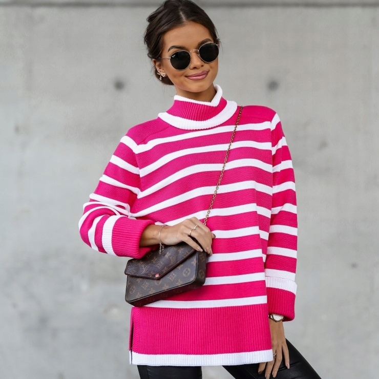 COCOMORE Sweter Golf Różowy Amarantowy + Biały Pasy
