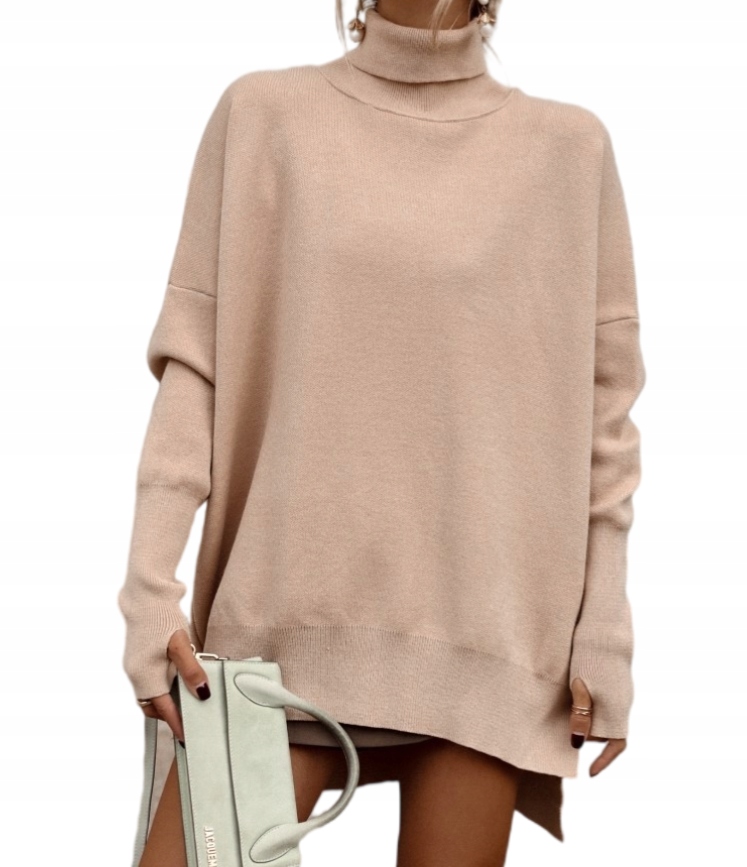 - Luźny sweter z golfem. Wykonany z miłego w dotyku materiału. Model posiada na rękawie dziurkę na kciuk. Przedłużony z tyłu. Dostępny w różnych kolorach.