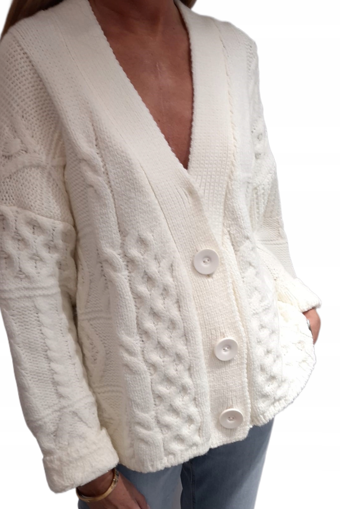 - Wyjątkowy kardigan zapinany na guziki. Mięciutki i milutki. Dodatkowym atutem jest szeroki dekolt V.