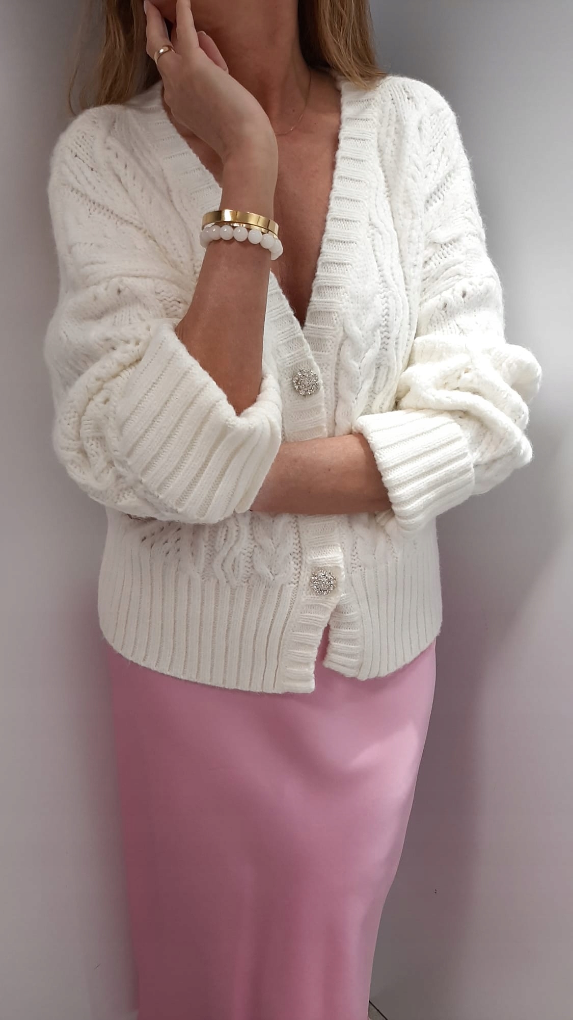 - Wyjątkowy kardigan zapinany na ozdobne guziki. Miękki i miły w dotyku