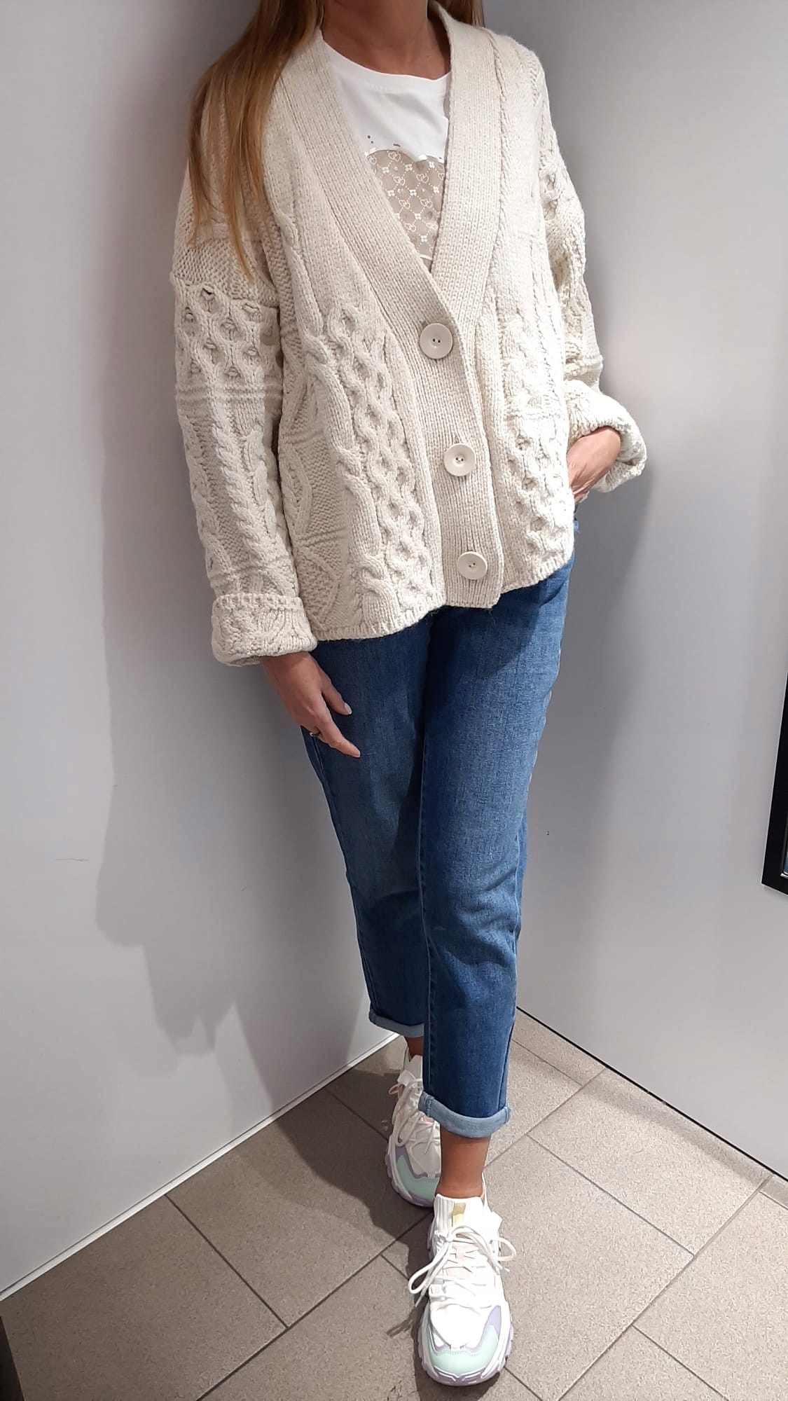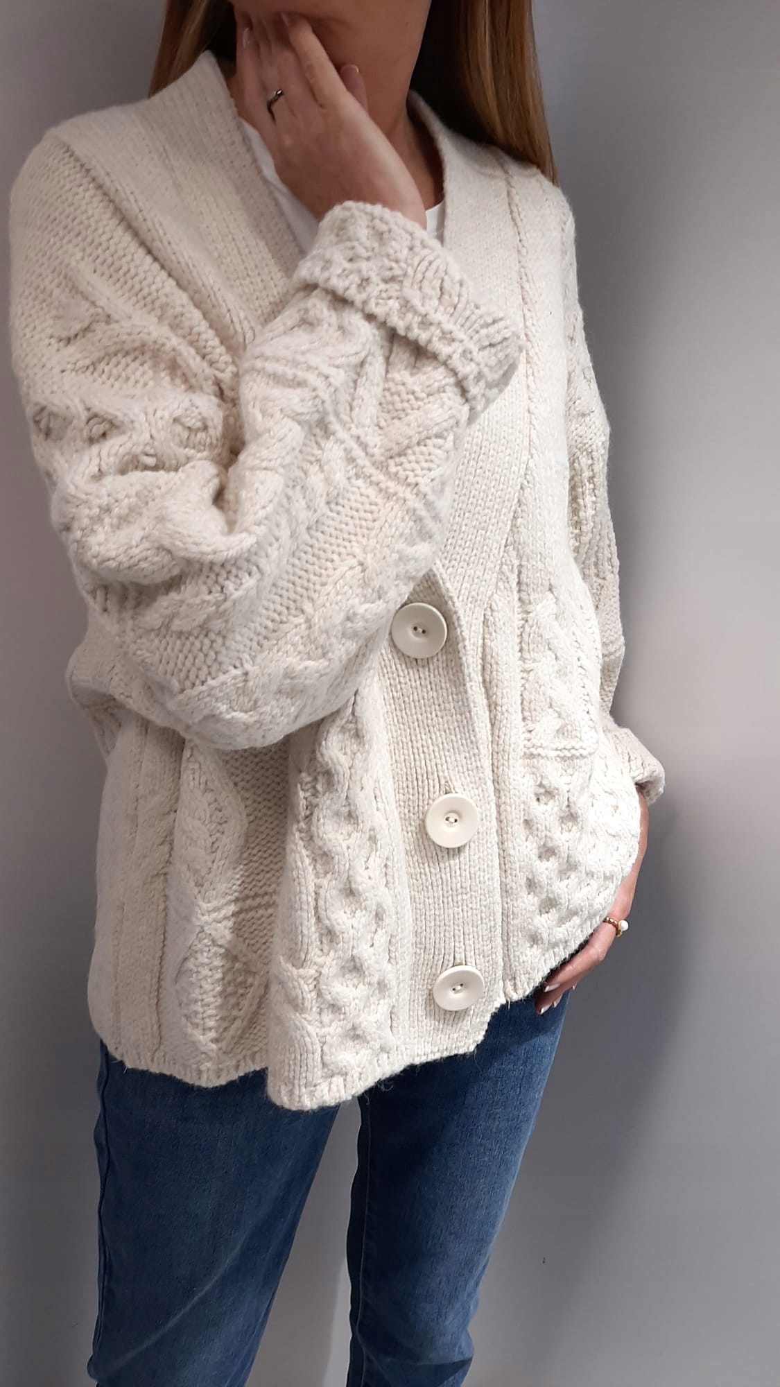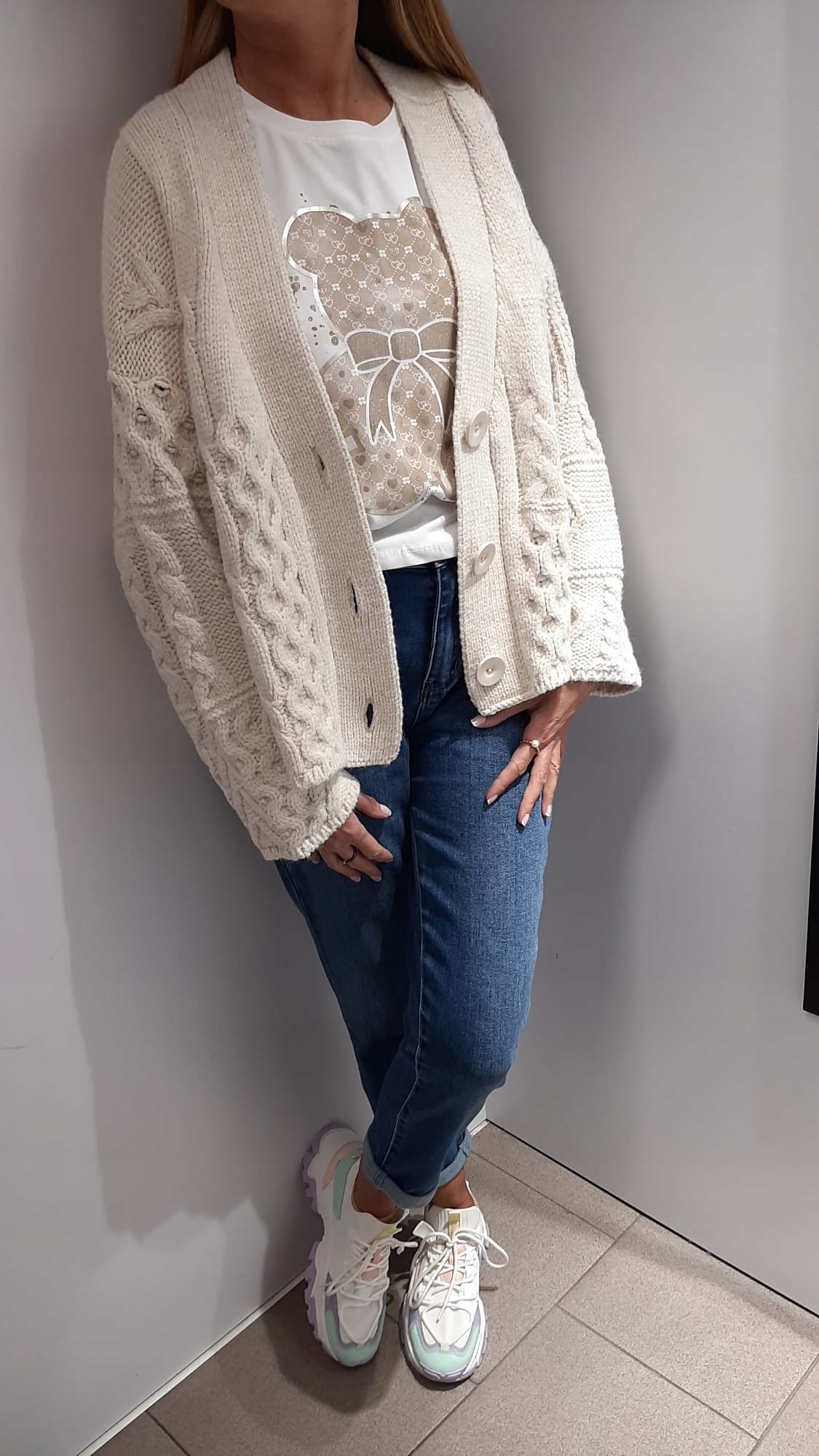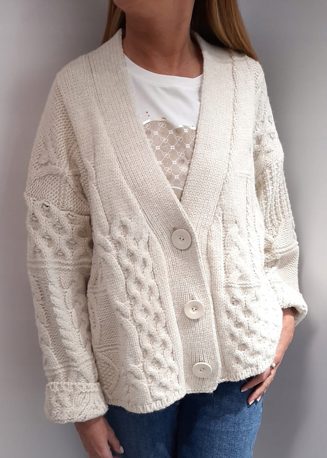 - Wyjątkowy kardigan zapinany na guziki. Mięciutki i milutki. Dodatkowym atutem jest szeroki dekolt V.