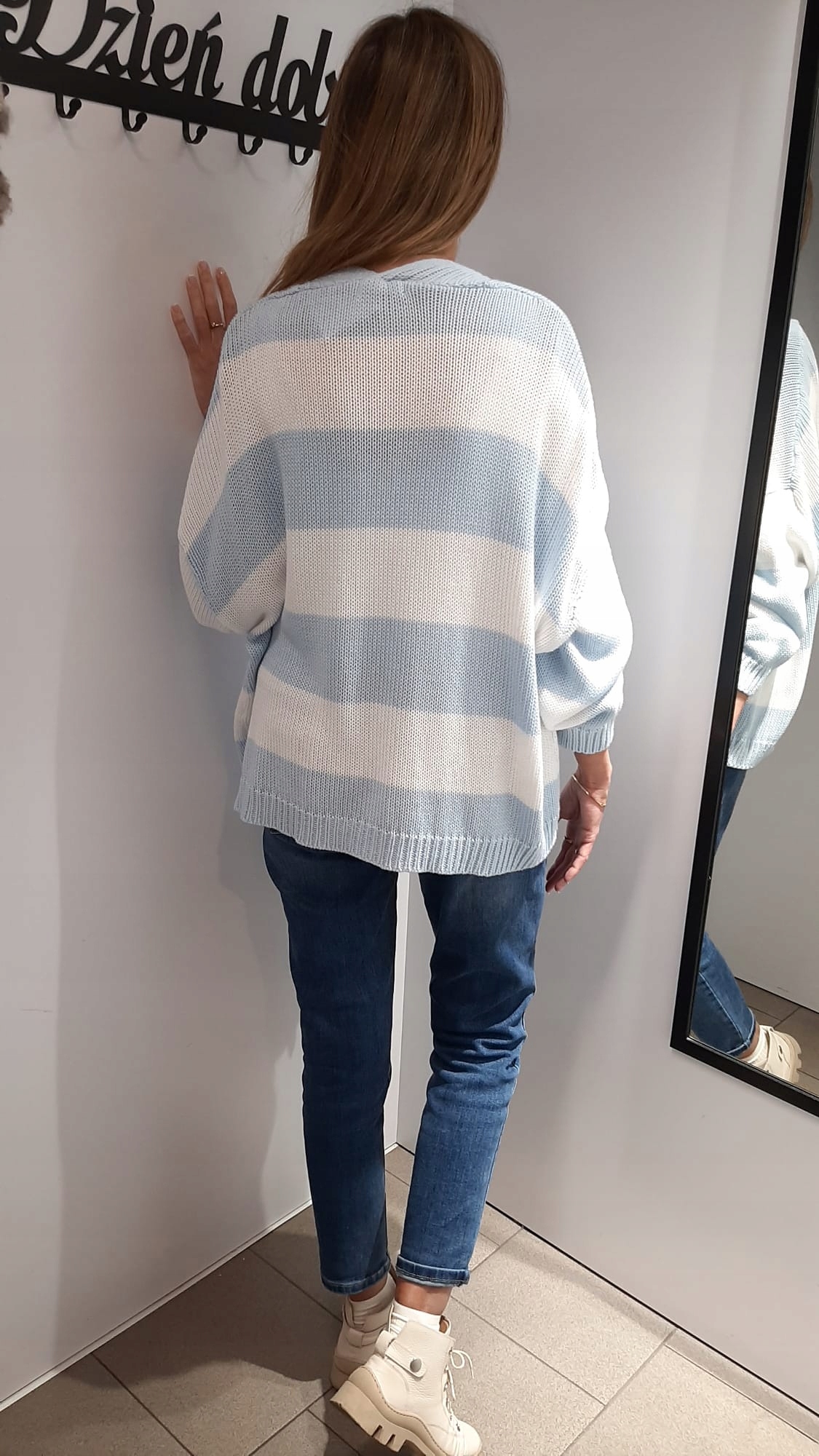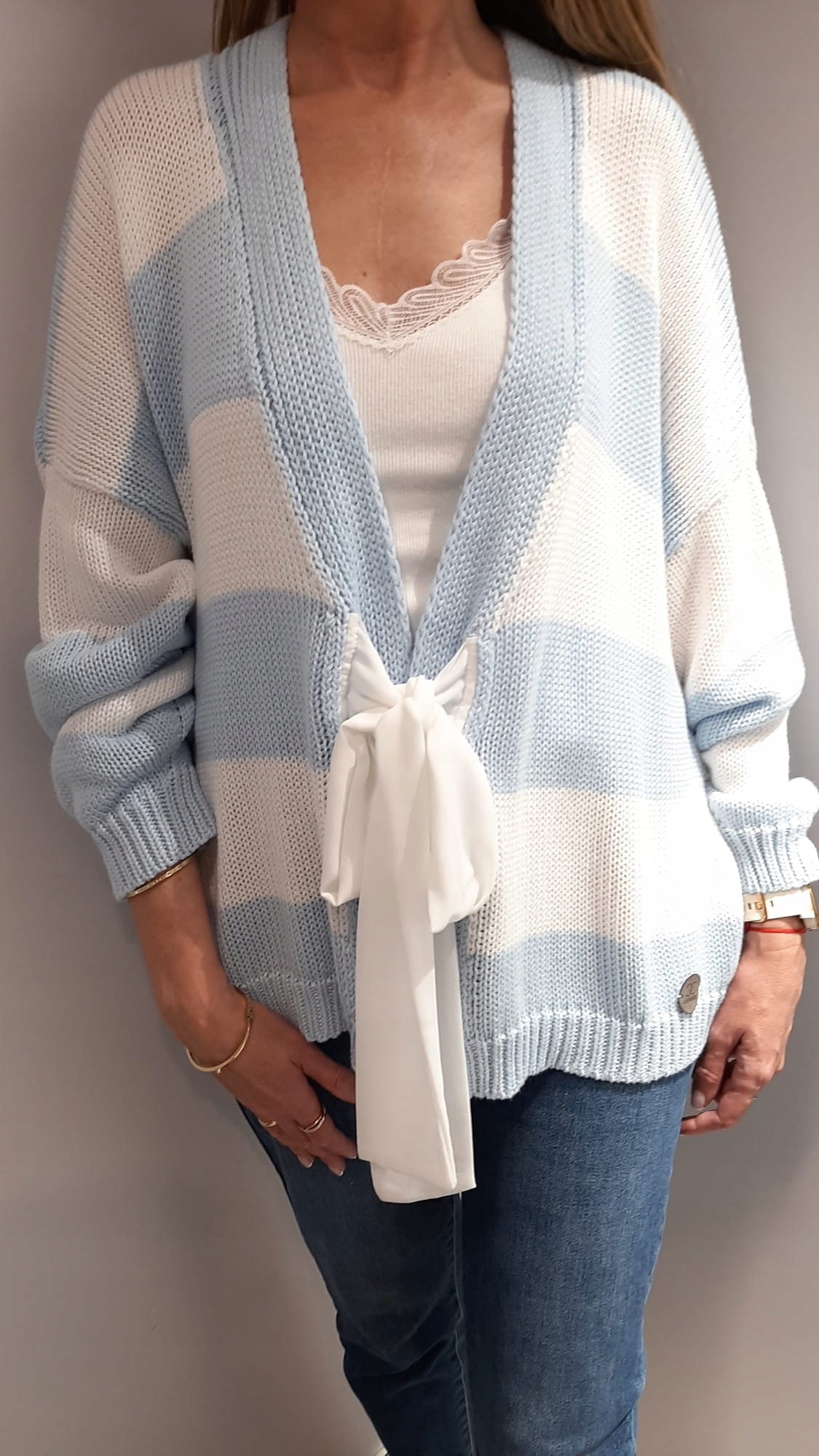 - Wyjątkowy oversize kardigan. Zapinany na ozdobne, wiązane wstążki.