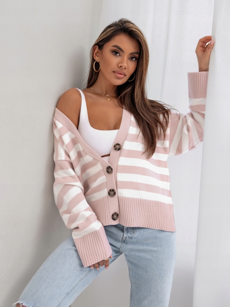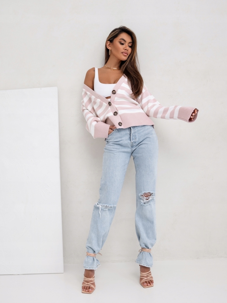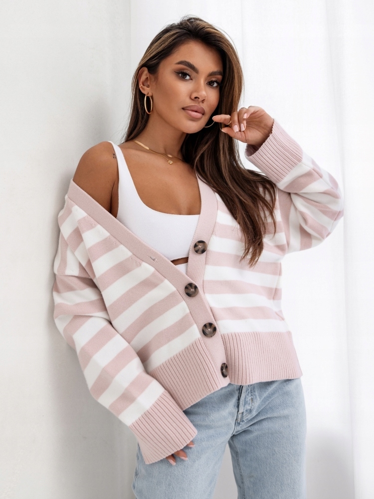 COCOMORE Sweter Kardigan w Paski Pudrowy Róż + Ecru Nowość