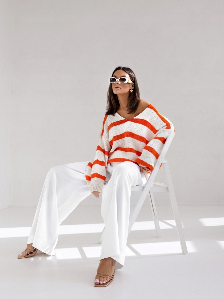 - Efektowny, sweter oversize. Wykonany z miłego w dotyku materiału. Dekolt w kształcie litery V. Szerokie bufiaste rękawy