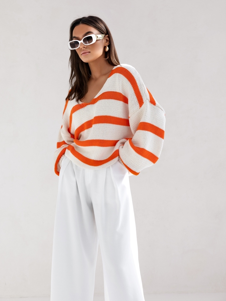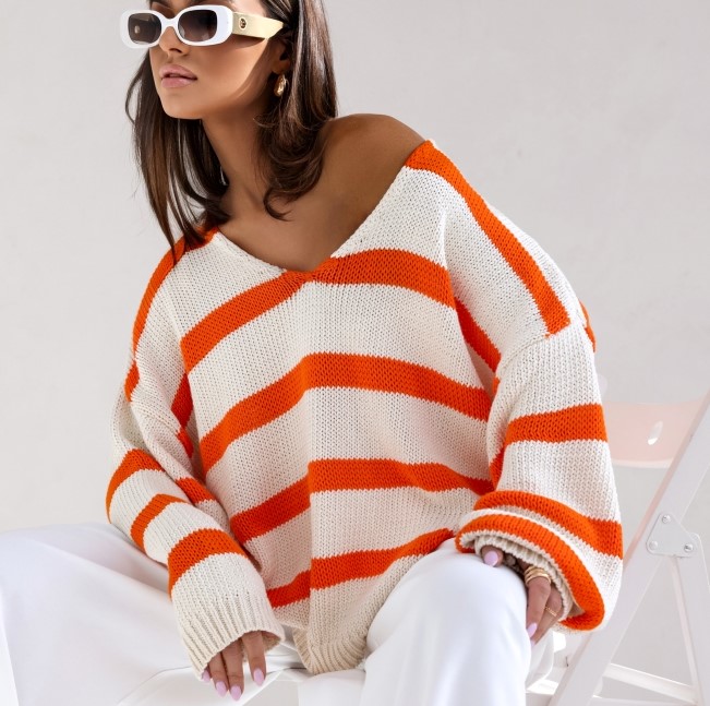 COCOMORE Sweter Oversize w Pasy Kremowy + Pomarańczowy Nowość