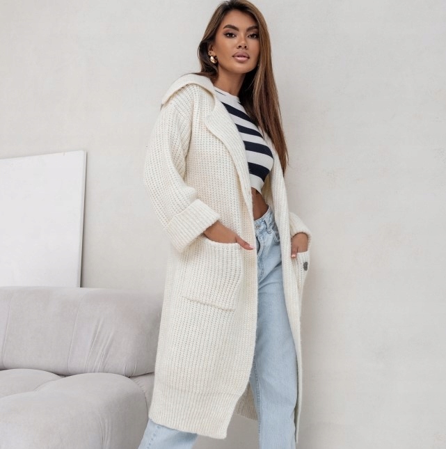 - Miała i miękka przędza, Obszerny kołnierz, Dwie duże kieszenie. Szerokie podwinięte rękawy, Zapinany na guzik